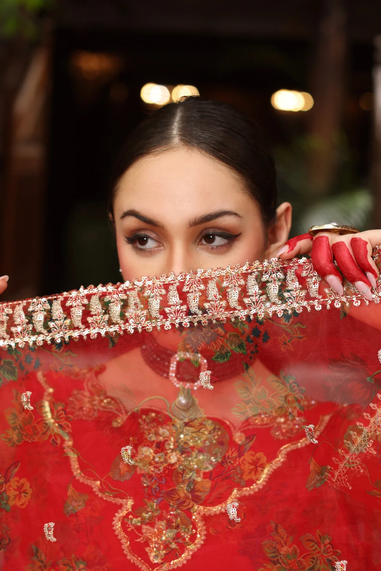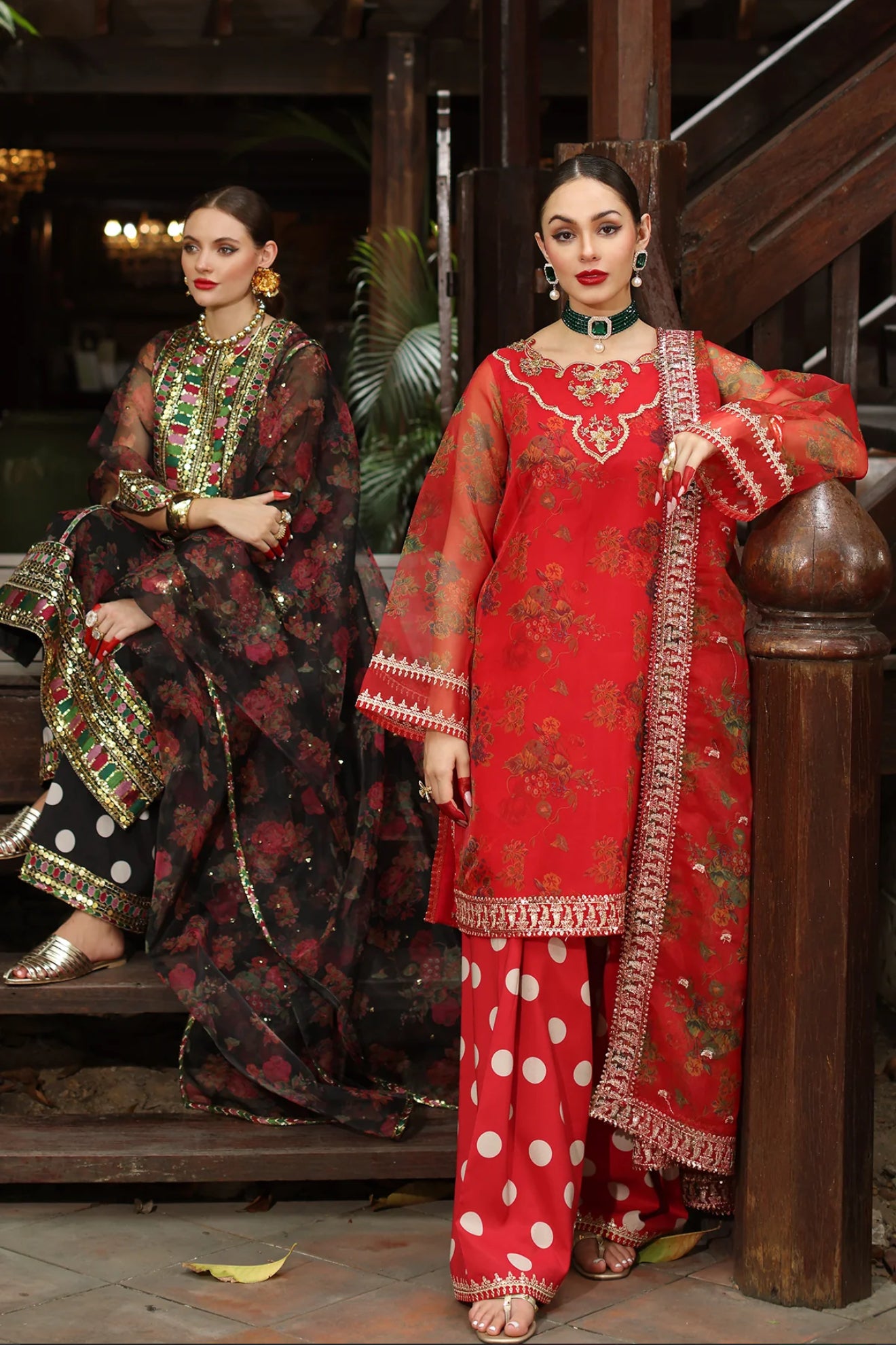 This elegant 3-piece ensemble in vibrant red features a printed shirt dupatta that adds a sophisticated layer of texture and pattern. Complemented by a playful polka dot shalwar, the outfit balances classic charm with contemporary flair. Delicate gold embroidery enhances the ensemble, providing a subtle yet luxurious touch that highlights craftsmanship and attention to detail. Ideal for special occasions, this coordinated set offers both comfort and style with a refined, expert finish.