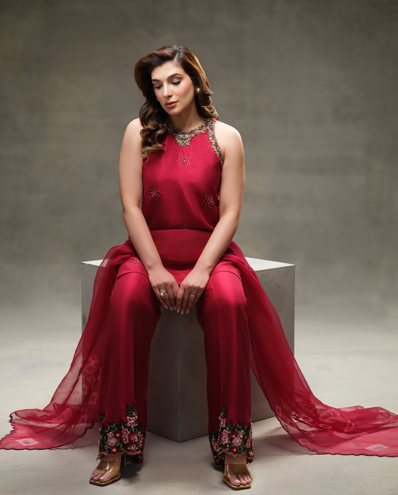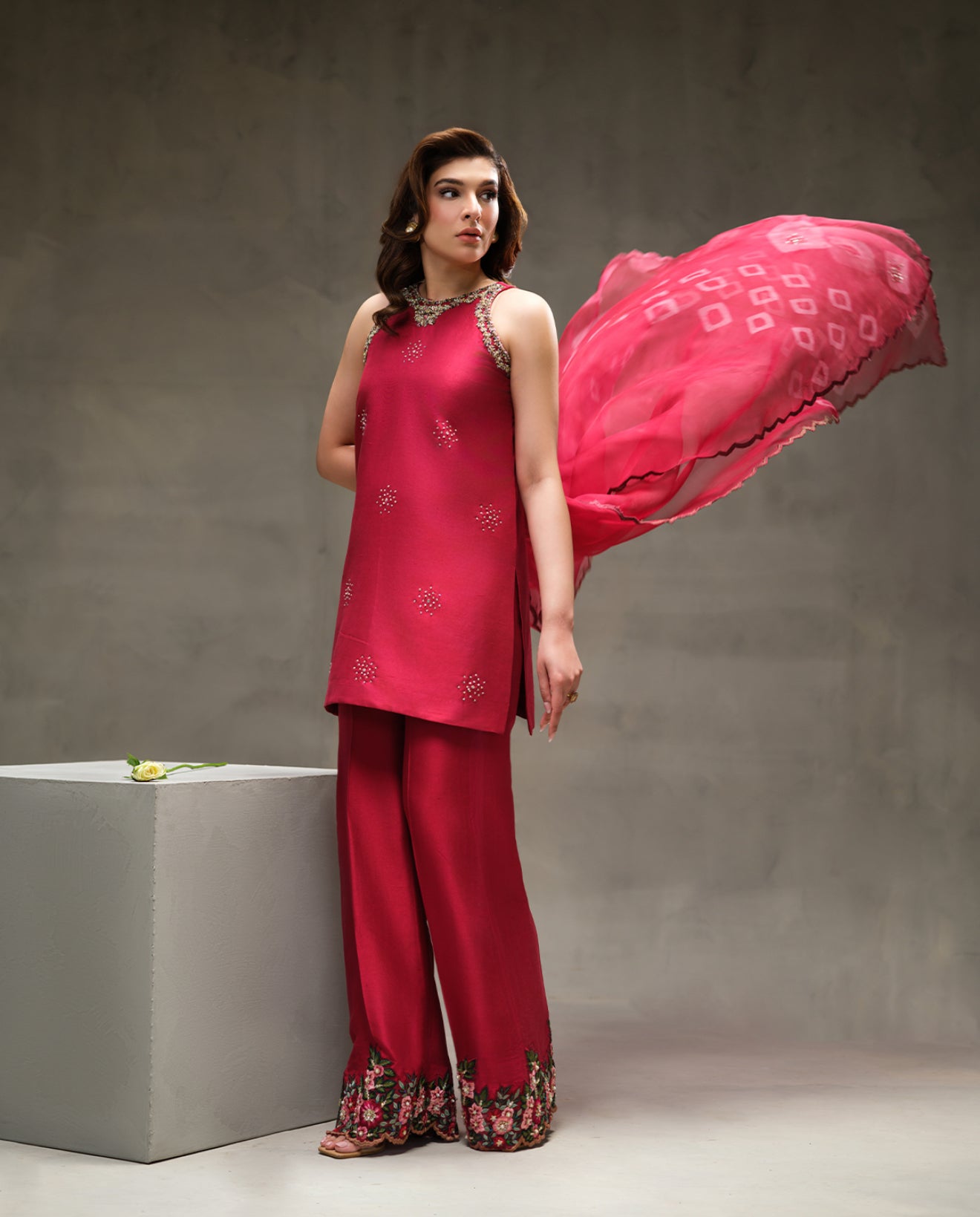 Azzuna is a stunning fusion of contemporary elegance and intricate craftsmanship. Featuring a short shirt with an altered neckline, it offers a chic, modern look perfect for any occasion. A vibrant tie-dye dupatta adds a playful, artistic touch, while Neck Ari and Adda work enhance the shirt’s exquisite embroidery with Dabki, Bethki, Phool Bethki, Pearls, Thread Knots, Sitari, and Beads. Paired with machine-embroidered culottes adorned with Adda work, Azzuna strikes the perfect balance between tradition and modern sophistication. Designed for the woman who loves to make a statement, it’s ideal for festive celebrations and stylish outings. This outfit is Sleeveless.