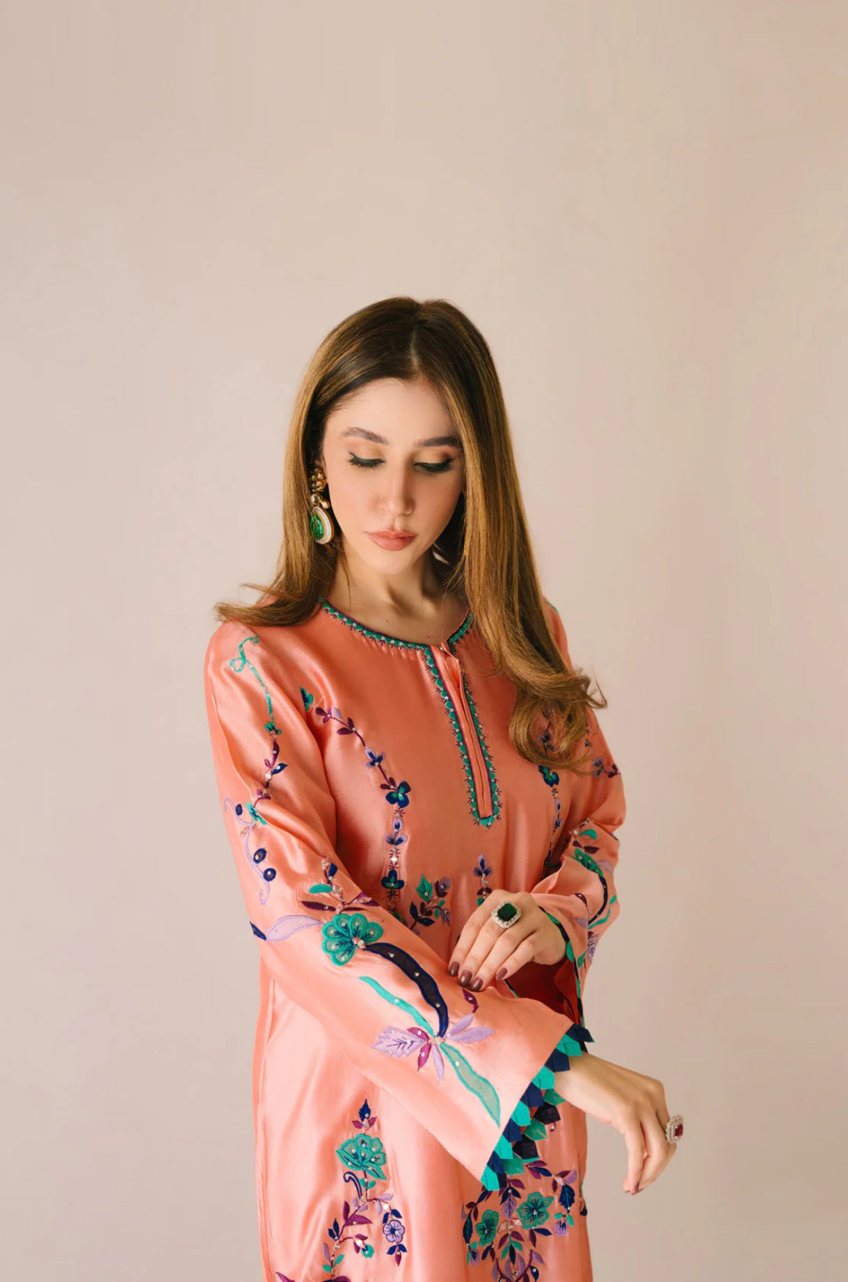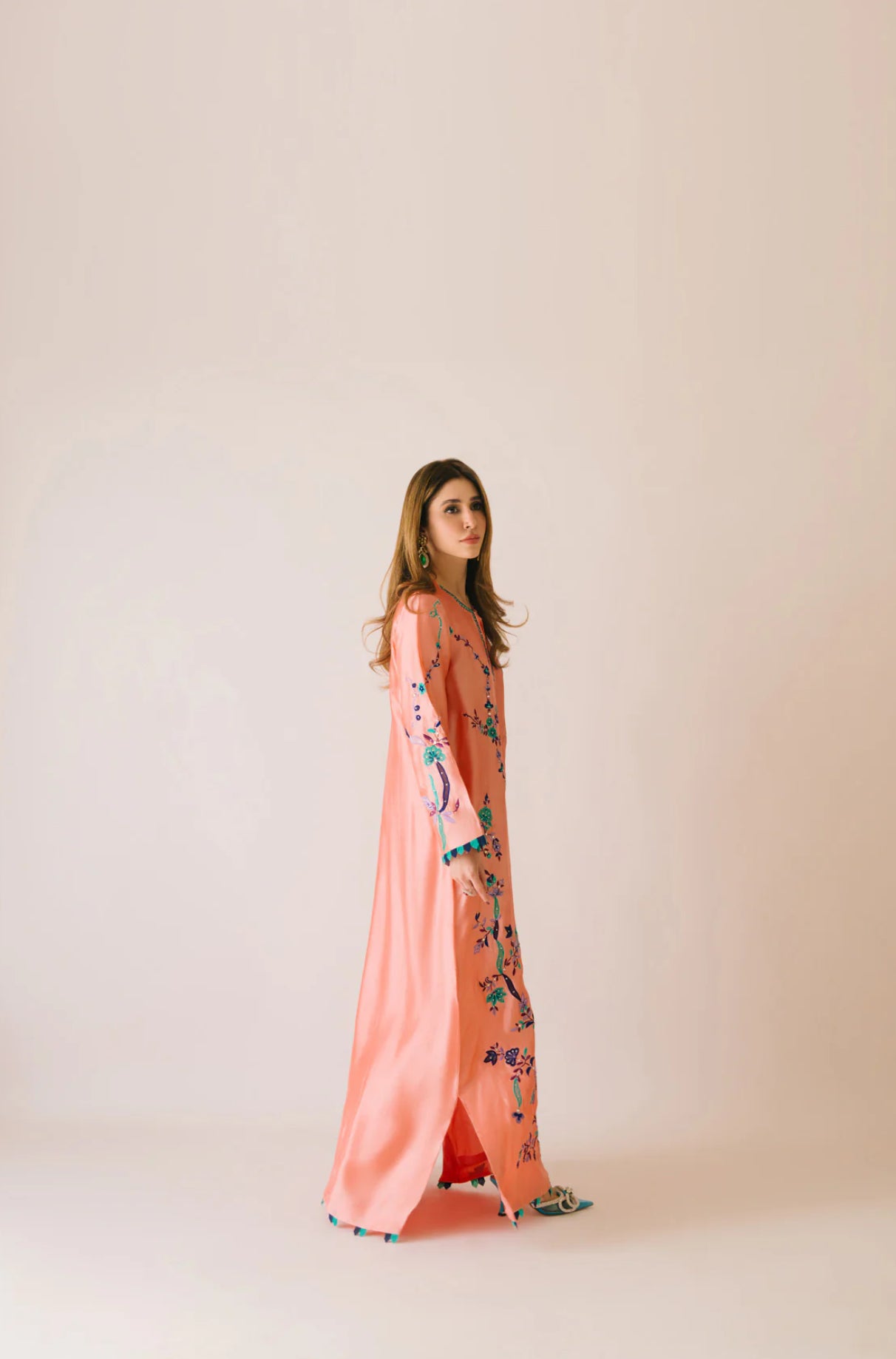 Pure sheesha silk peach long maxi shirt with multi coloured organza appliqué and embroidery all over the shirt. Finished with organza detailing on sleeves and daaman. Mirror work with embroidery detailing. Paired with pure sheesha silk capri pants.