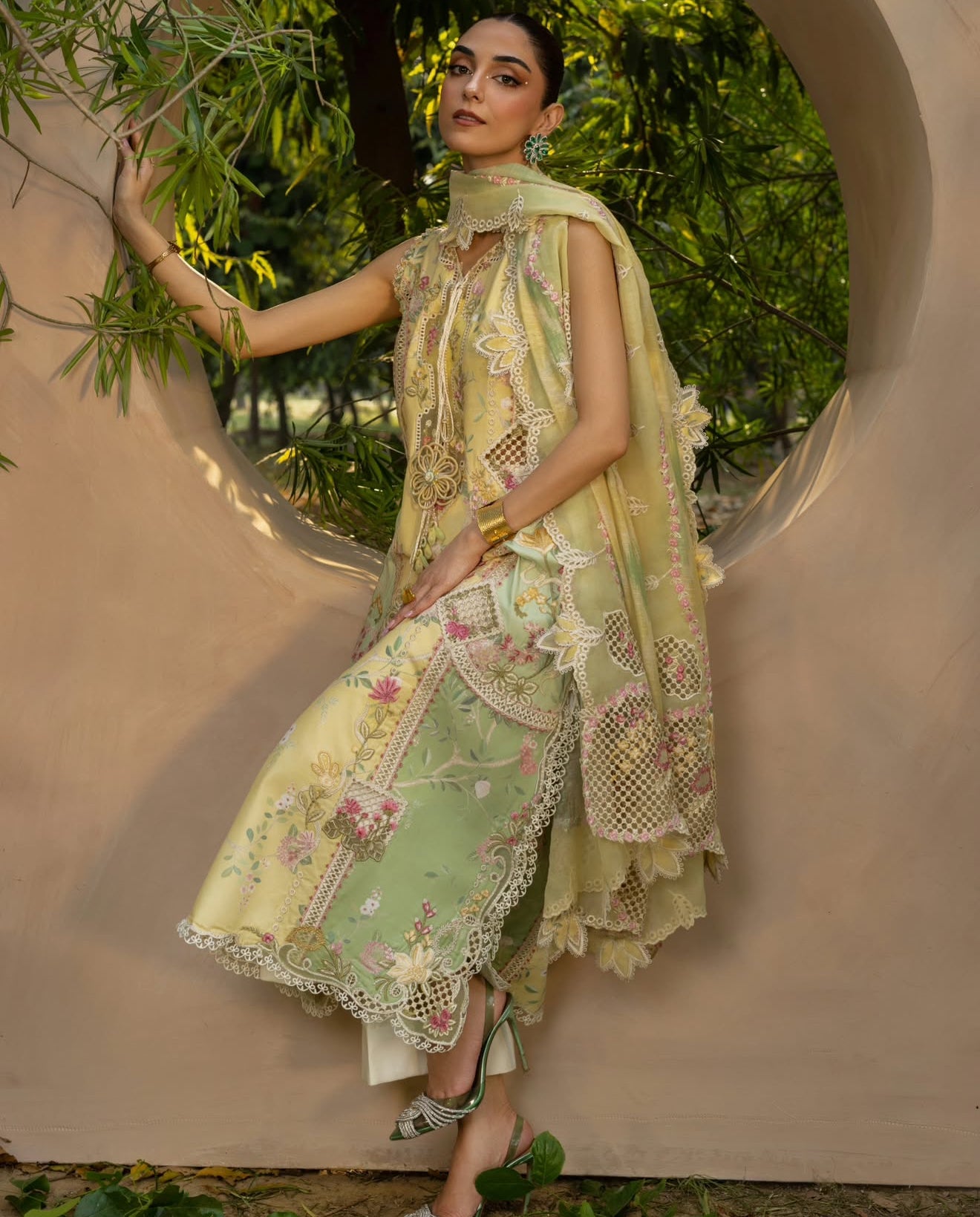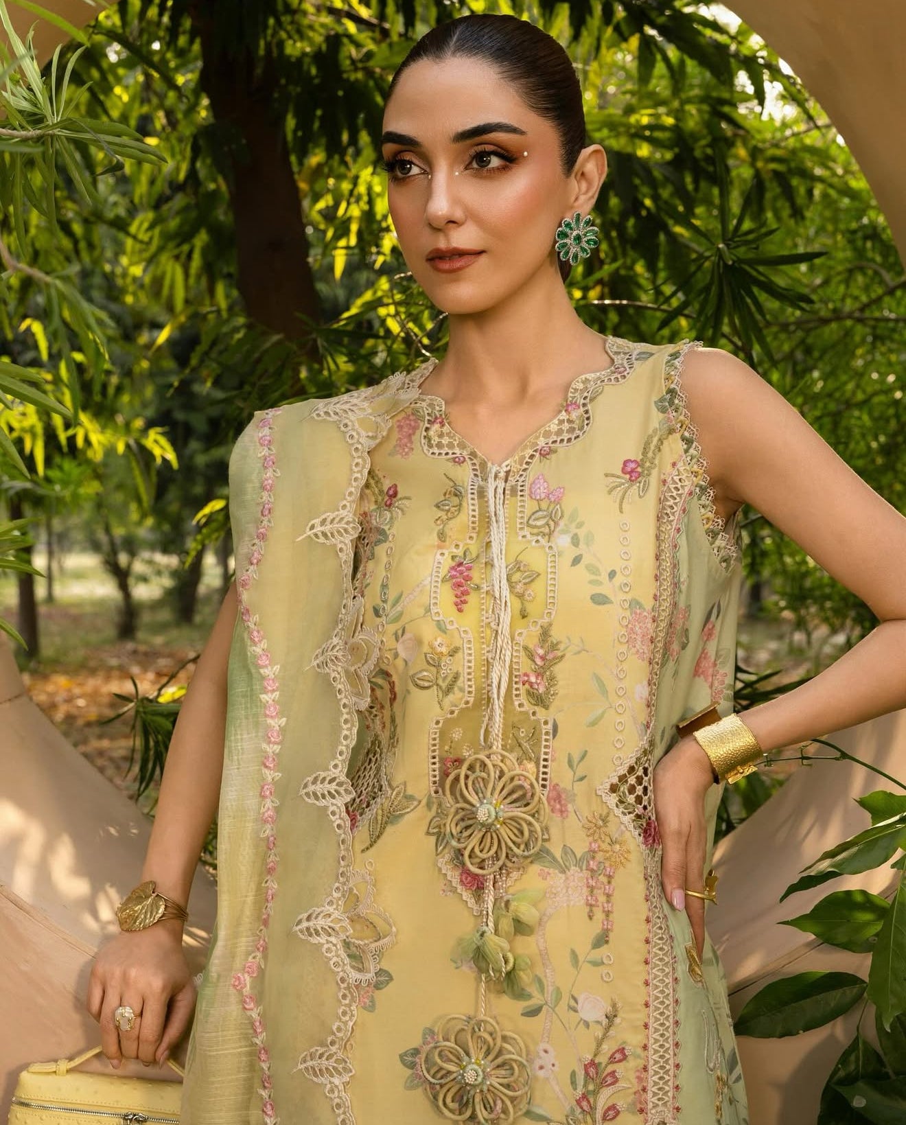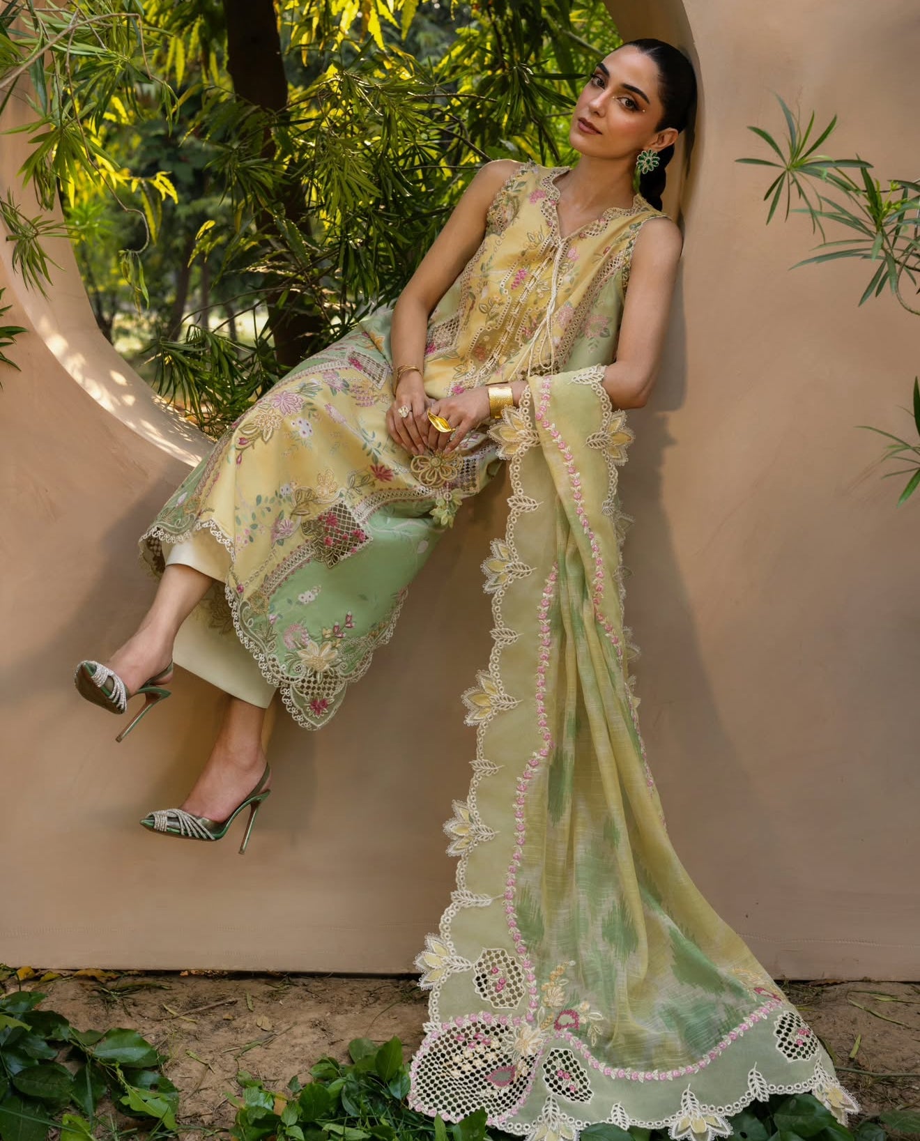 The print predicament. How could we not have print in our Luxe Lawn this year? Print is beautiful, screams summer, feminine and flirty and RAGINGLY on trend! Print but make it Luxe and wow have we delivered! (If we do say so ourselves). The minute the ever so beautiful Maya Ali walked on set in this butter yellow outfit, there was silence. Everyone stared and marvelled - the play of colors, the greens against the butter yellow, the pops of pink, the signature multicolored Crimson lace inserts, the beautiful ikat patterned dupatta, the ivory pants with pops of light yellow. Lawn never looked this perfect!