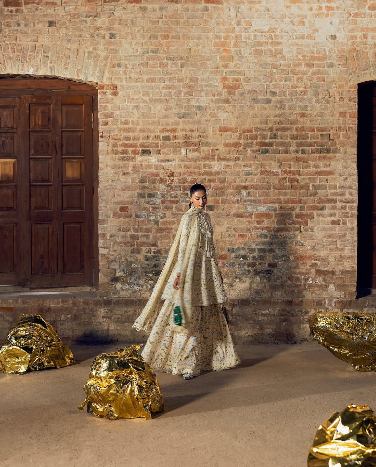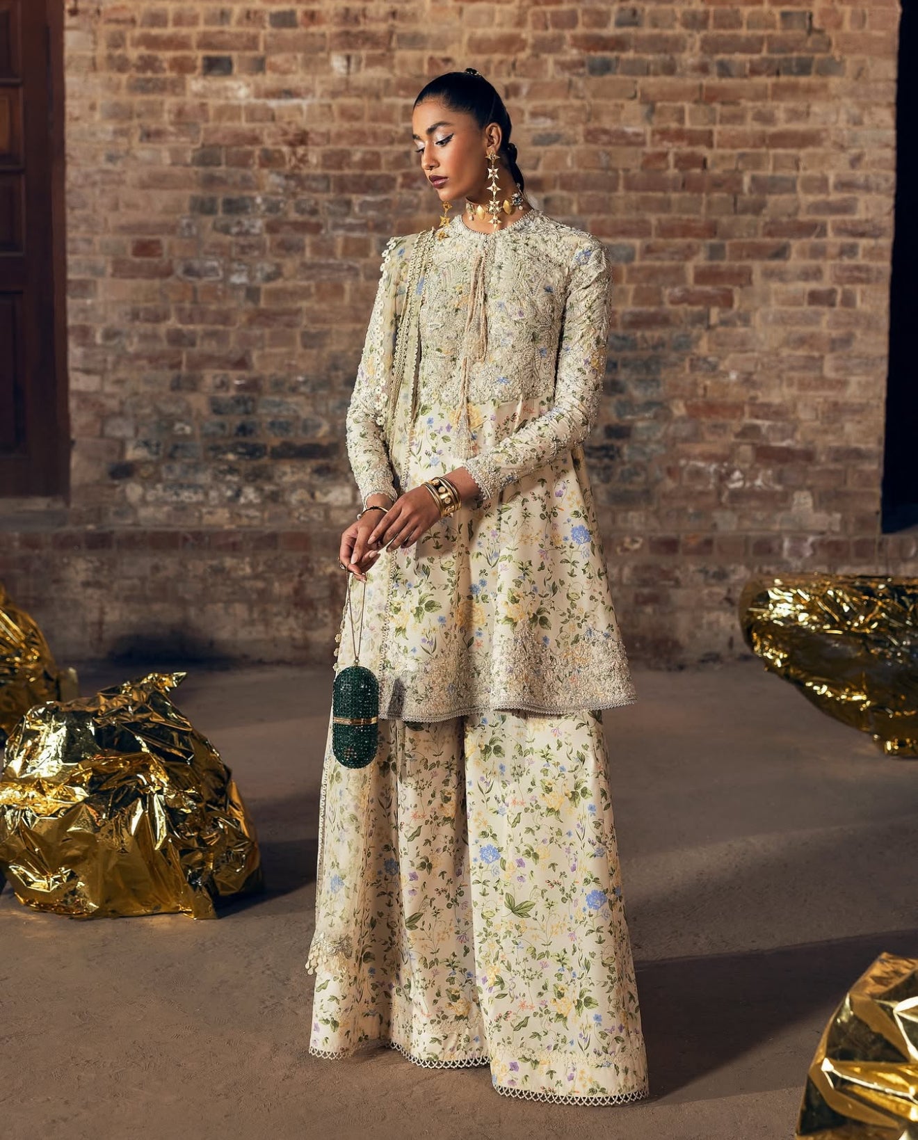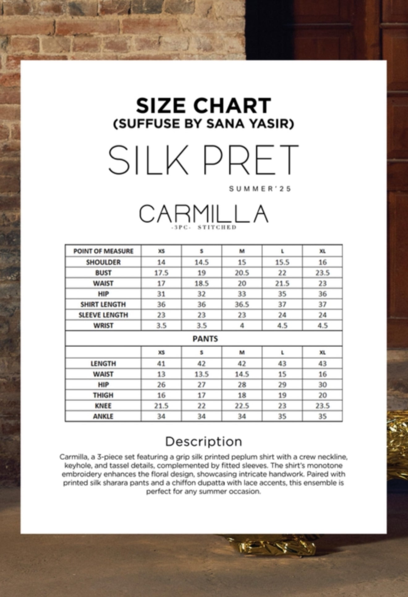Carmilla, a 3-piece set featuring a grip silk printed peplum shirt with a crew neckline, keyhole, and tassel details, complemented by fitted sleeves. The shirt's monotone embroidery enhances the floral design, showcasing intricate handwork. Paired with printed silk sharara pants and a chiffon dupatta with lace accents, this ensemble is perfect for any summer occasion.