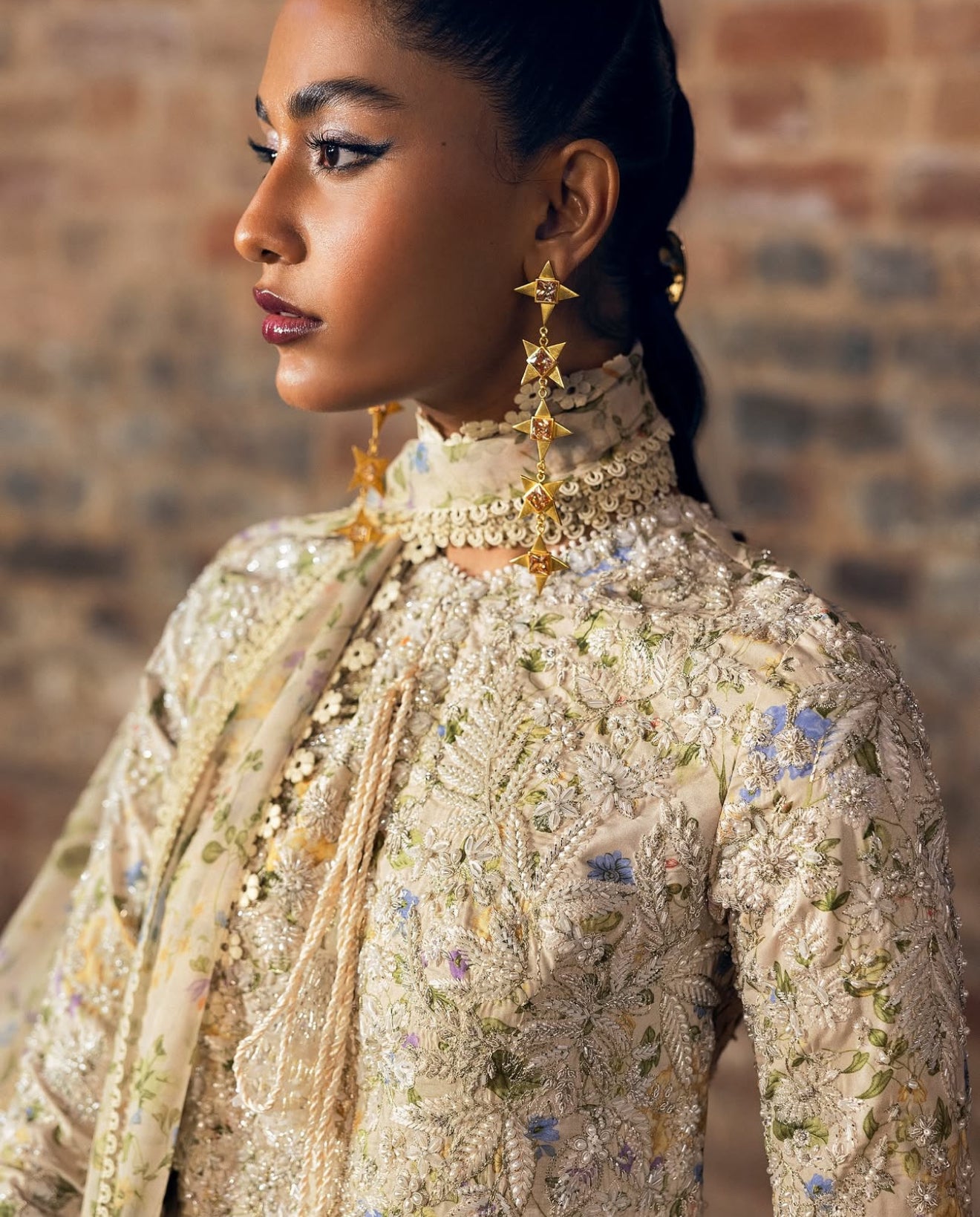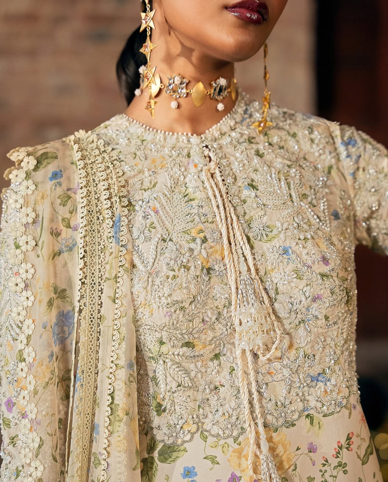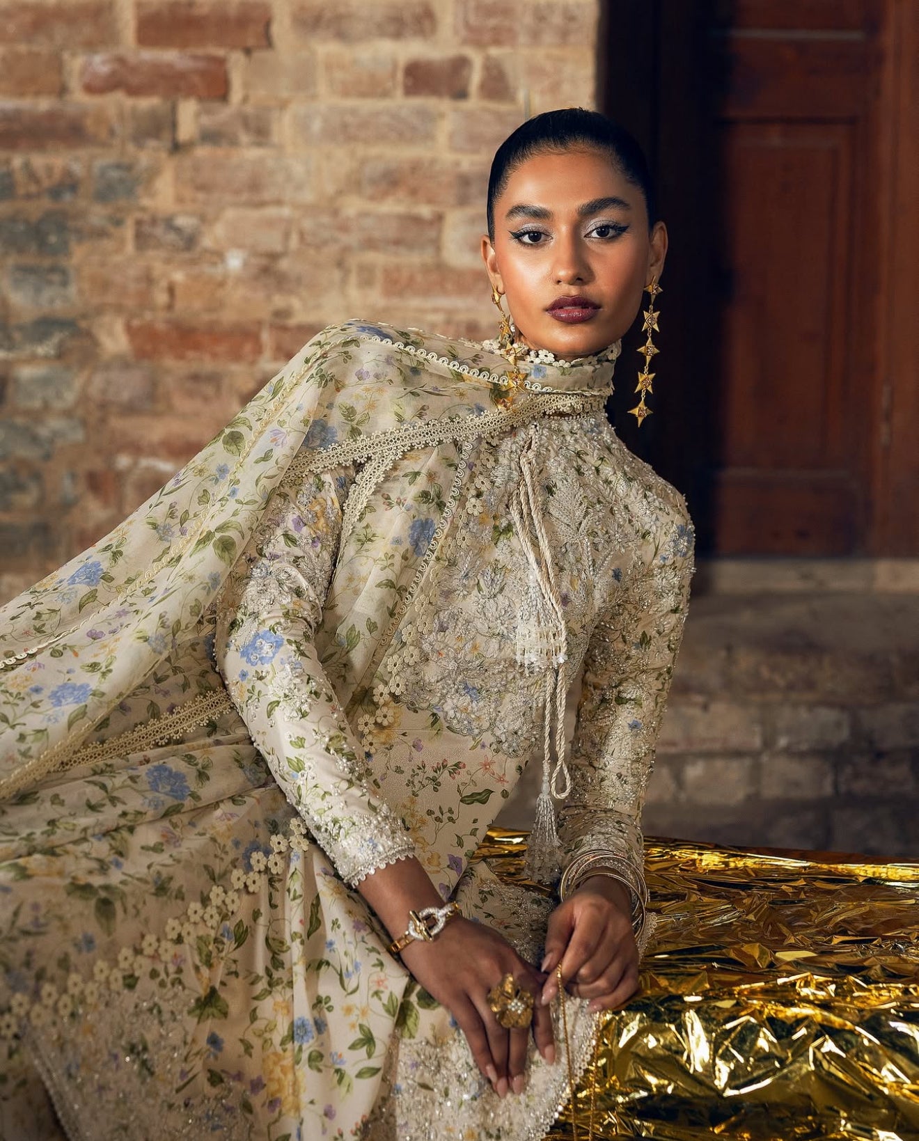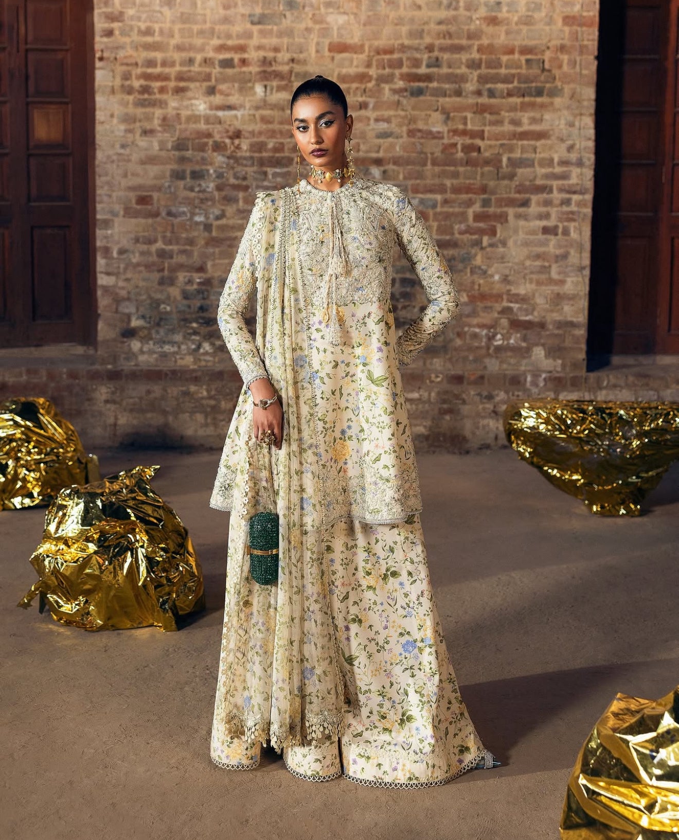 Carmilla, a 3-piece set featuring a grip silk printed peplum shirt with a crew neckline, keyhole, and tassel details, complemented by fitted sleeves. The shirt's monotone embroidery enhances the floral design, showcasing intricate handwork. Paired with printed silk sharara pants and a chiffon dupatta with lace accents, this ensemble is perfect for any summer occasion.