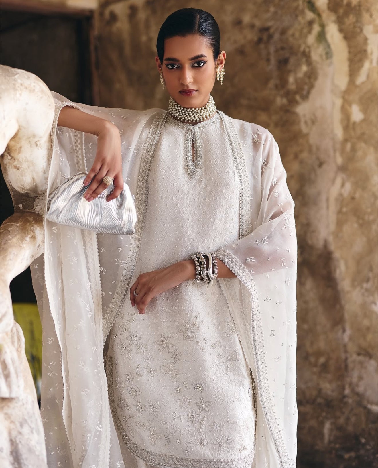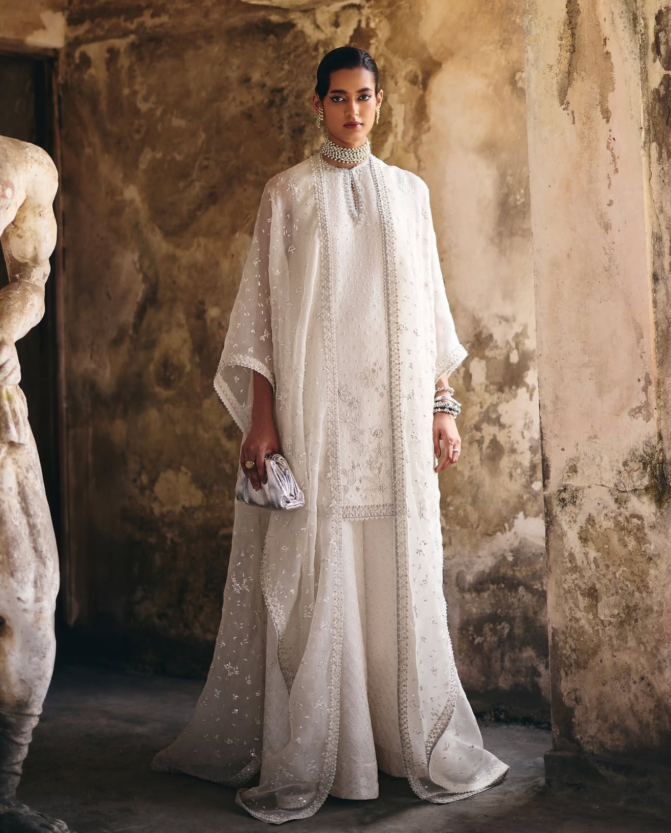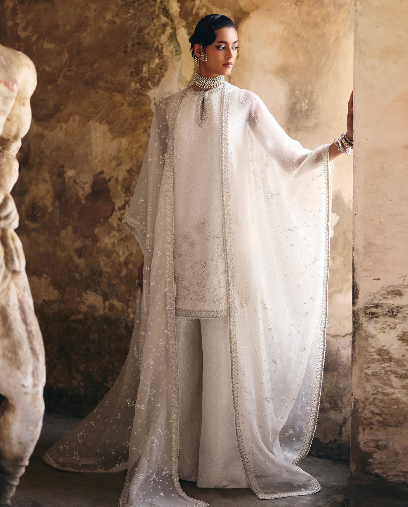 Prepare to elevate your summer wardrobe with a stunning three-piece ensemble in Ethereal White, featuring a silk short shirt with a rounded hem and a keyhole neckline that seamlessly transitions into a crew neck; embellished with intricate floral decorations for a textured allure, complemented by wide azaar pants showcasing an all-over self-texture, and a luxurious organza cape adorned with precious silver ornamentation and a heavy four-sided border that adds a touch of elegance.