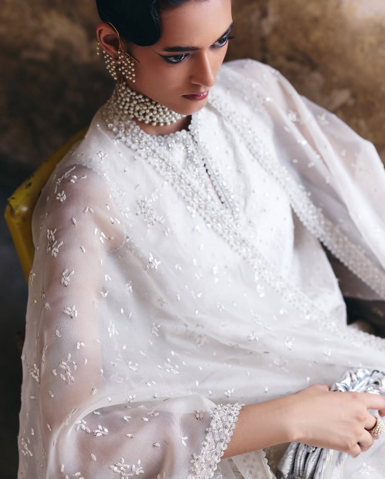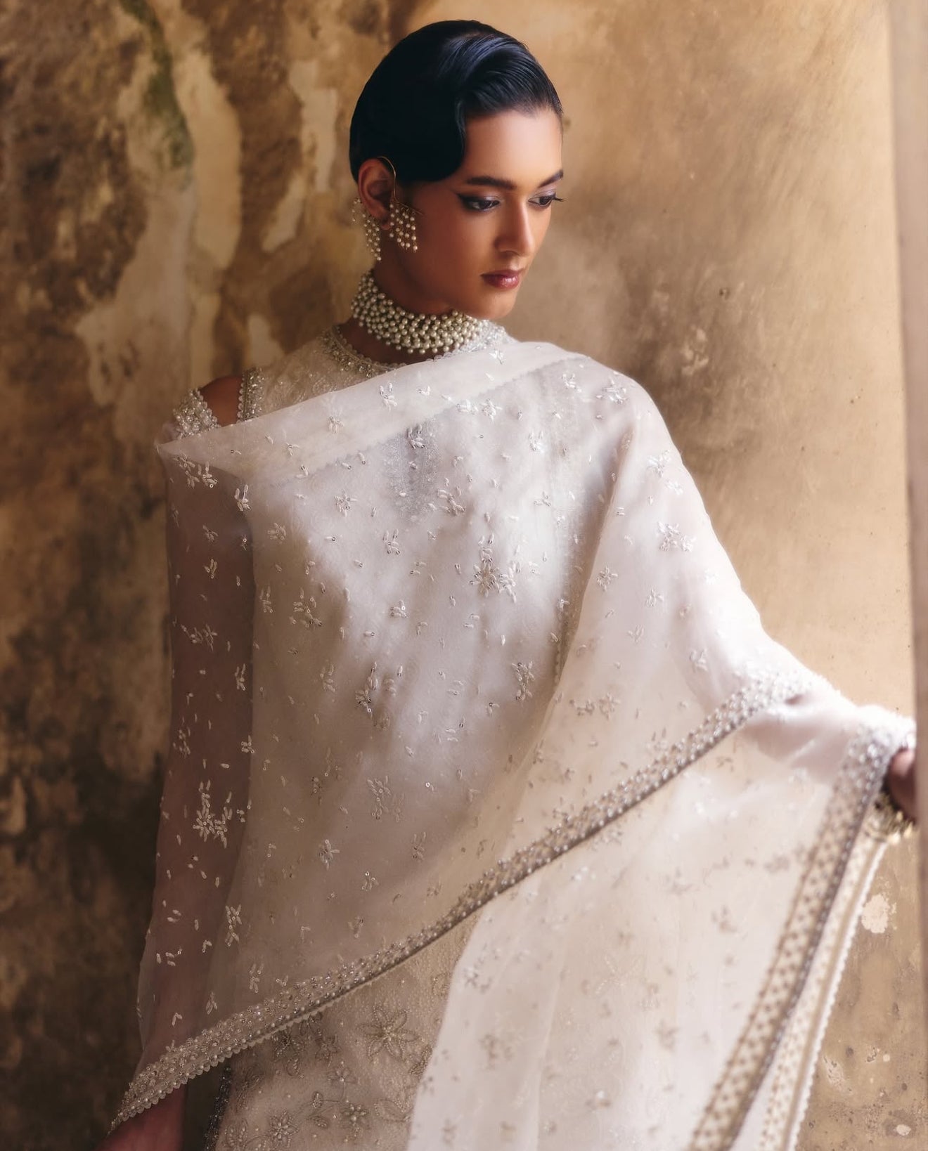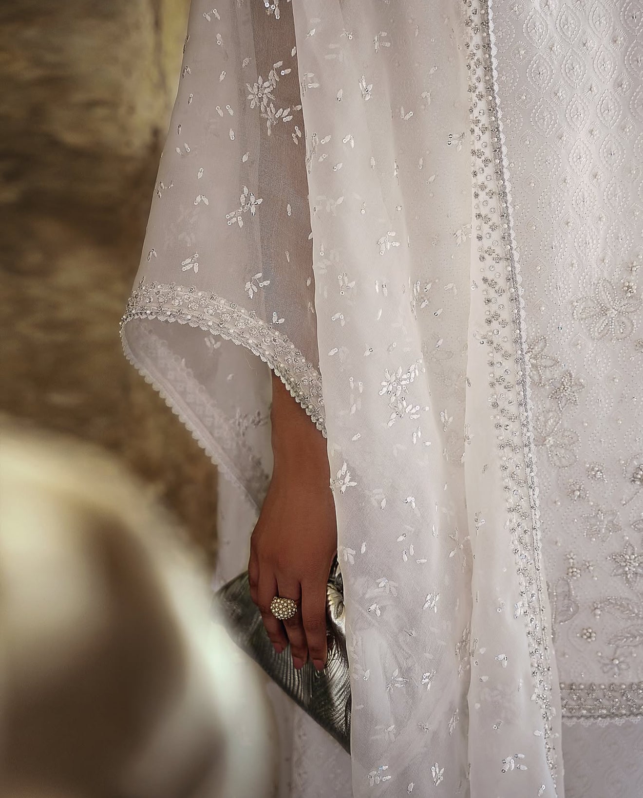 Prepare to elevate your summer wardrobe with a stunning three-piece ensemble in Ethereal White, featuring a silk short shirt with a rounded hem and a keyhole neckline that seamlessly transitions into a crew neck; embellished with intricate floral decorations for a textured allure, complemented by wide azaar pants showcasing an all-over self-texture, and a luxurious organza cape adorned with precious silver ornamentation and a heavy four-sided border that adds a touch of elegance.
