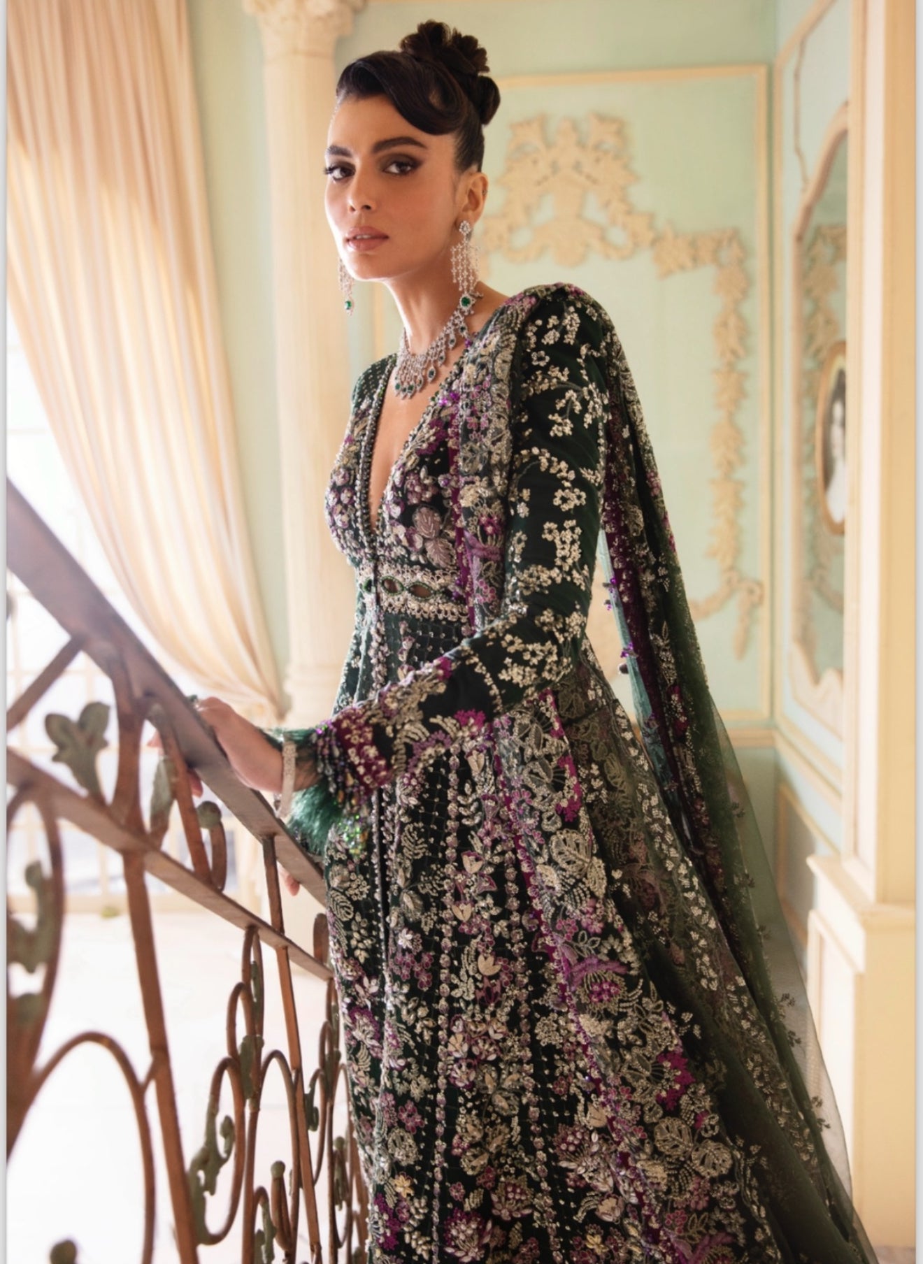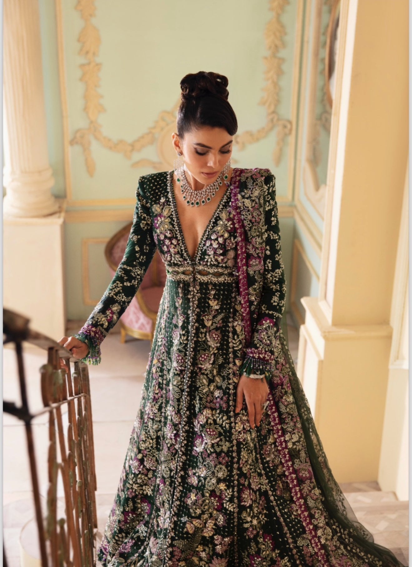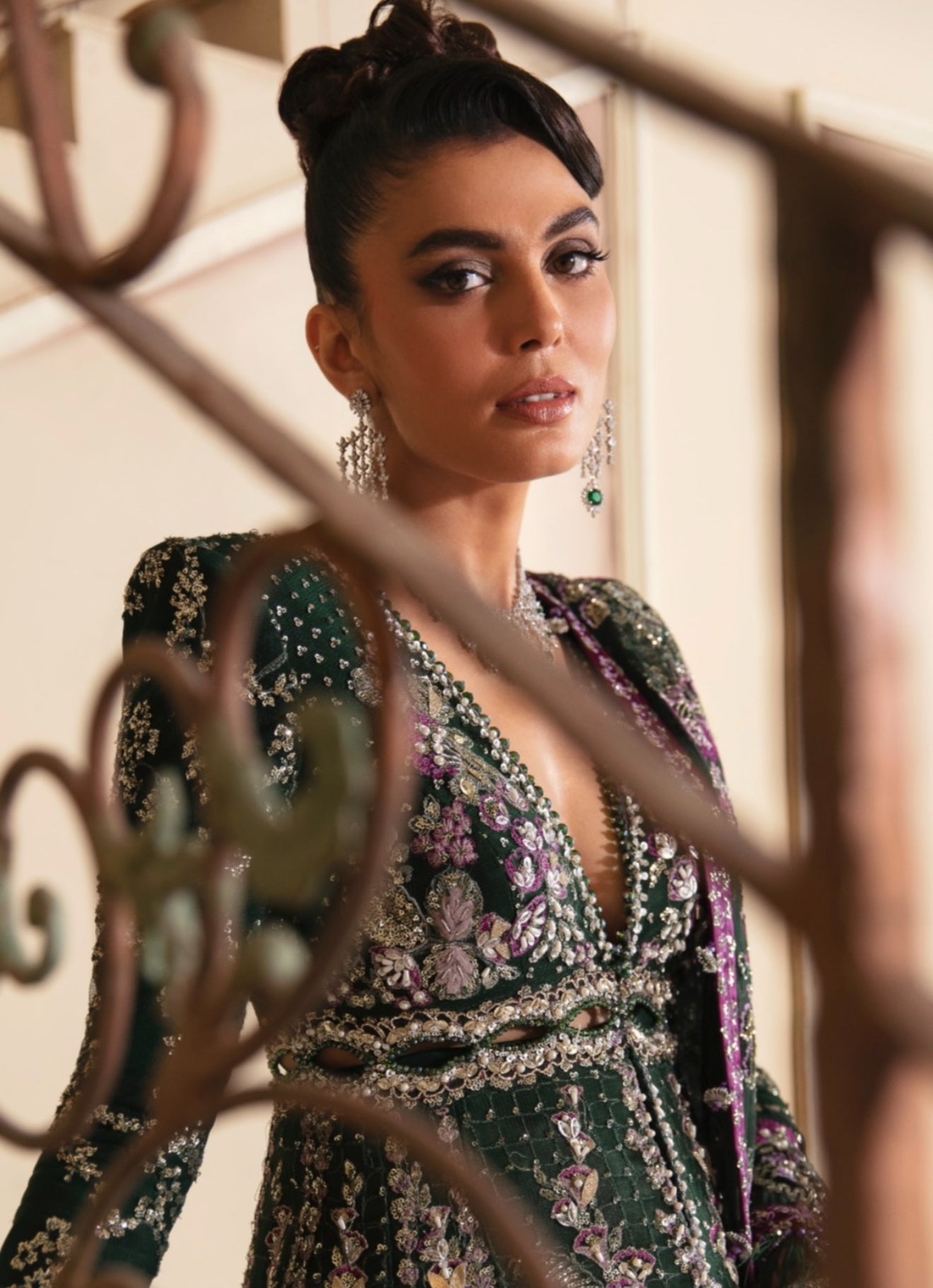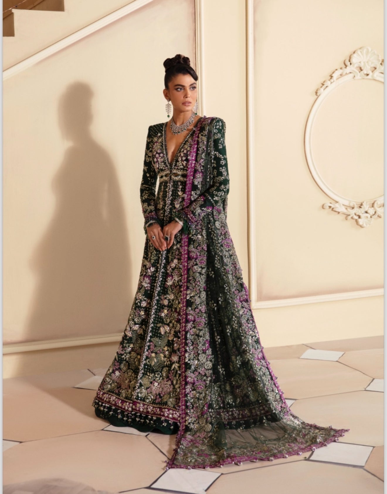 This emerald Anarkali net outfit features intricate bead, pearl, and sequin embellishments that add sophisticated shimmer and texture. The flowing silhouette is paired with a straight pant that compliments the delicate net fabric. An equally adorned net dupatta completes the ensemble, offering a harmonious balance of elegance and detailed craftsmanship, perfect for formal occasions.