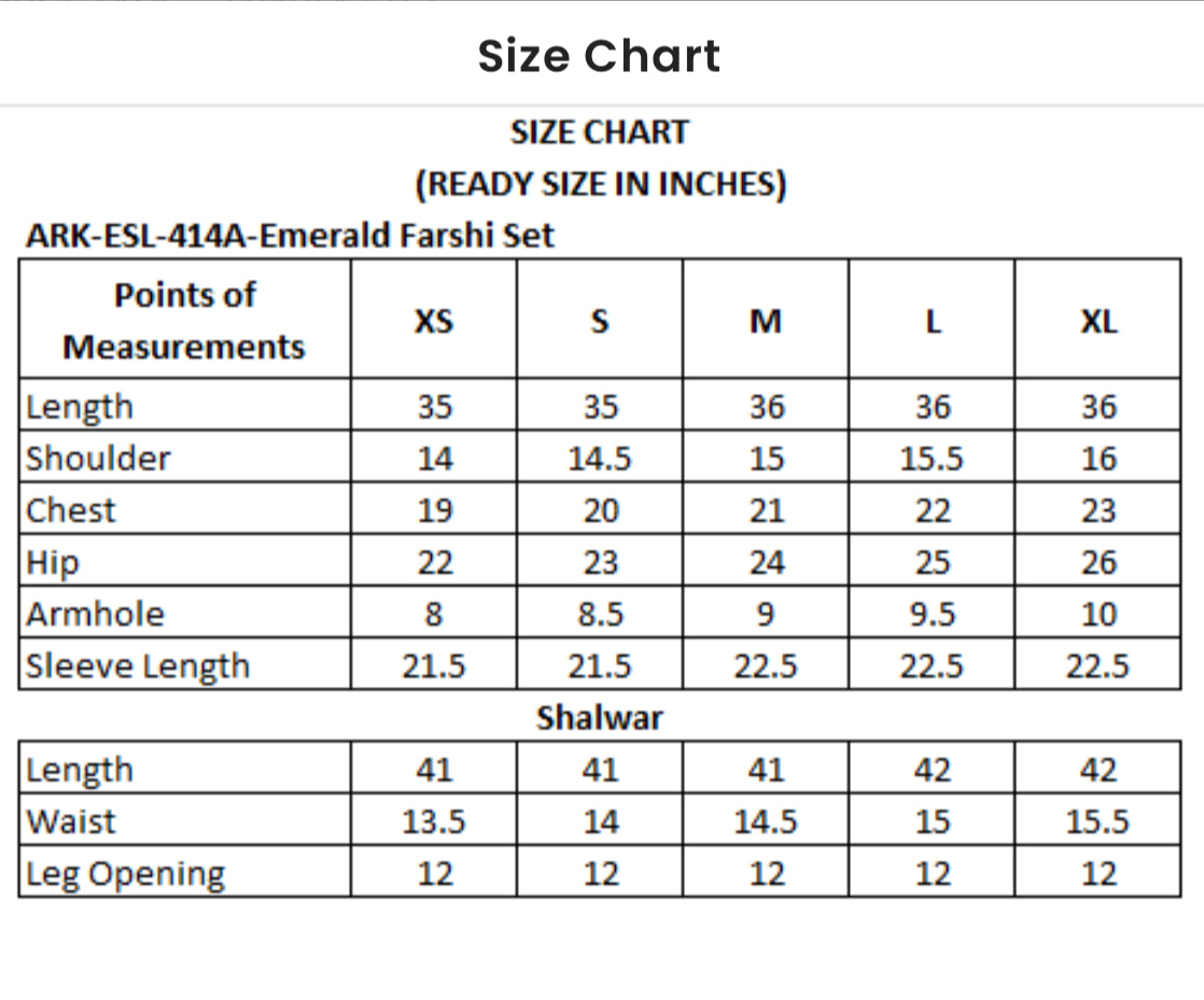 Let's get you into the seasons craze: Emerald Farshi Set! An embroidered short shirt and signature farshi shalwar are enhanced by a medium silk dupatta featuring meticulously embroidered patches. Perfect choice for your summer gatherings.