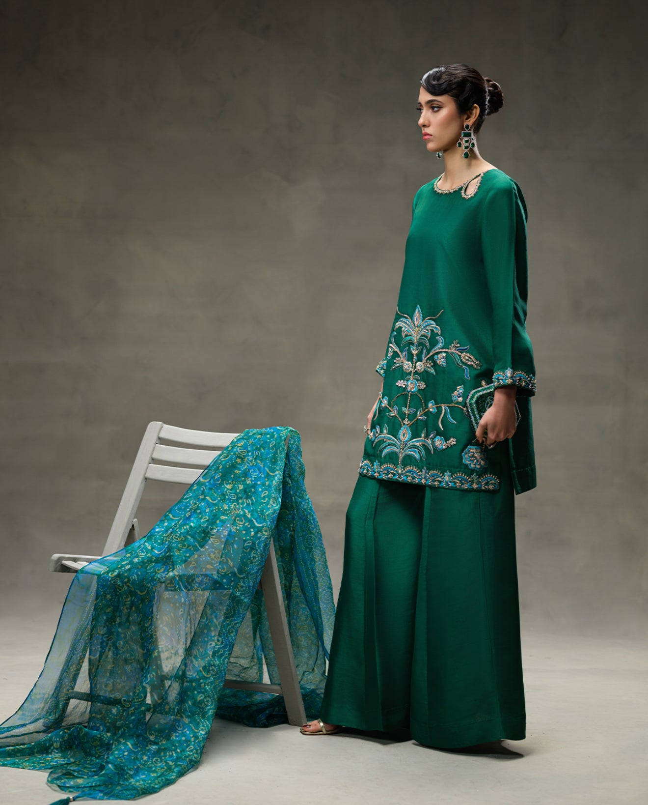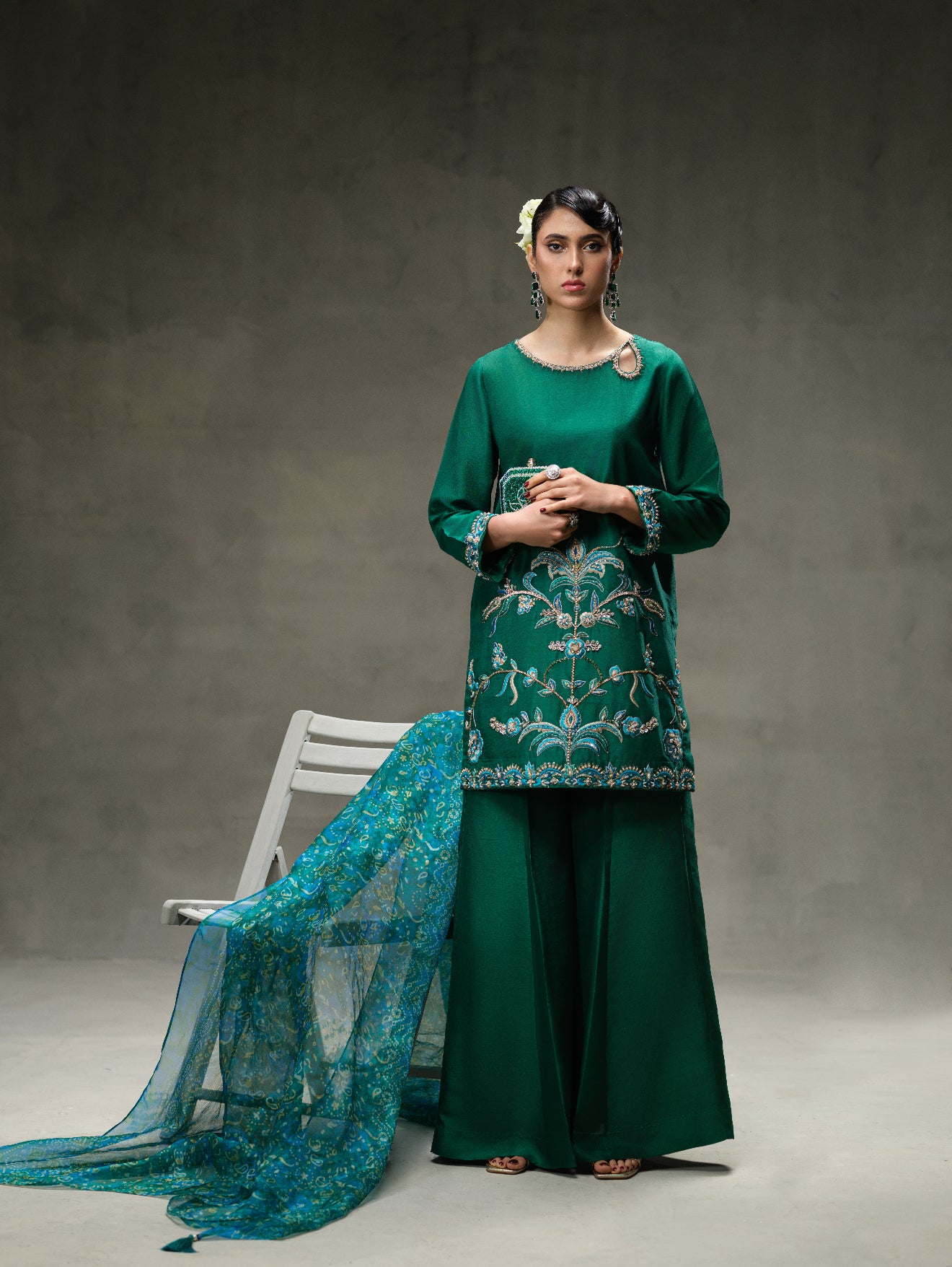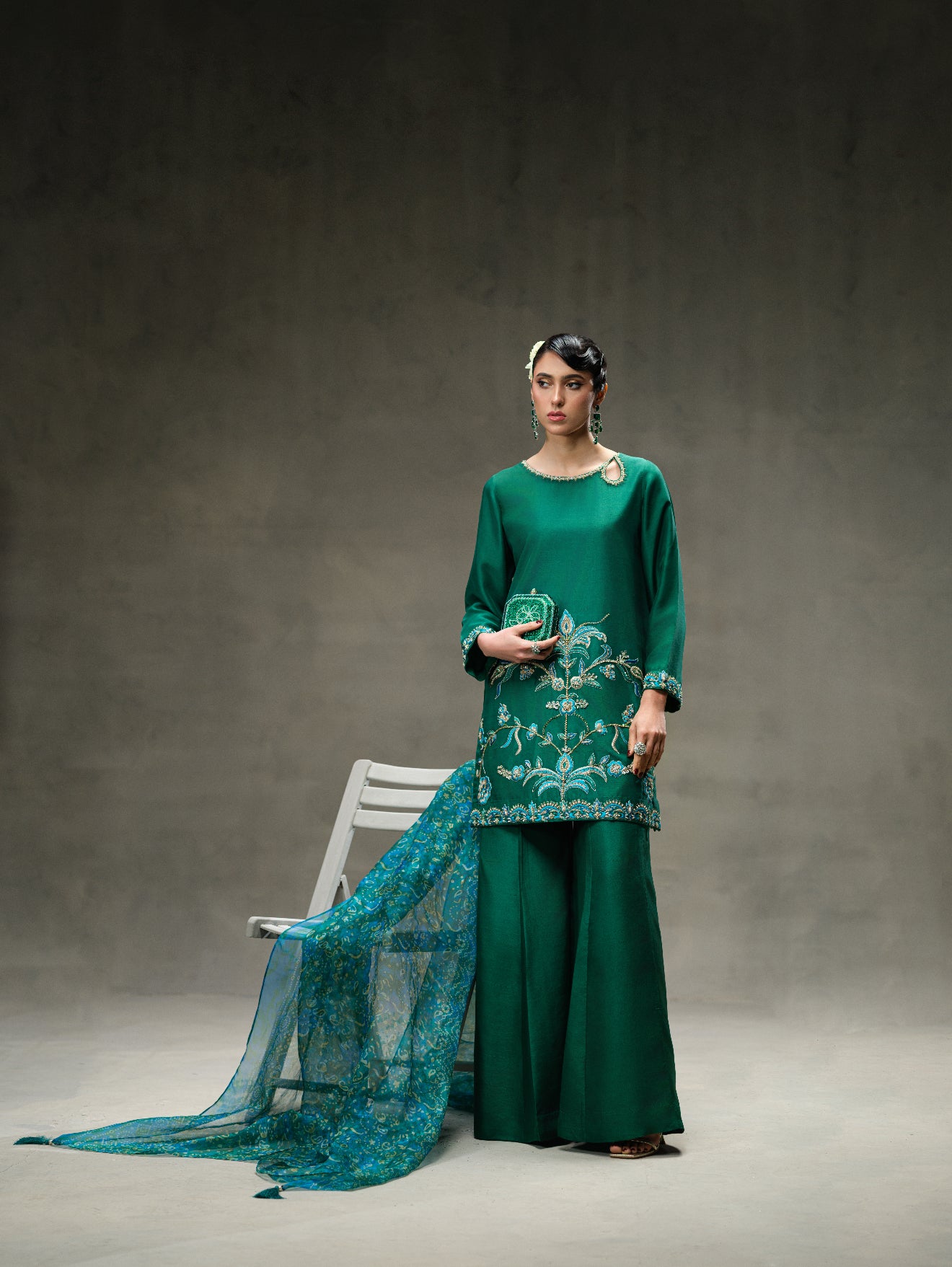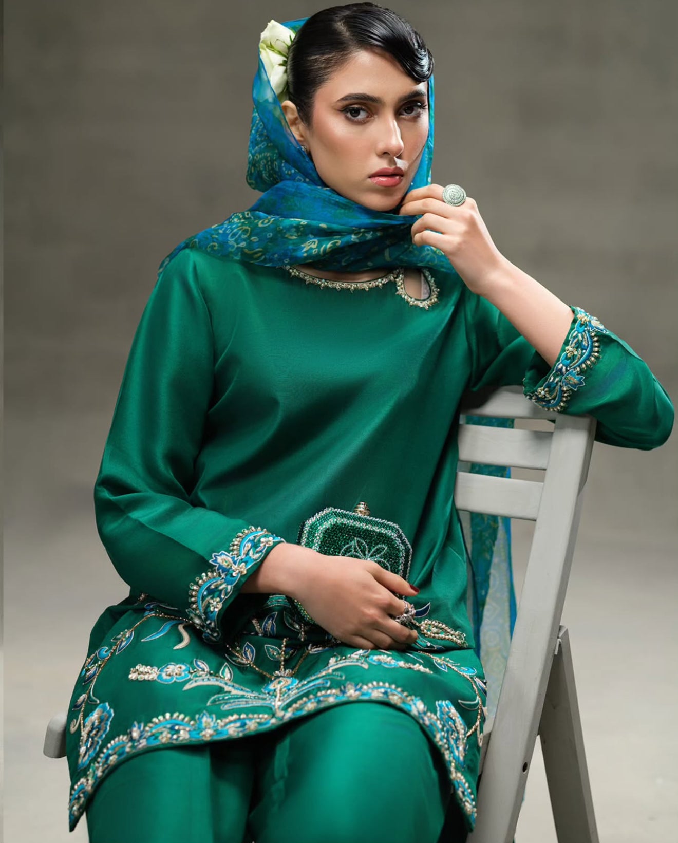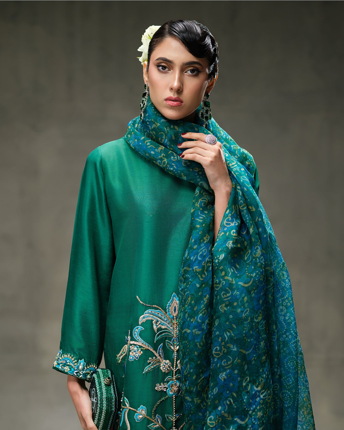 Emeralia is a contemporary yet timeless ensemble that blends comfort and elegance. Featuring a stylish short shirt with flared pants, it creates a flattering, modern silhouette. Intricate machine embroidery, along with embellishments like Dabka, Cut Dana, Sitari, Baza, Pearls, Beads, and Bethki, add texture and sparkle. A printed organza dupatta provides a soft, ethereal touch, balancing the vibrant details. Designed for women who value both beauty and ease, Emeralia is perfect for day events or evening soirées.
