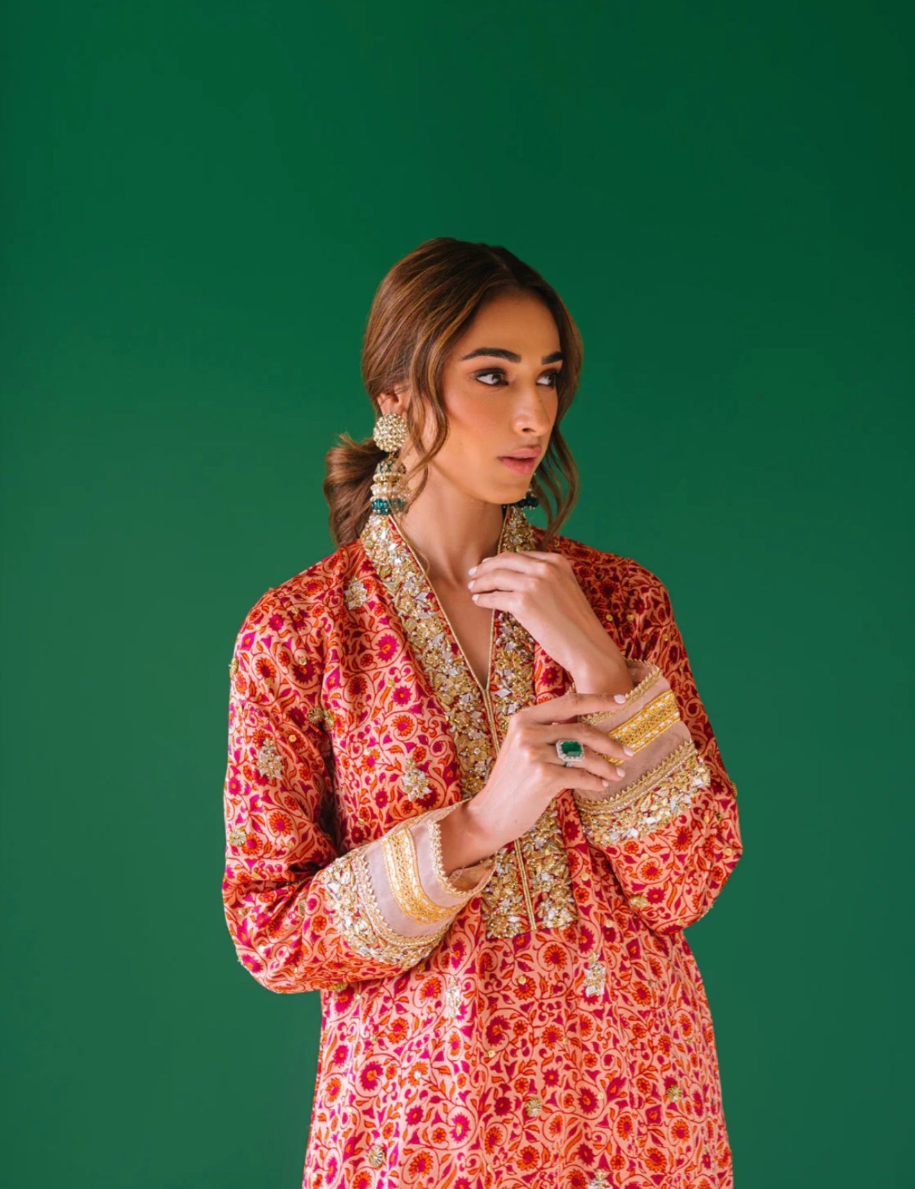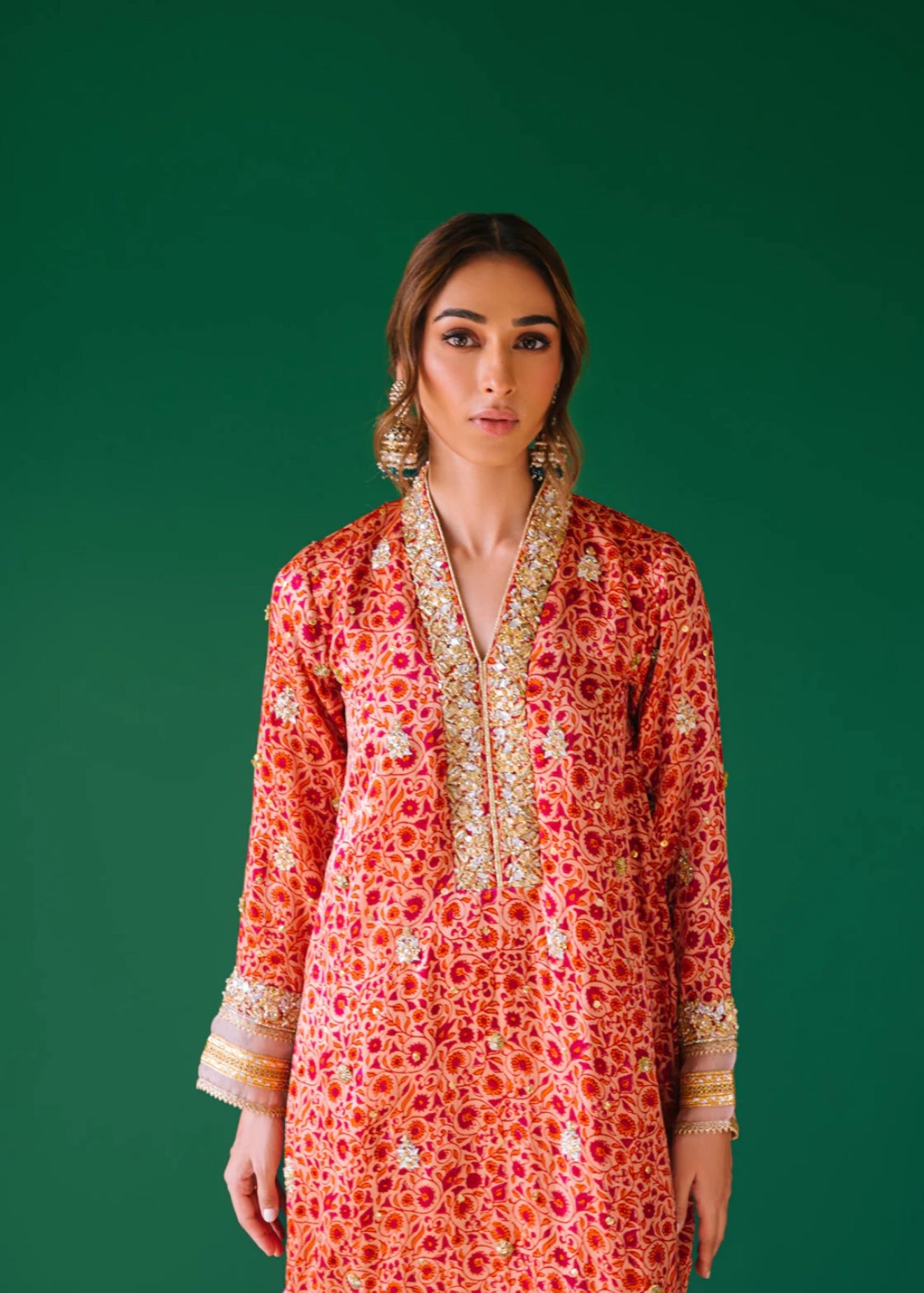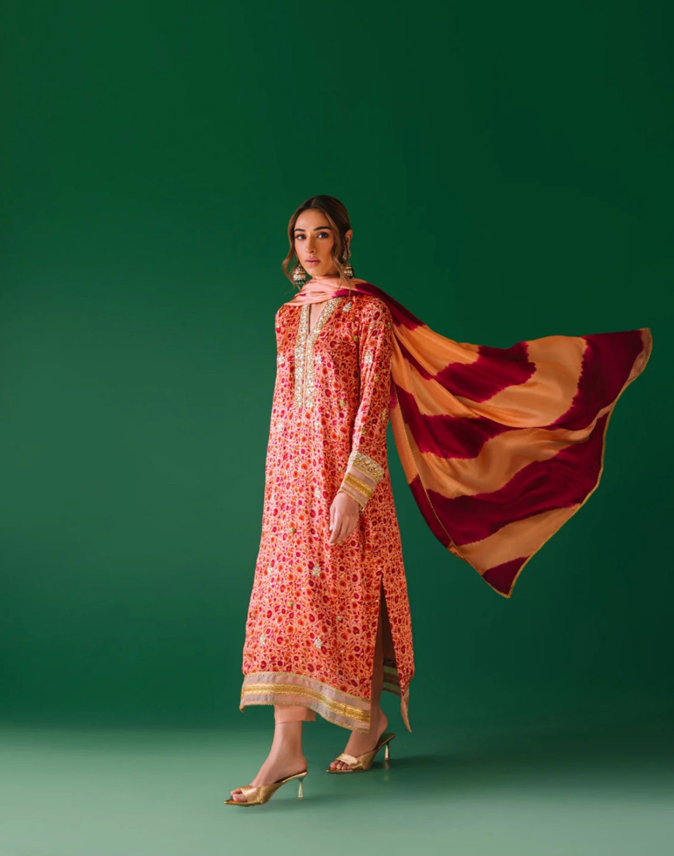 A pure charmeuse silk screenprinted shirt with heavy hand embellishments on neckline and sleeves. Also spray all over the shirt. Gota pati, kora, dabka, rhinestones, pearls. Finished with multicolored border on shirt. And sleeves. Paired with pure Raw silk 60 gms cigarette pants. Finished with multicolored border. Paired with a pure medium silk ombre gota finished dupatta.