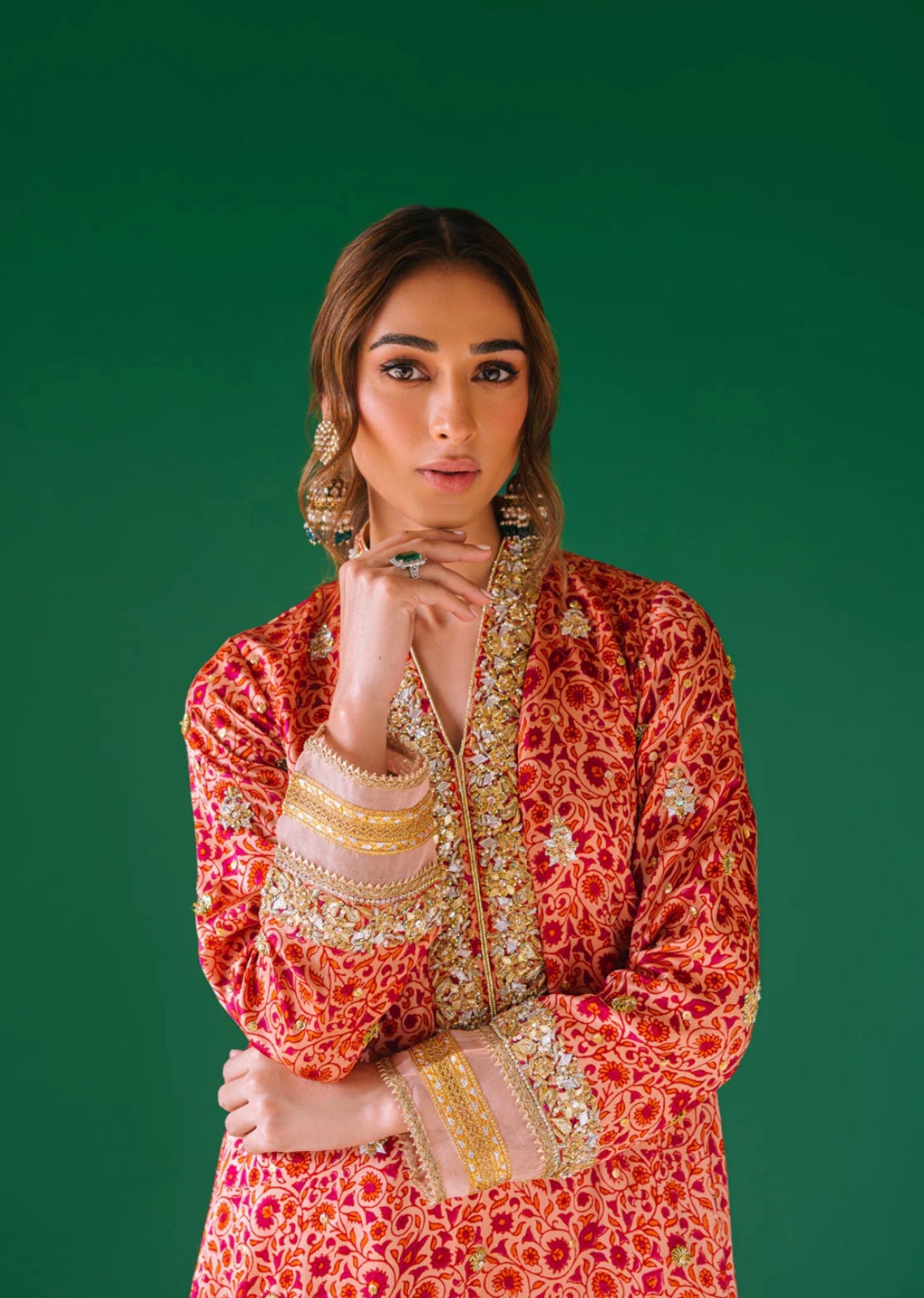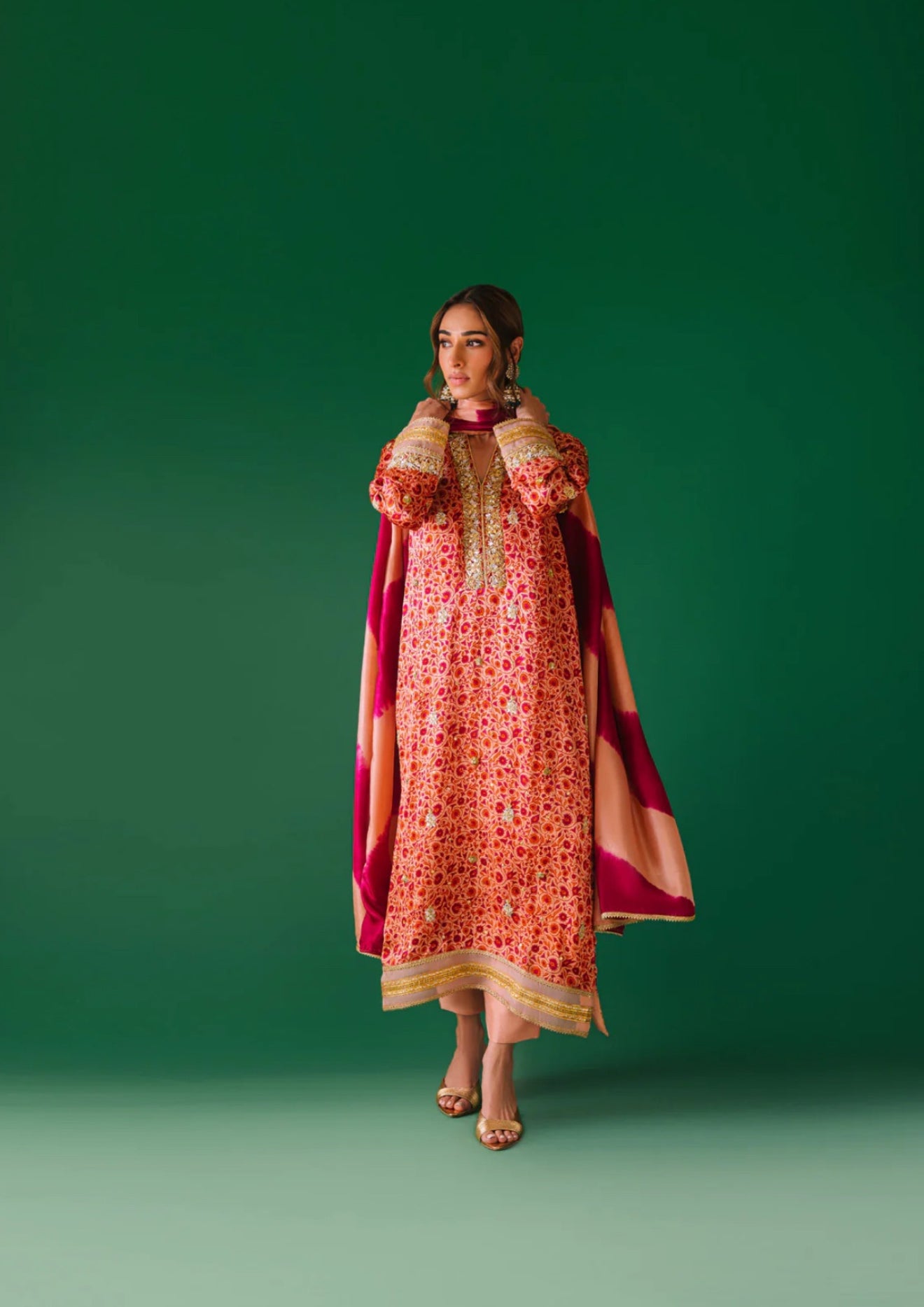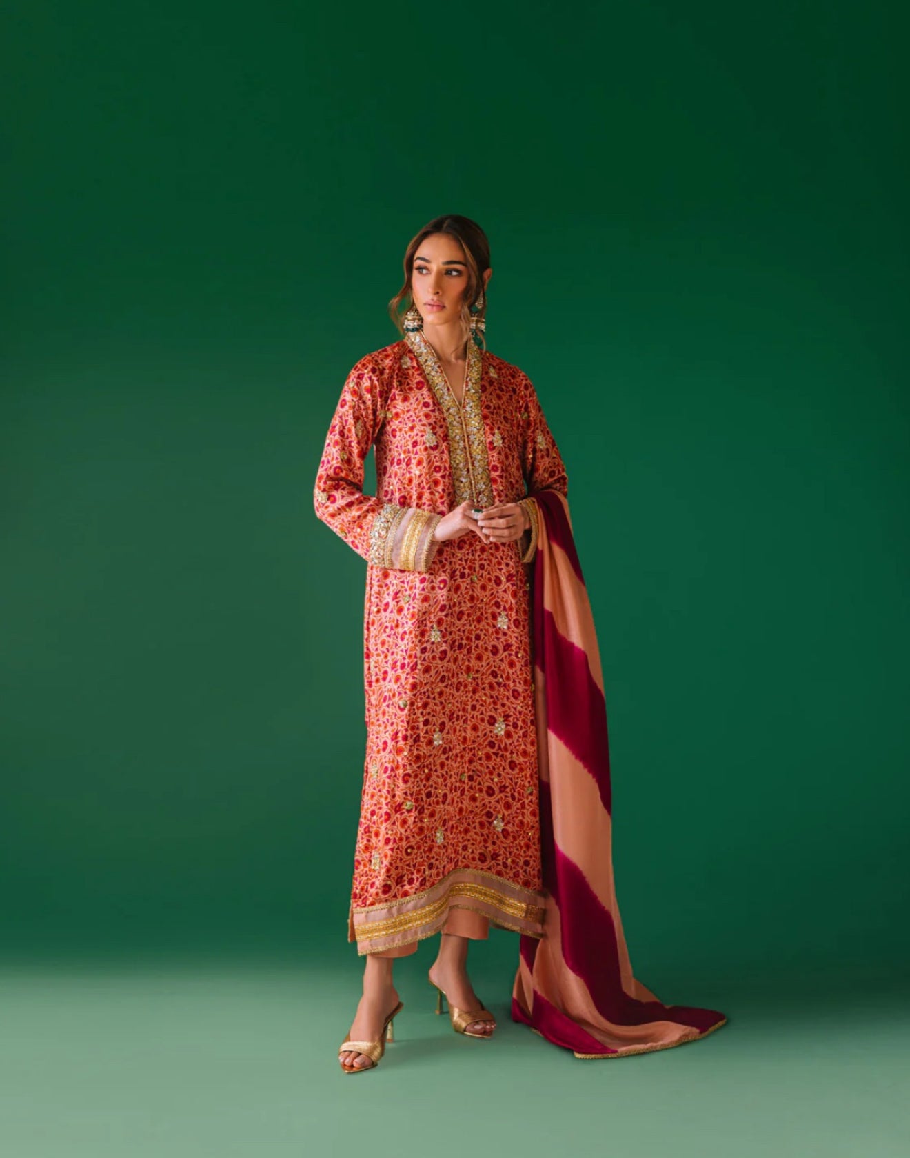 A pure charmeuse silk screenprinted shirt with heavy hand embellishments on neckline and sleeves. Also spray all over the shirt. Gota pati, kora, dabka, rhinestones, pearls. Finished with multicolored border on shirt. And sleeves. Paired with pure Raw silk 60 gms cigarette pants. Finished with multicolored border. Paired with a pure medium silk ombre gota finished dupatta.