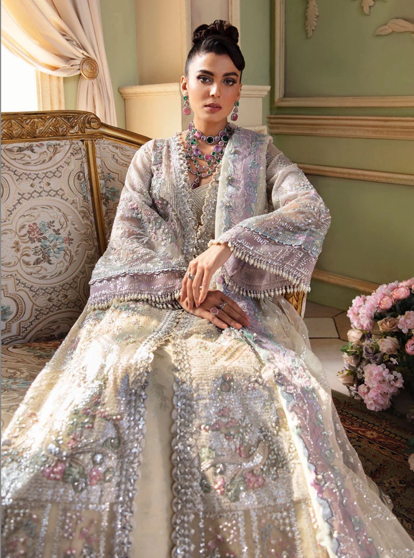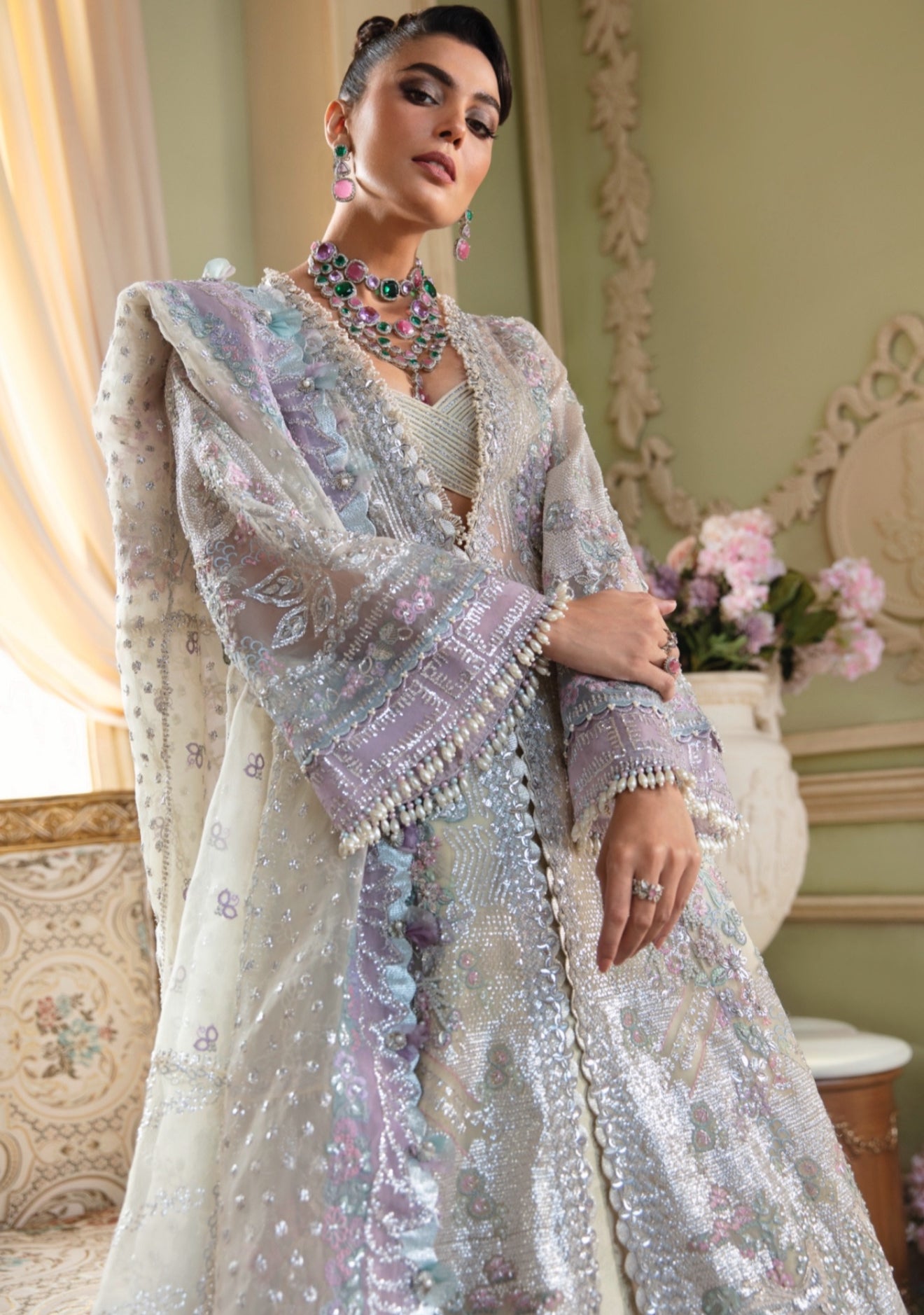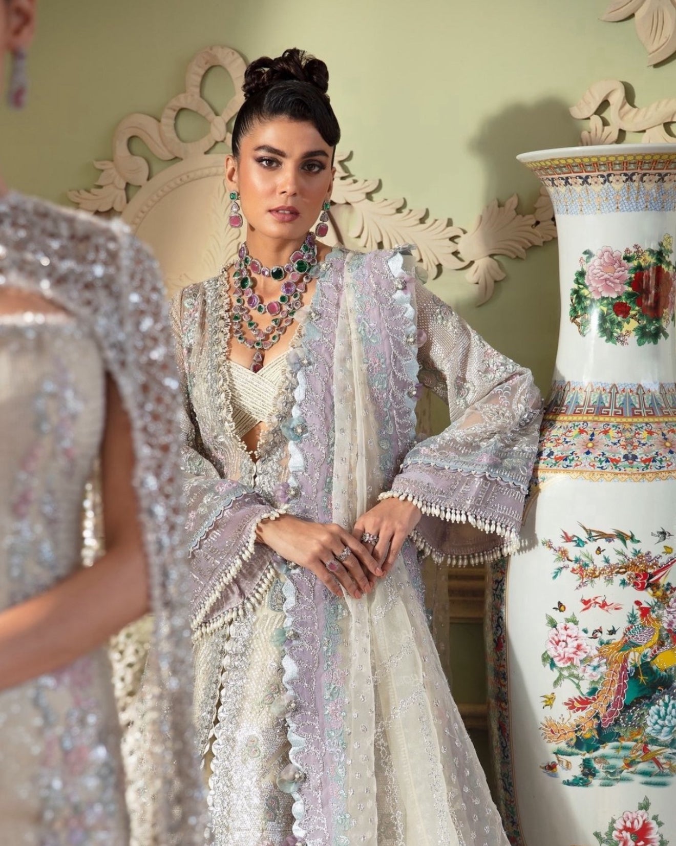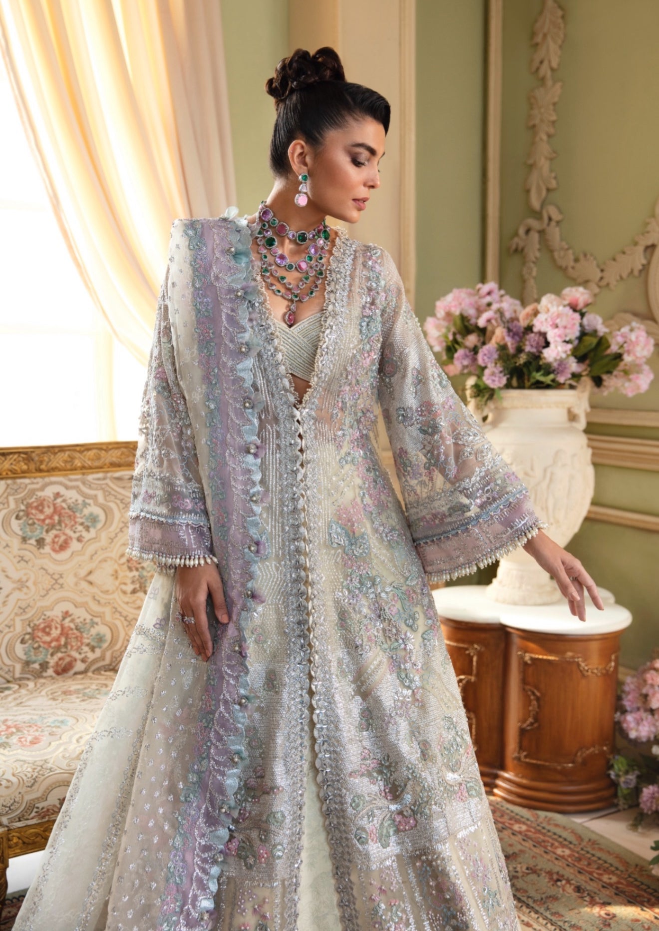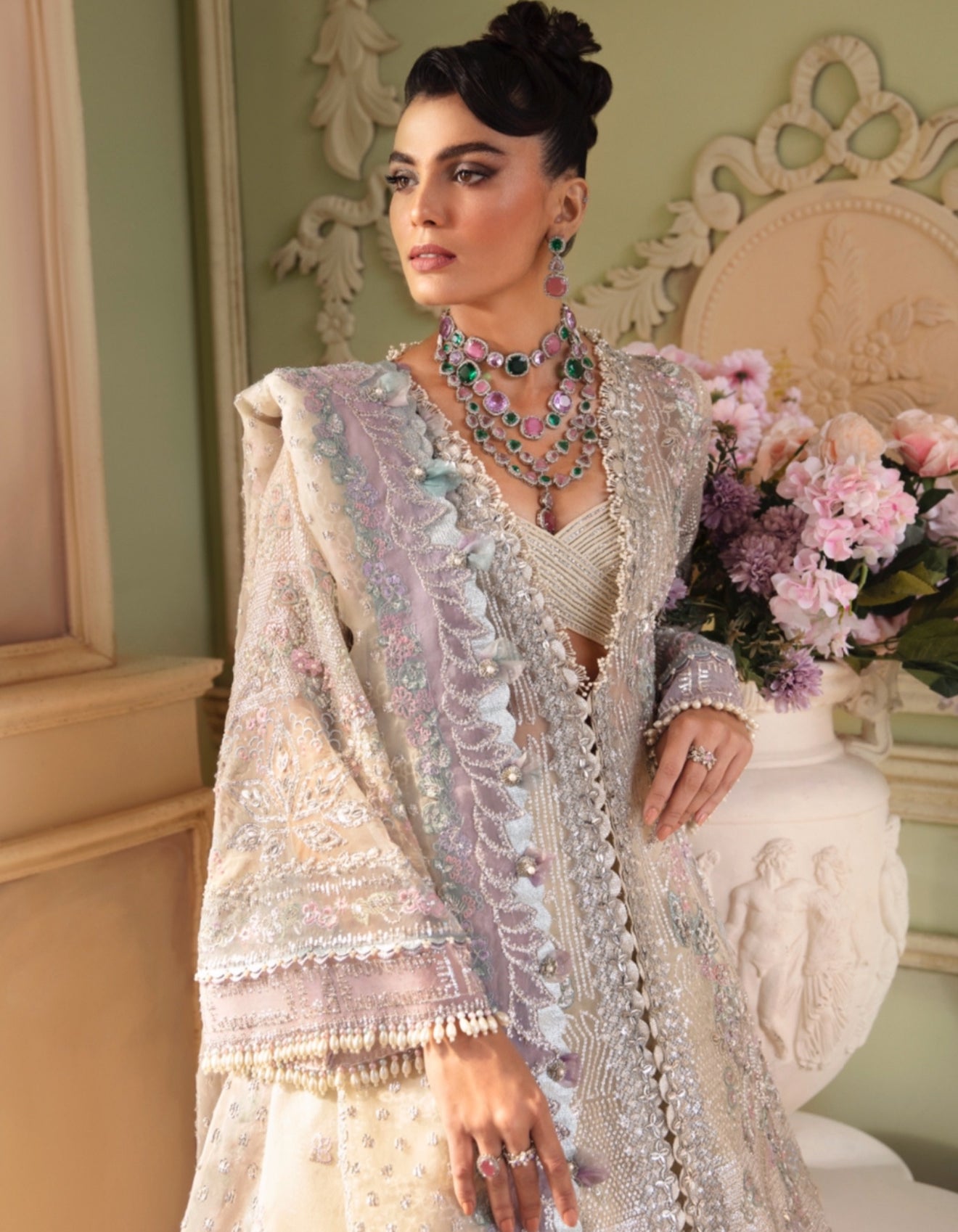 This ivory Anarkali net outfit features intricate bead, pearl, and sequin embellishments that add sophisticated shimmer and texture. The flowing silhouette is paired with a beautifully printed lehnga that compliments the delicate net fabric. An equally adorned net dupatta completes the ensemble, offering a harmonious balance of elegance and detailed craftsmanship, perfect for formal occasions.
