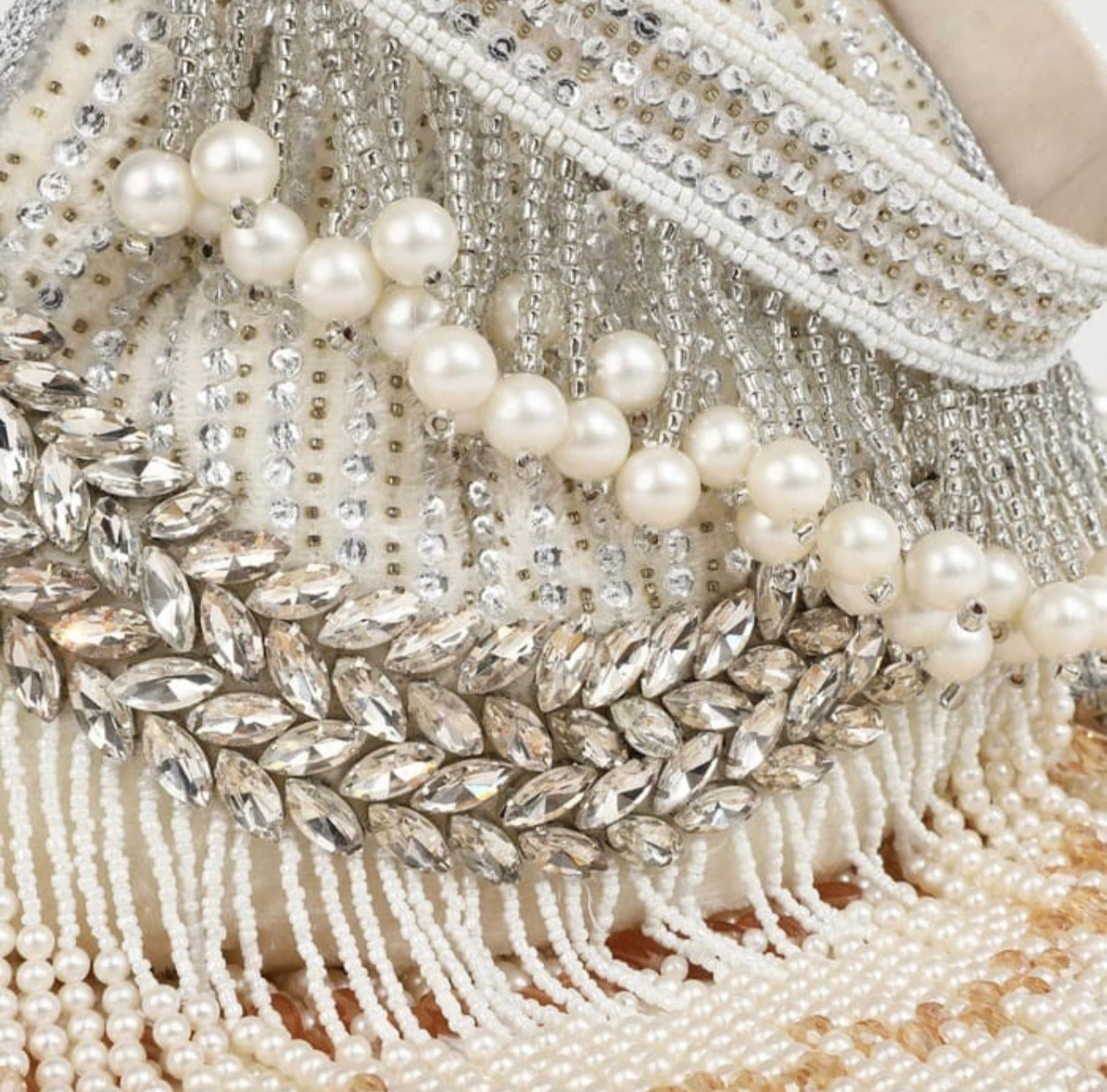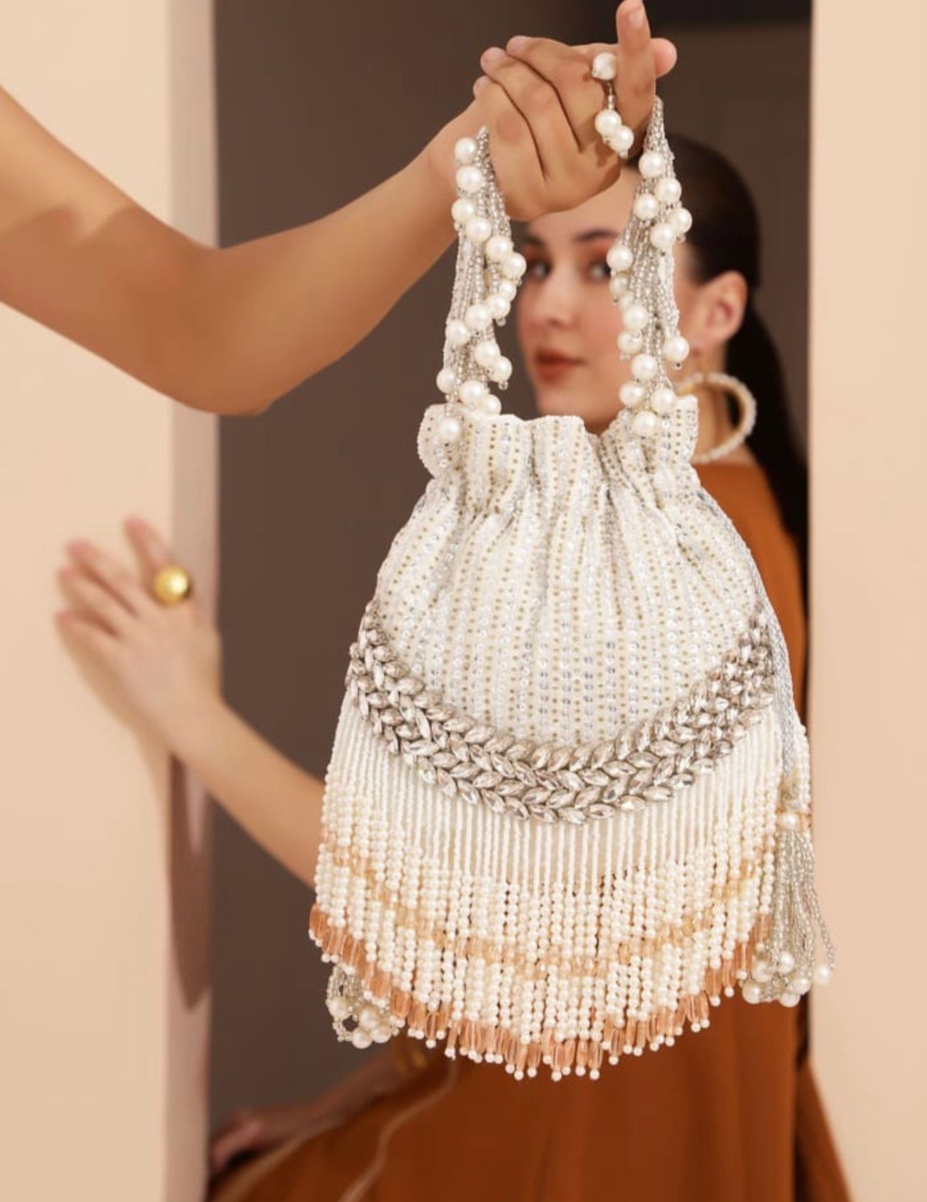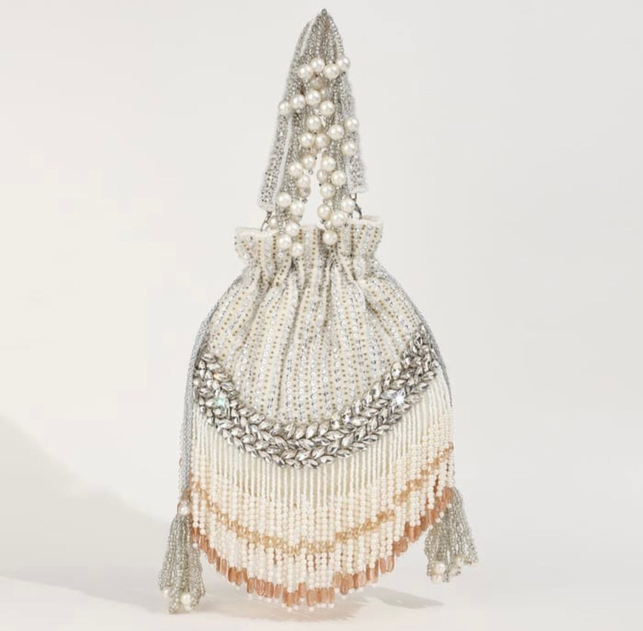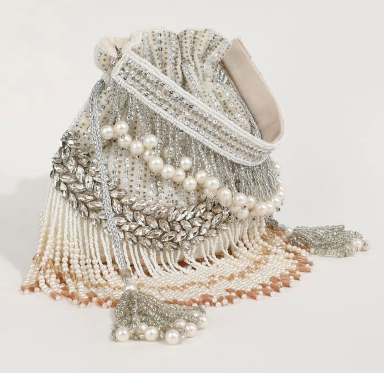 The Kubra Potli is an elegant ivory pouch delicately adorned with intricate beadwork, crystals and pearls, offering a refined and timeless aesthetic. Featuring a convenient drawstring closure, it ensures secure storage while its comfortable handle allows for easy carrying. This potli seamlessly blends traditional craftsmanship with modern functionality, making it a sophisticated accessory for special occasions.