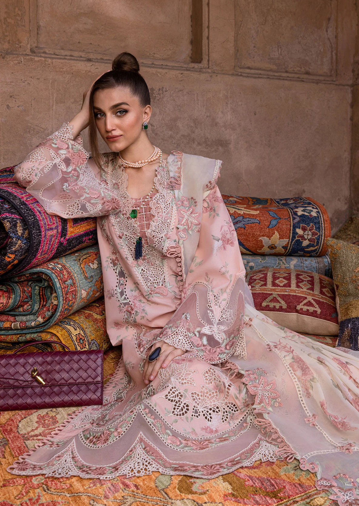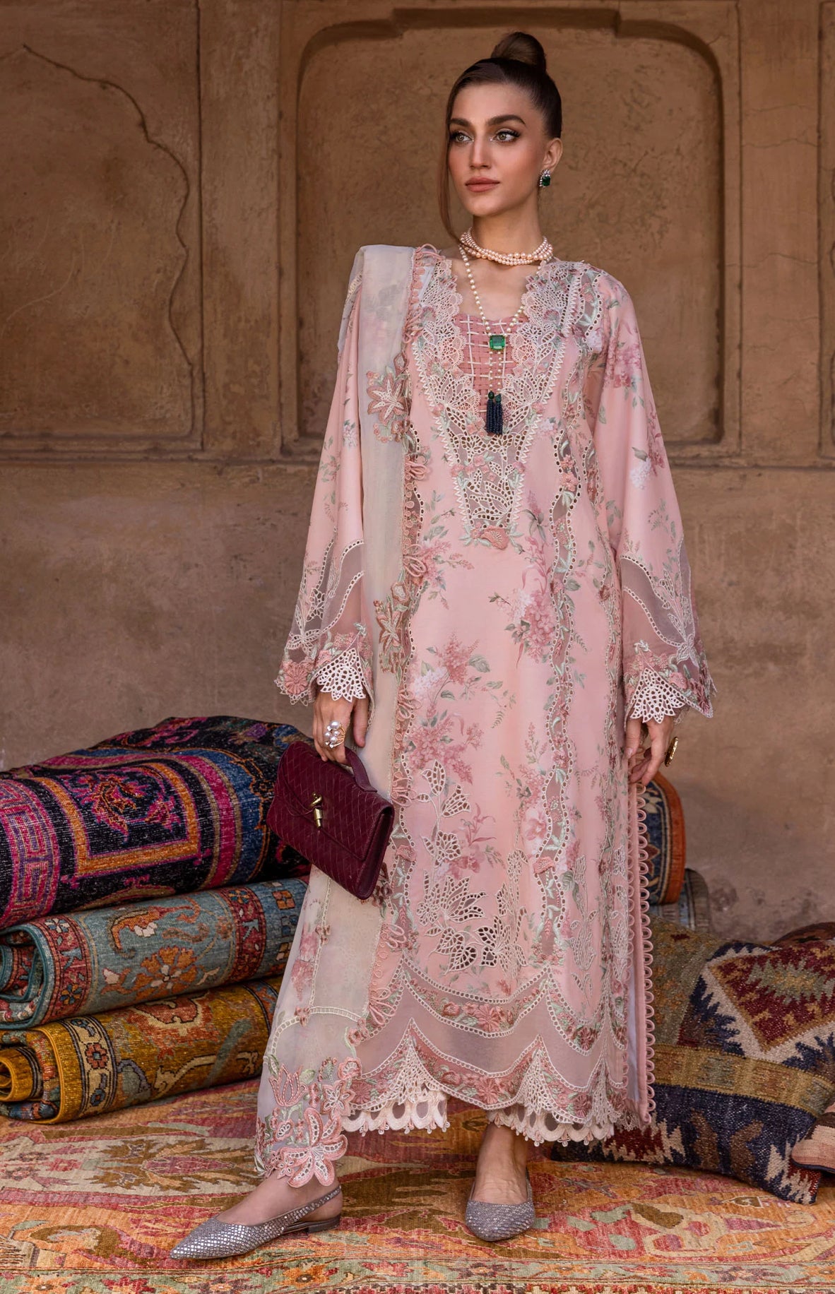 Our next reveal features a beautiful printed front featuring lavender fields against an ivory base. The panelled front which can be stitched as a tapered kalidar or a shirt is framed with gorgeous cutwork with ghaata embroidered delicate floral organza inserts. The panela culminate in a statement color blocked scalloped hem beautifully embroidered in cascading florals and cutwork. The beautiful V shaped neckline is perfection! The sleeves are finished with beautiful embroidered waves. The pants also come with tonal peekaboo embroideries. The contrasting lavender dupatta is flanked with gorgeous lilies and statement pallu corners. Beautiful, summery and quintessentially Crimson, this is Luxury Lawn like never before.