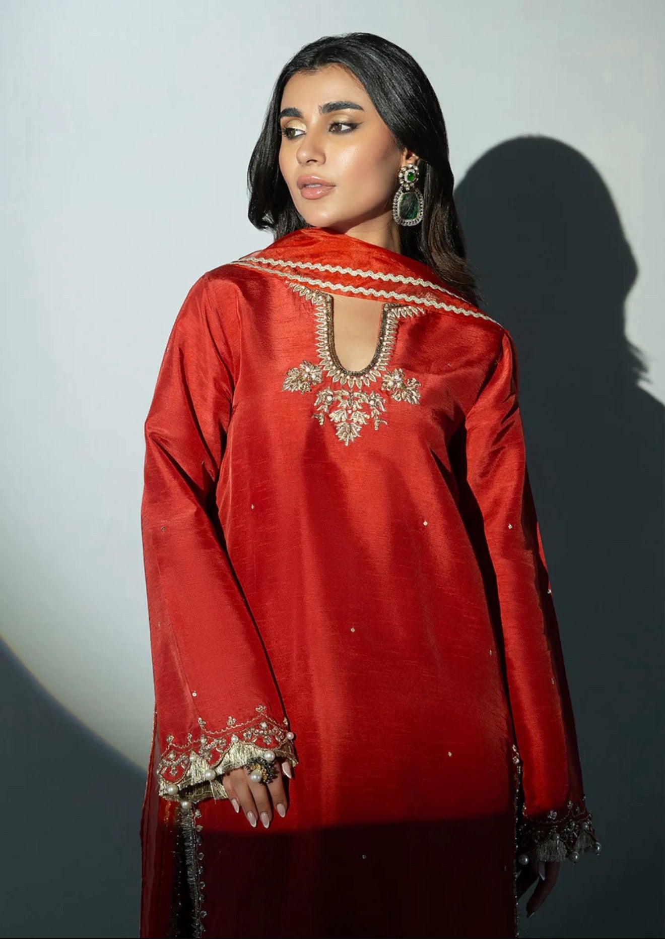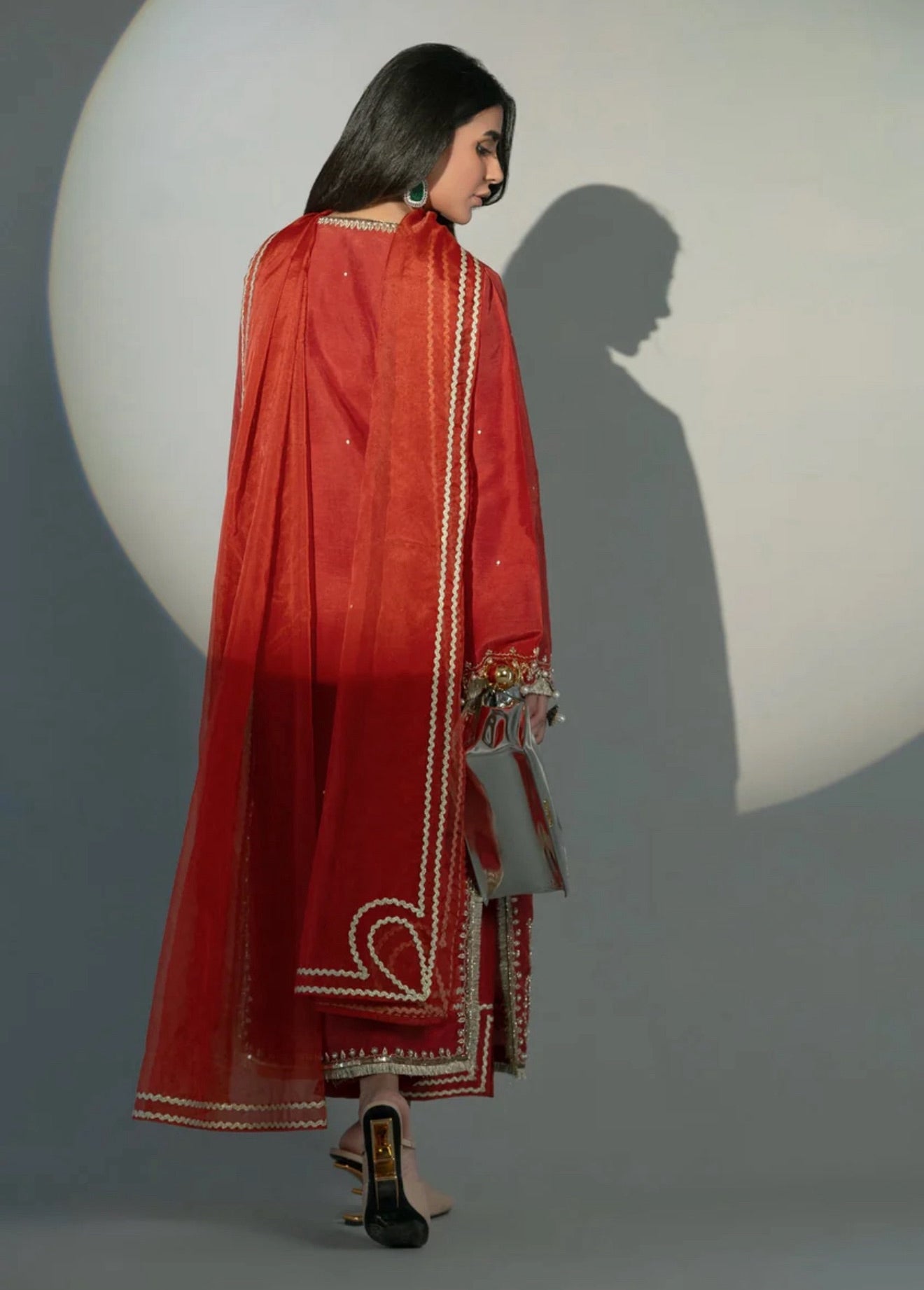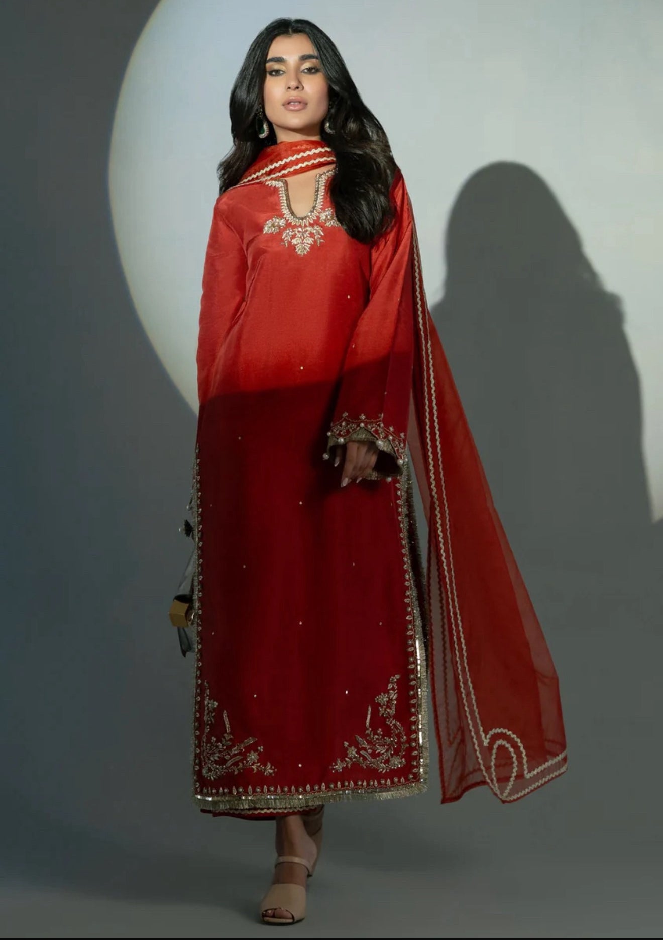 Mandana, the timeless kurta is made in pure bamber raw silk, delicately handworked in shades of gold. It is paired with matching raw silk izaar with sequins border and a foil printed organza dupatta.