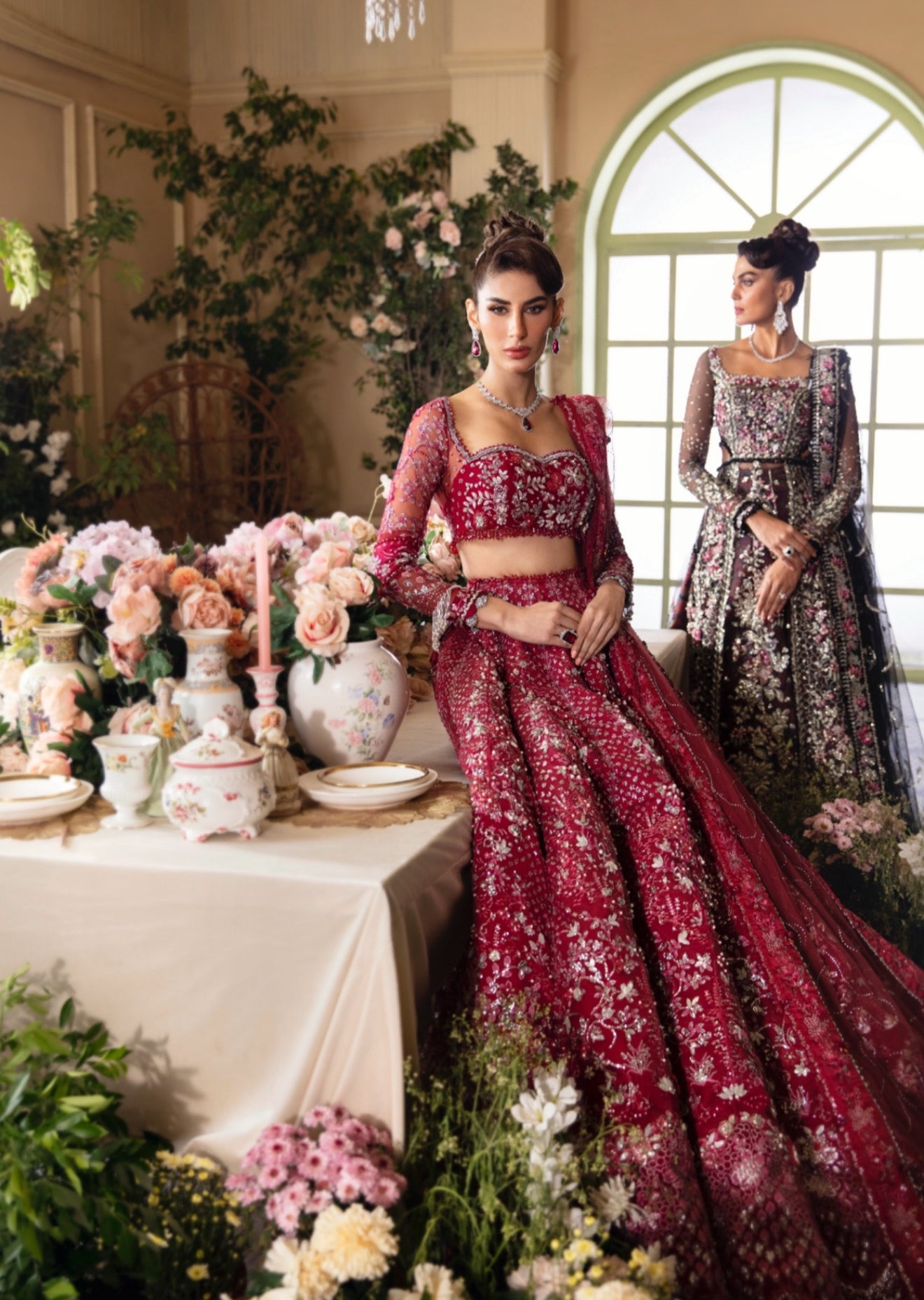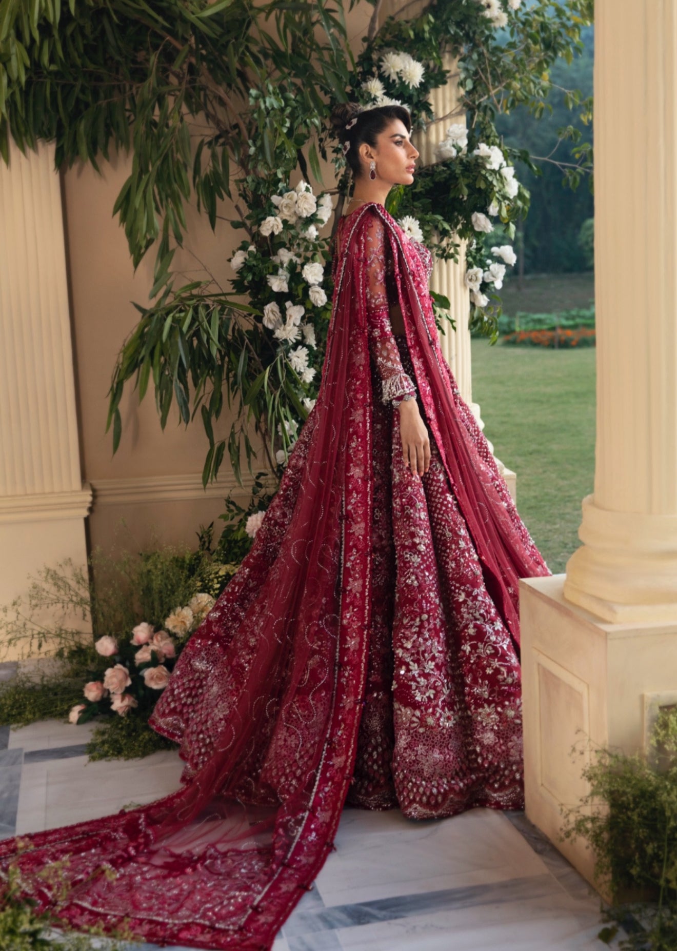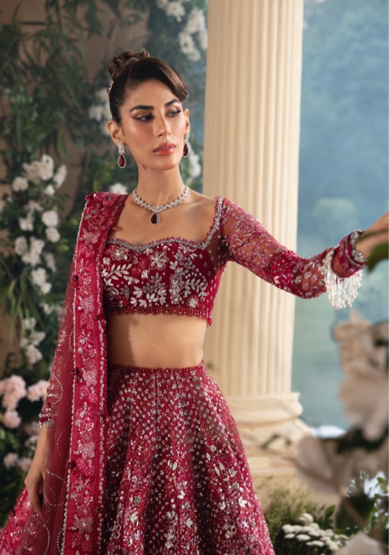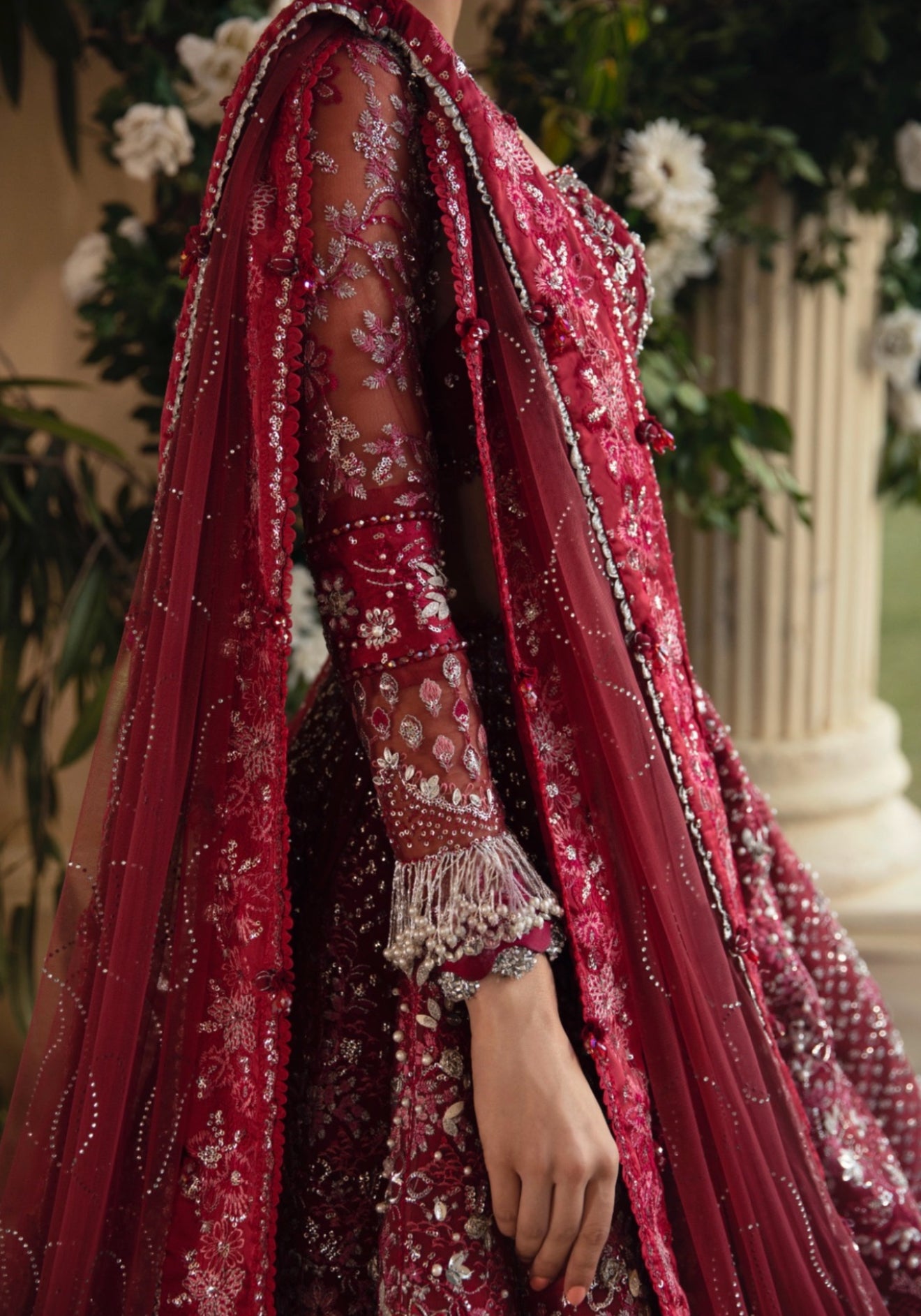 This maroon, stitched as Anarkali net outfit features intricate bead, pearl, and sequin embellishments that add sophisticated shimmer and texture. The flowing silhouette is paired with a beautifully printed lehnga that compliments the delicate net fabric. An equally adorned net dupatta completes the ensemble, offering a harmonious balance of elegance and detailed craftsmanship, perfect for formal occasions.