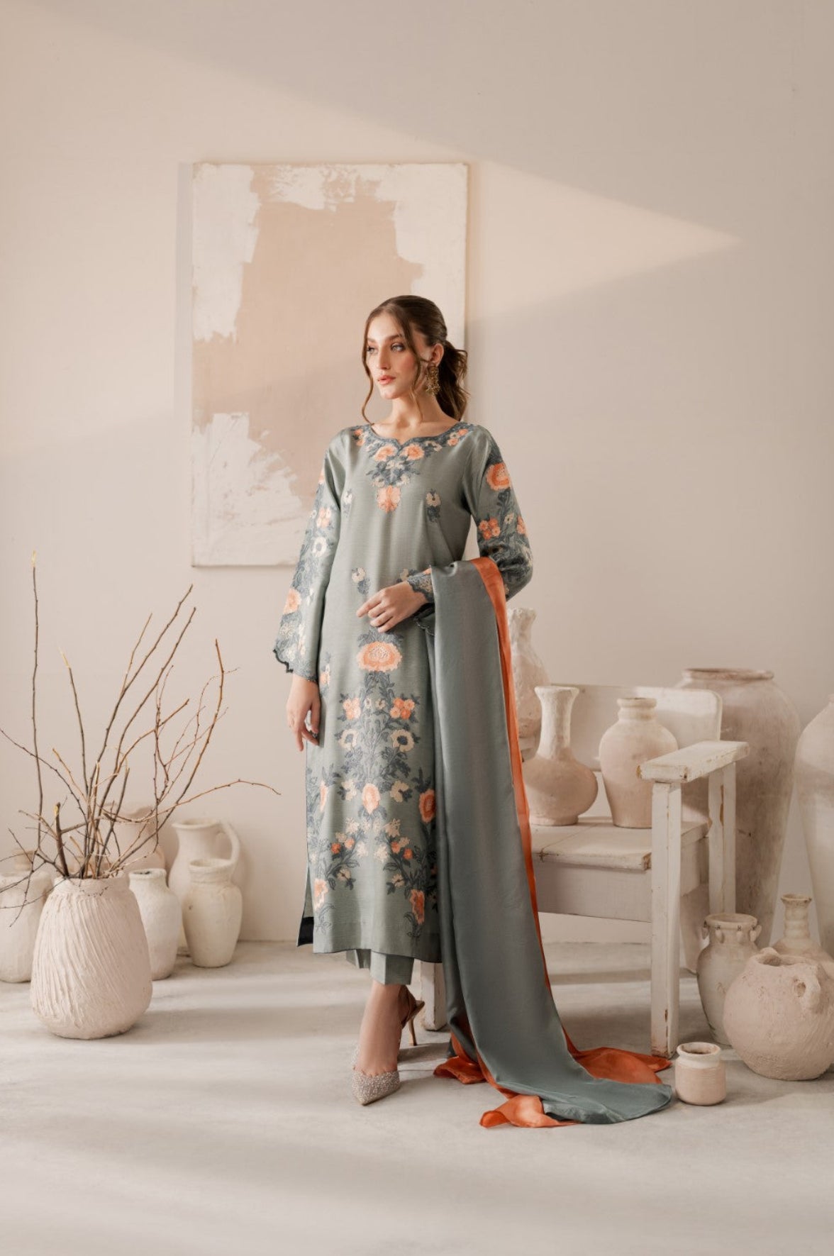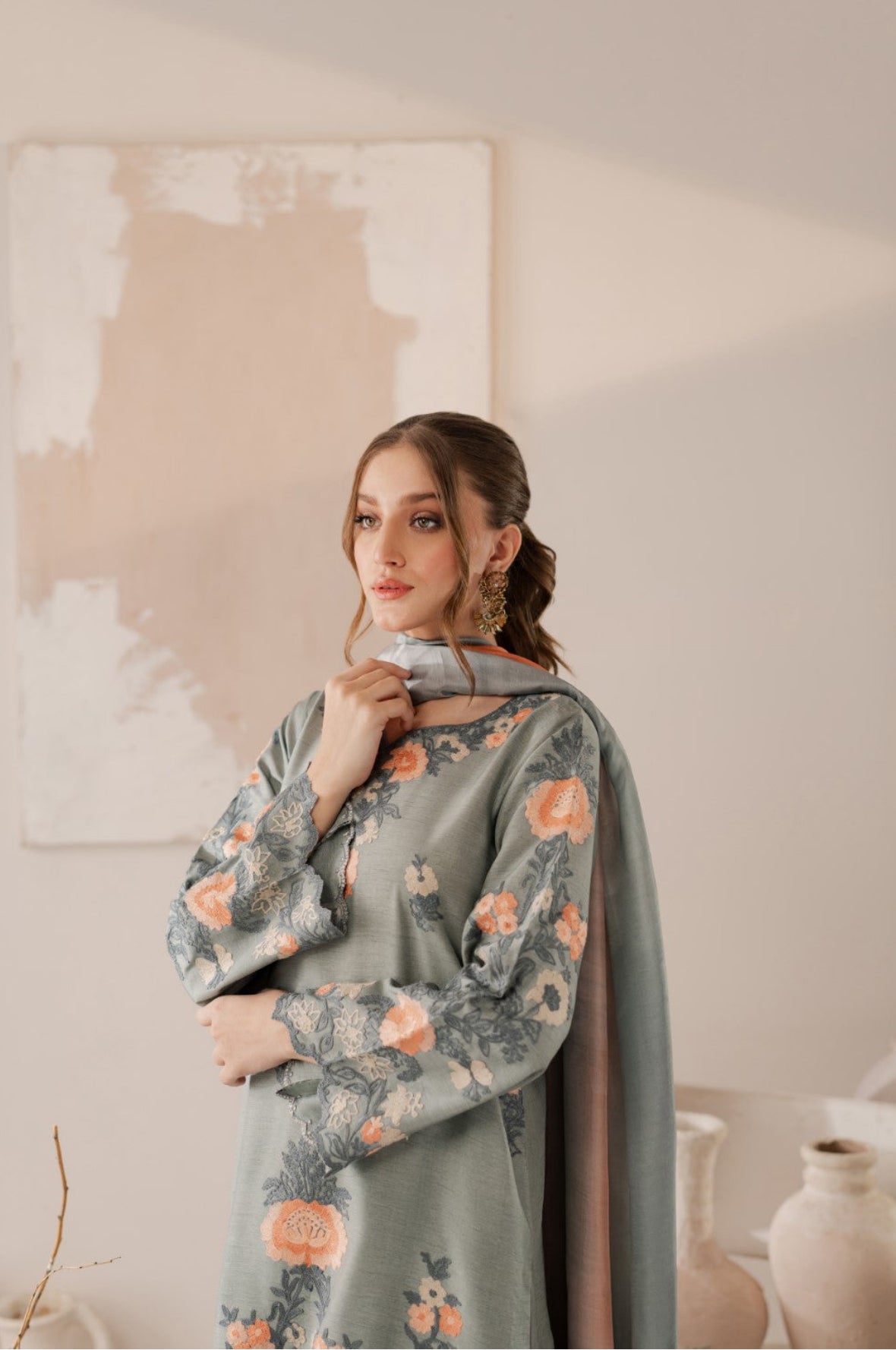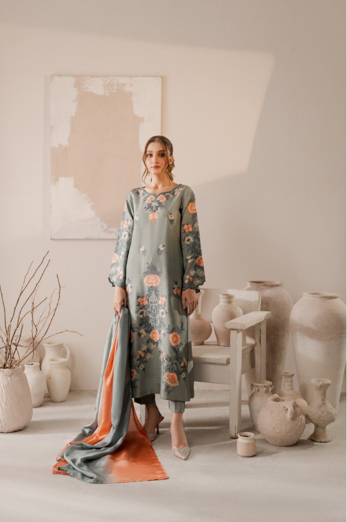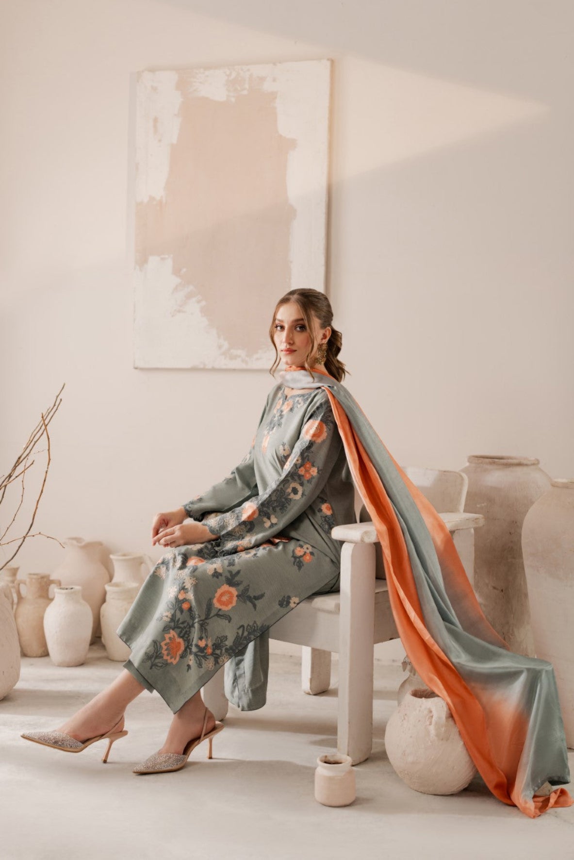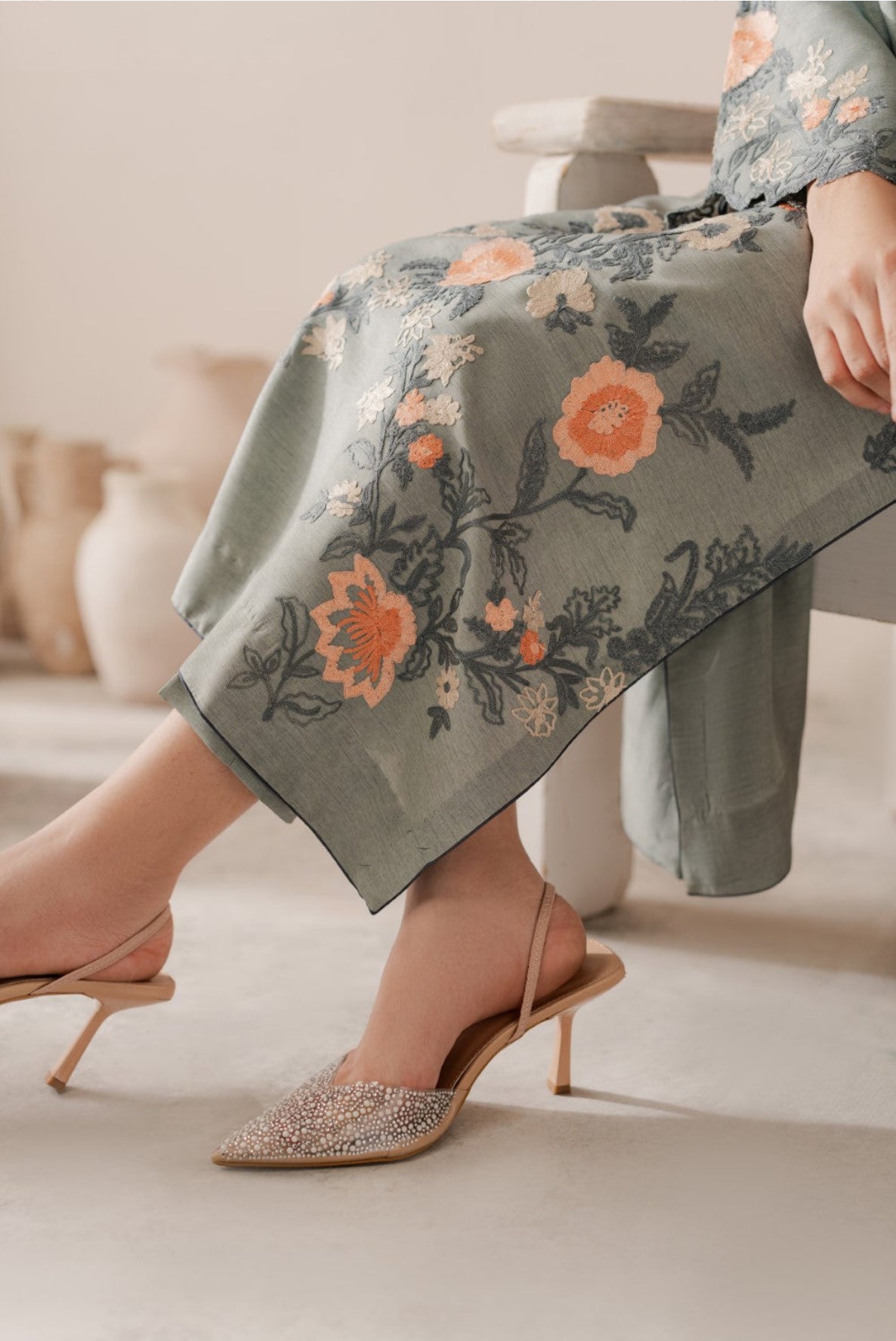 Ideal for formal soirées, this silver grey number exudes understated charisma while promising comfort. The meticulous aari embroidery on the rawsilk ensemble is accented with hand embellishment along the neckline and the scalloped sleeves. The beautiful two-tone dupatta adds fluidity and theatrics to the relaxed silhouette.