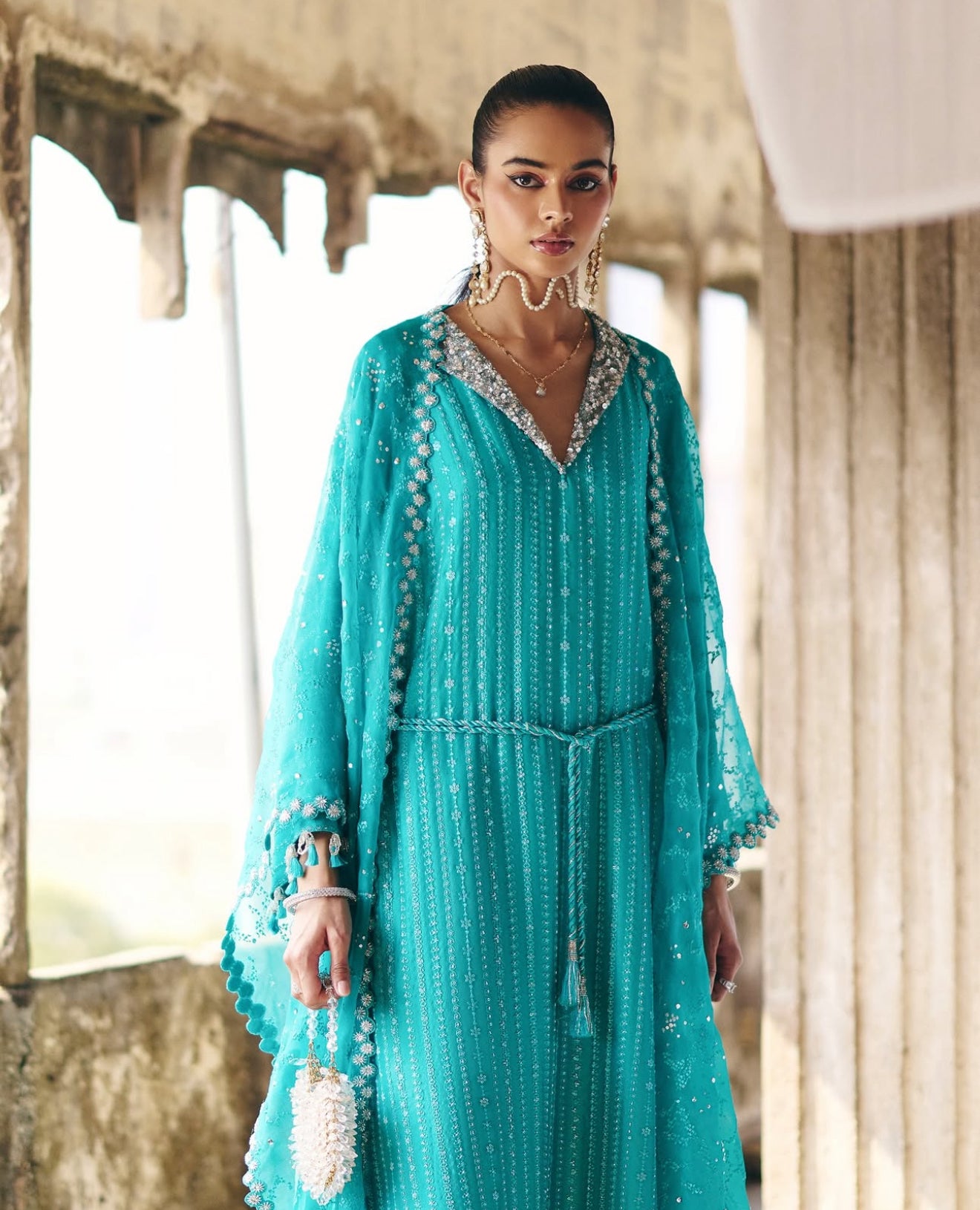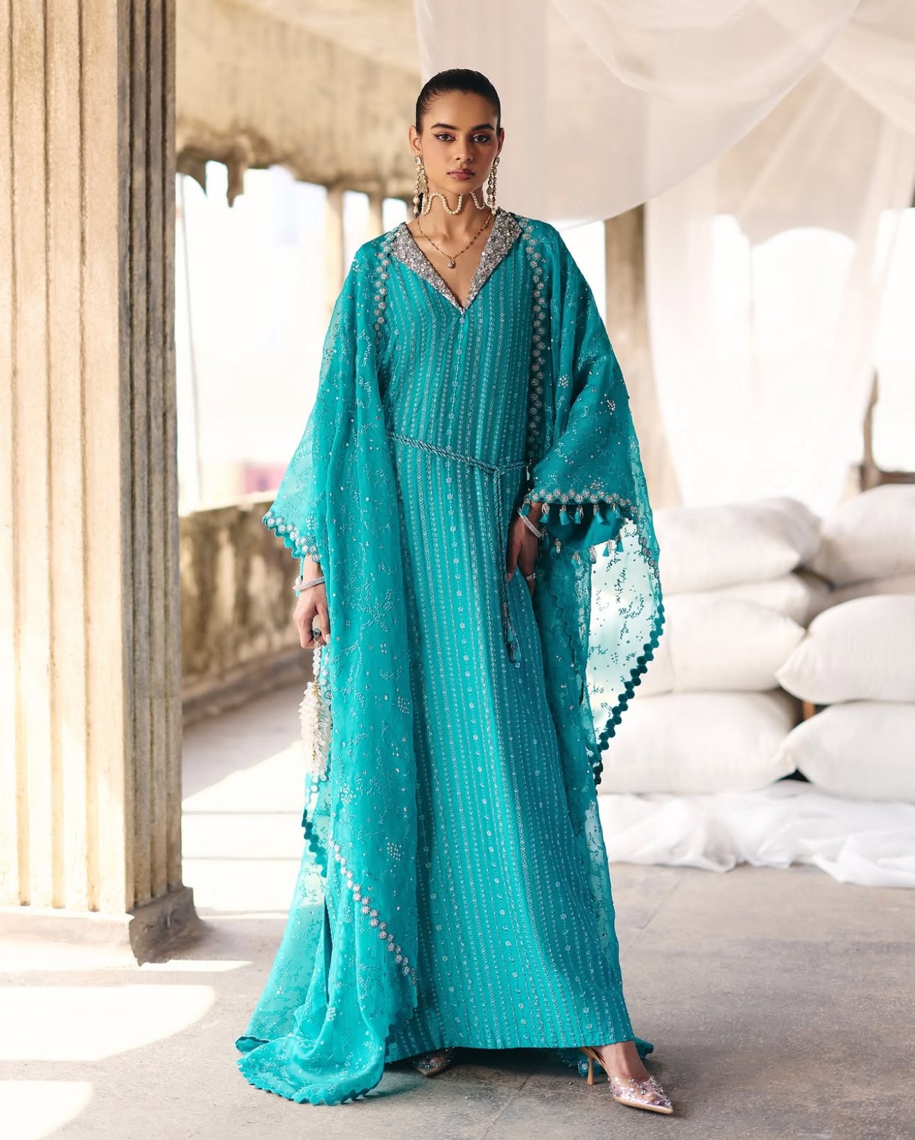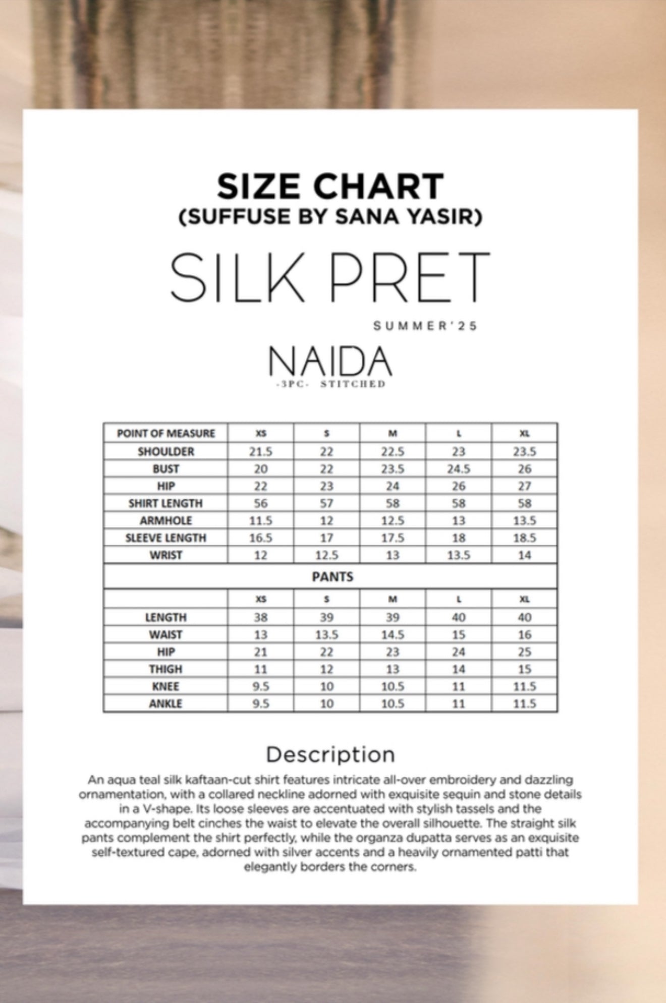 Prepare to be captivated by a stunning ensemble consisting of three total pieces that effortlessly blend elegance and sophistication. Naida is an aqua teal silk kaftaan-cut shirt features intricate all-over embroidery and dazzling ornamentation, highlighted by a collared neckline adorned with exquisite sequin and stone details in a V-shape. Its loose sleeves are accentuated with stylish tassels for added flair, and the accompanying belt cinches the waist to elevate the overall silhouette. The straight silk pants complement the shirt perfectly, while the organza dupatta serves as an exquisite self-textured cape, adorned with silver accents and a heavily ornamented patti that elegantly borders the corners. This luxurious outfit is sure to make a statement at any regal occasion.