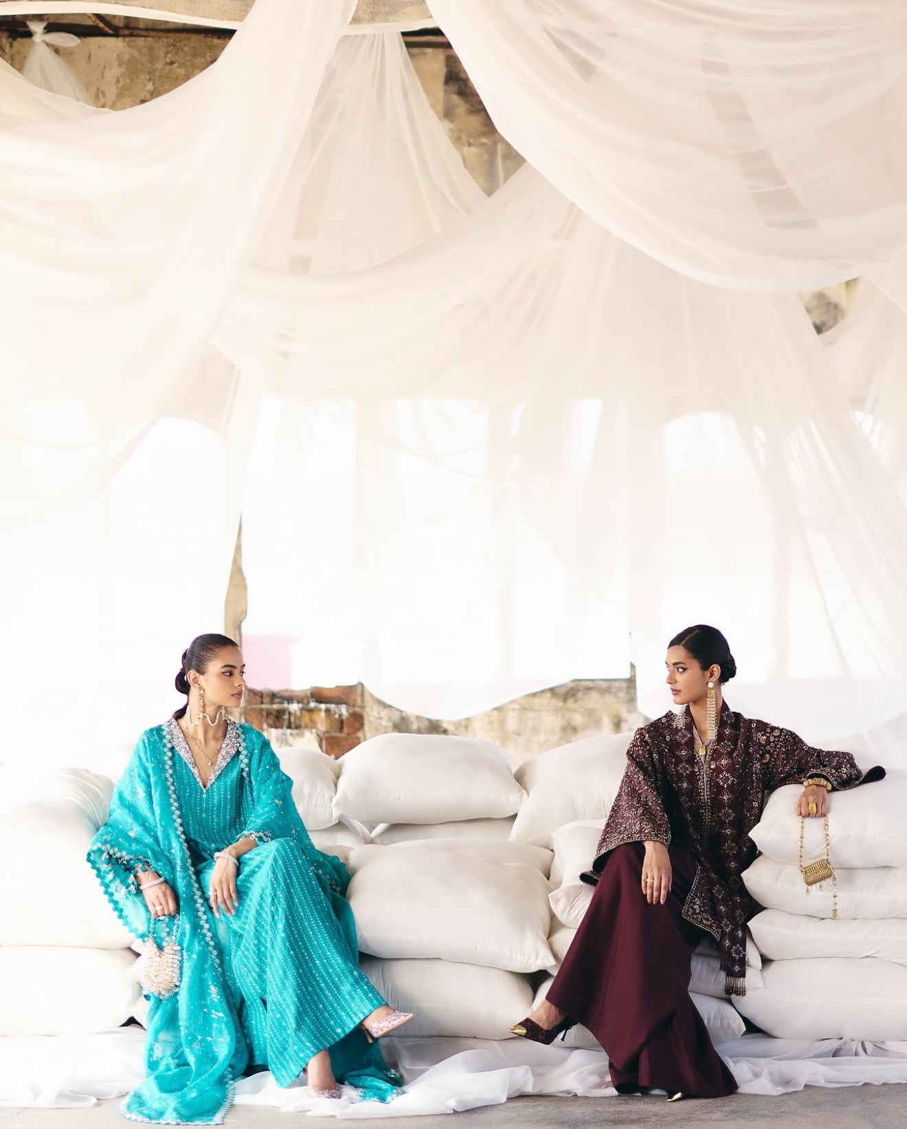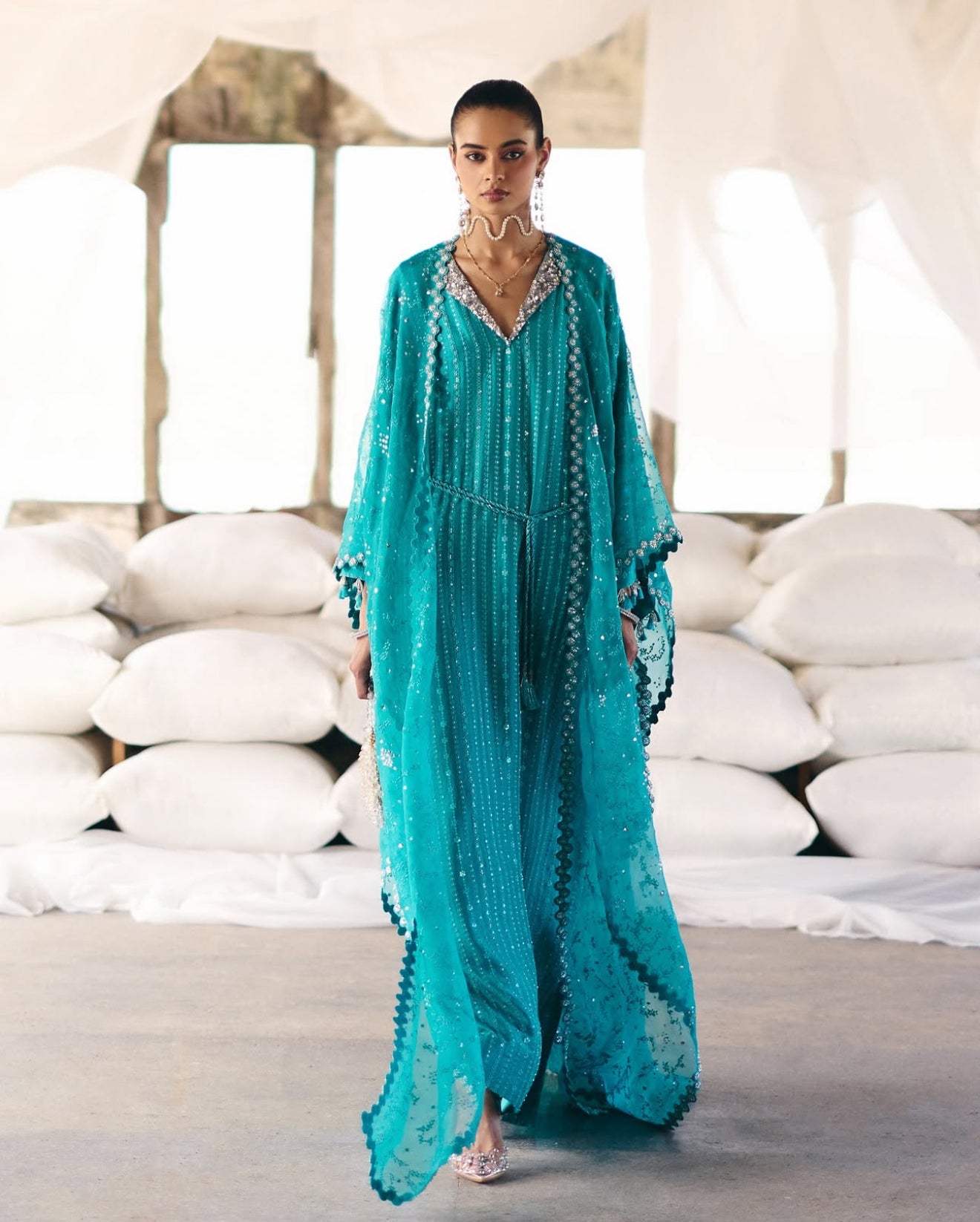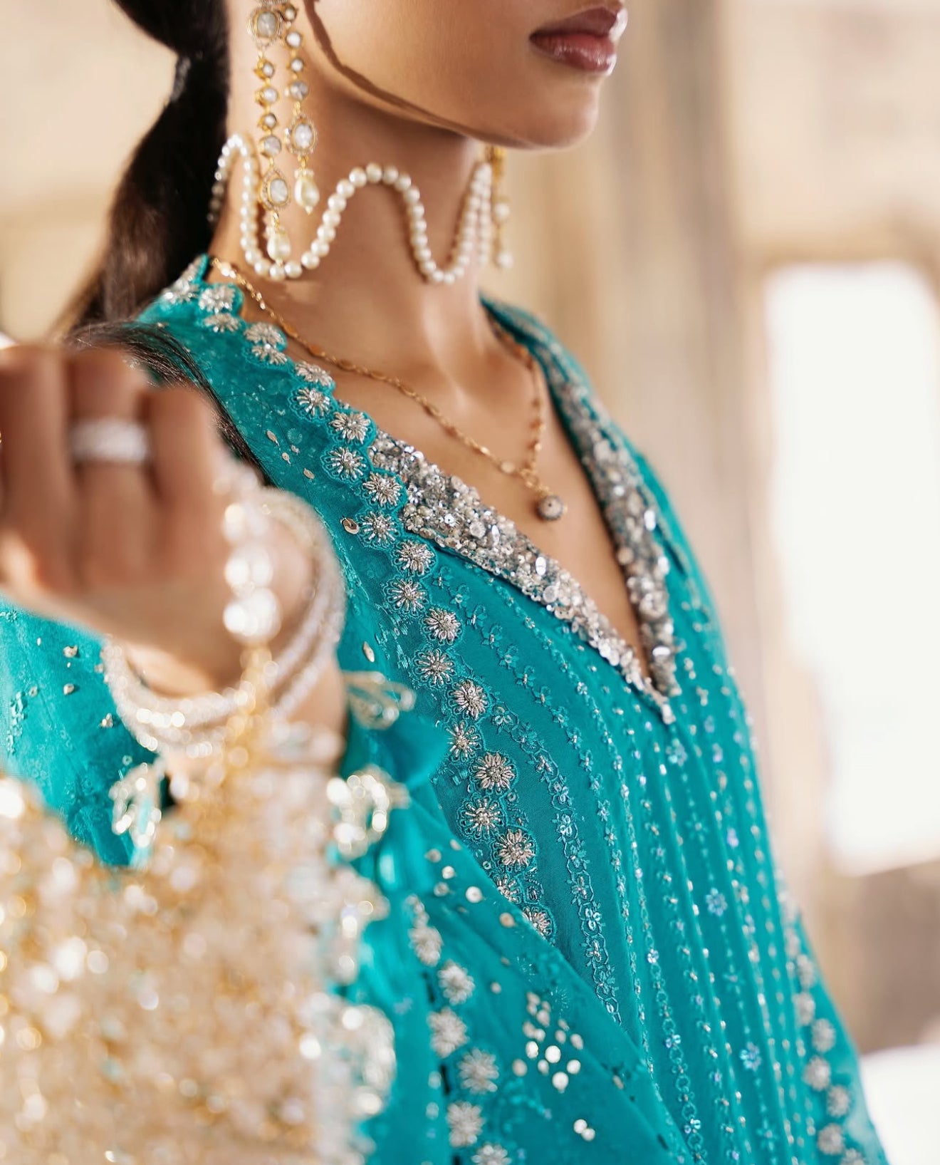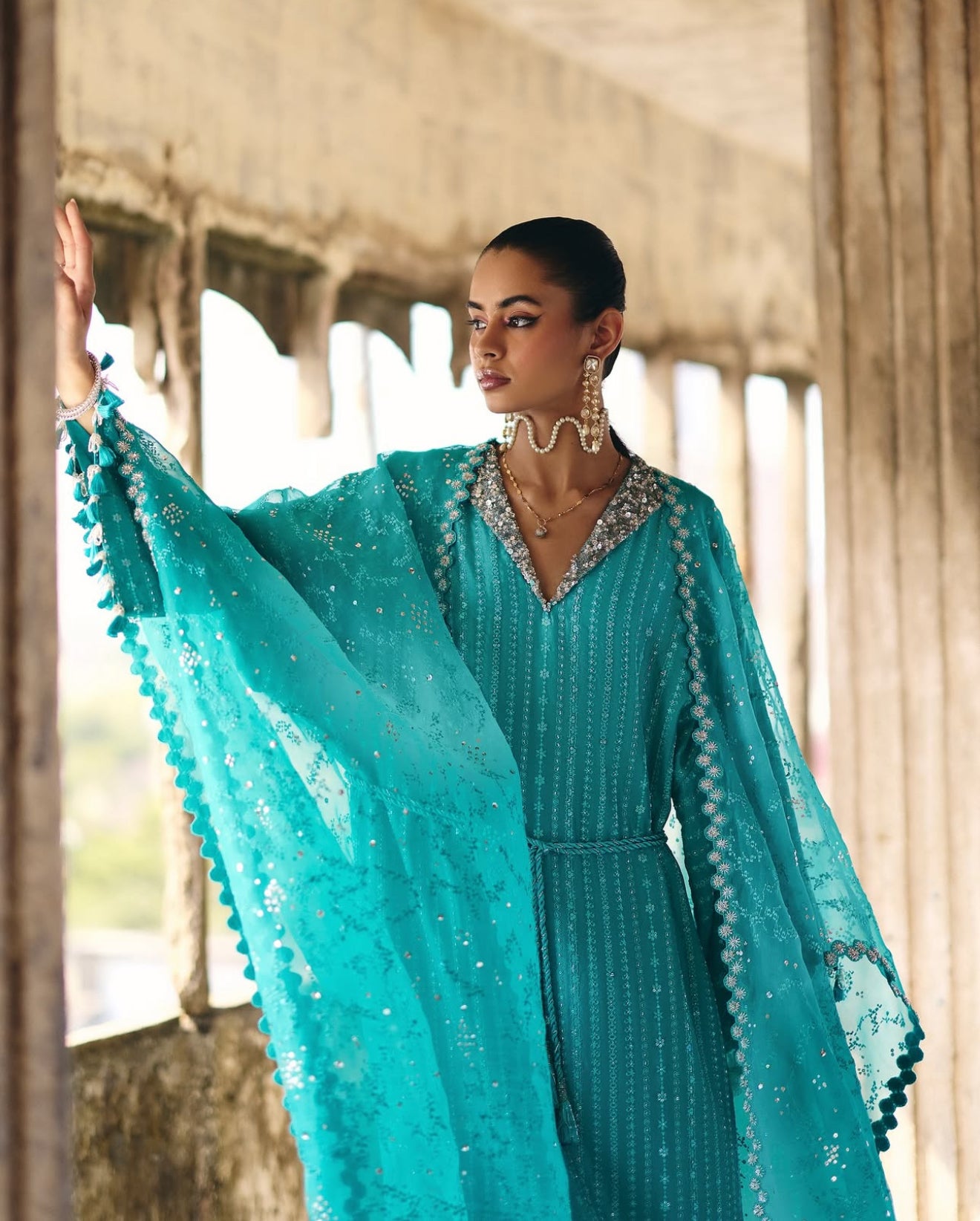 Prepare to be captivated by a stunning ensemble consisting of three total pieces that effortlessly blend elegance and sophistication. Naida is an aqua teal silk kaftaan-cut shirt features intricate all-over embroidery and dazzling ornamentation, highlighted by a collared neckline adorned with exquisite sequin and stone details in a V-shape. Its loose sleeves are accentuated with stylish tassels for added flair, and the accompanying belt cinches the waist to elevate the overall silhouette. The straight silk pants complement the shirt perfectly, while the organza dupatta serves as an exquisite self-textured cape, adorned with silver accents and a heavily ornamented patti that elegantly borders the corners. This luxurious outfit is sure to make a statement at any regal occasion.