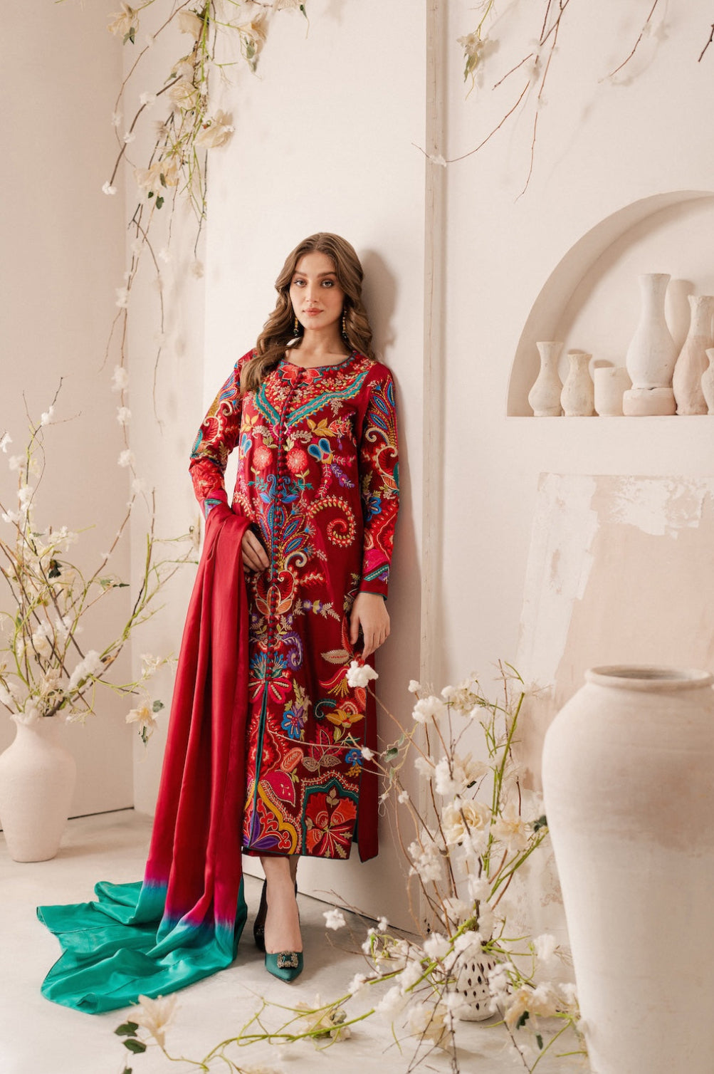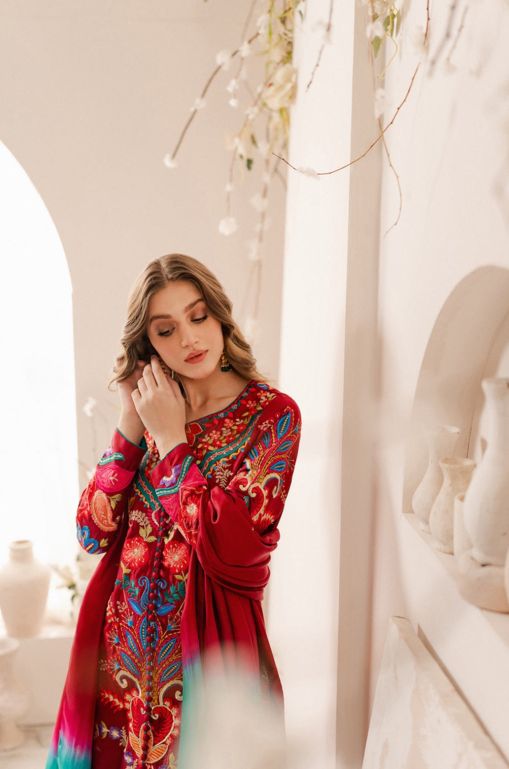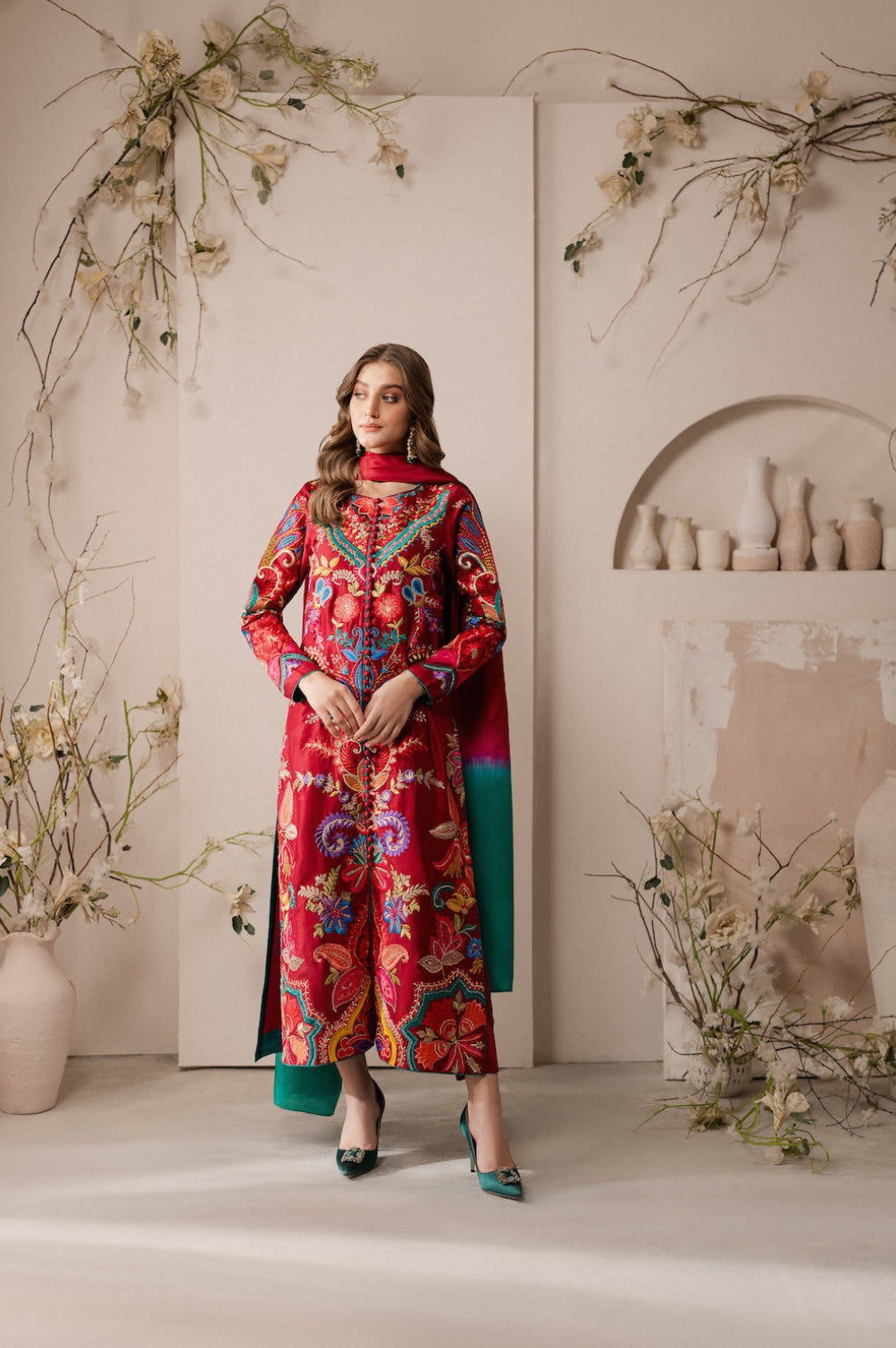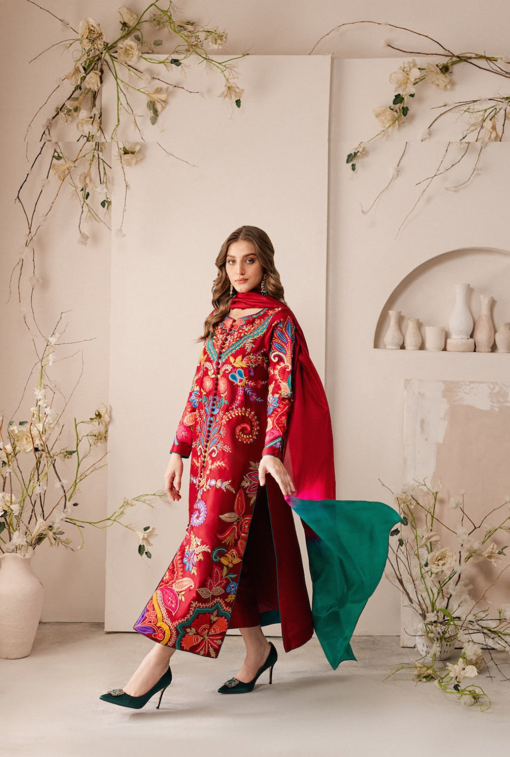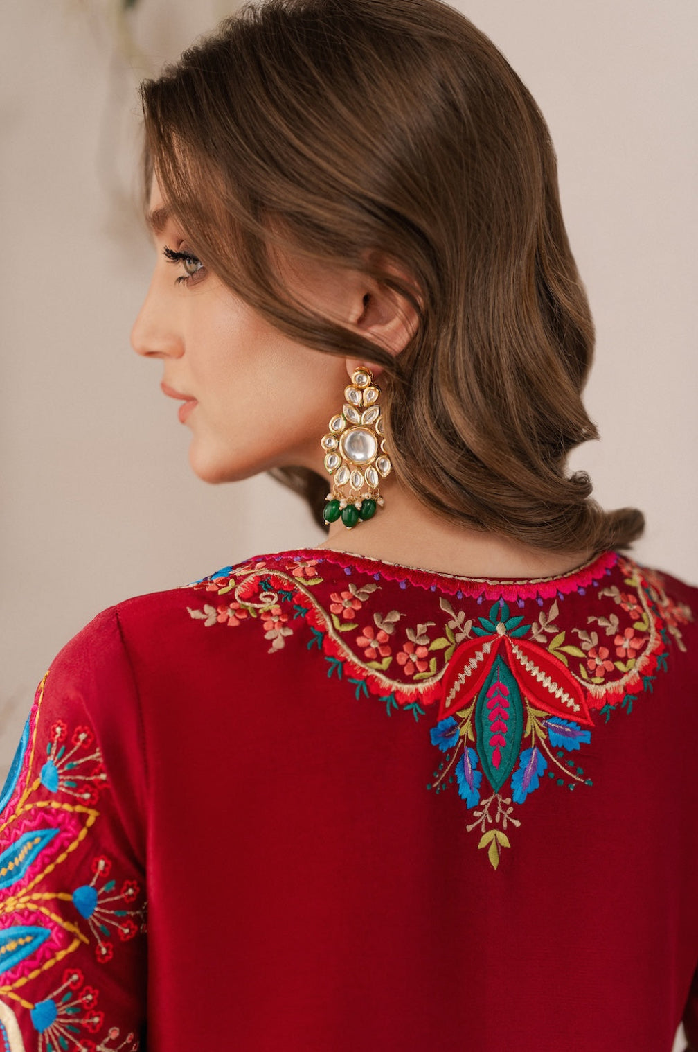 Putting our best foot forward for the woman who finds her spot in every celebration, a poetic ensemble in flaming hot maroon color. This splendid rawsilk piece showcases timeless crafts with handcrafted threadwork and applique detailing. It’s that ONE stunning ensemble in your wardrobe that you can have as a keepsake.