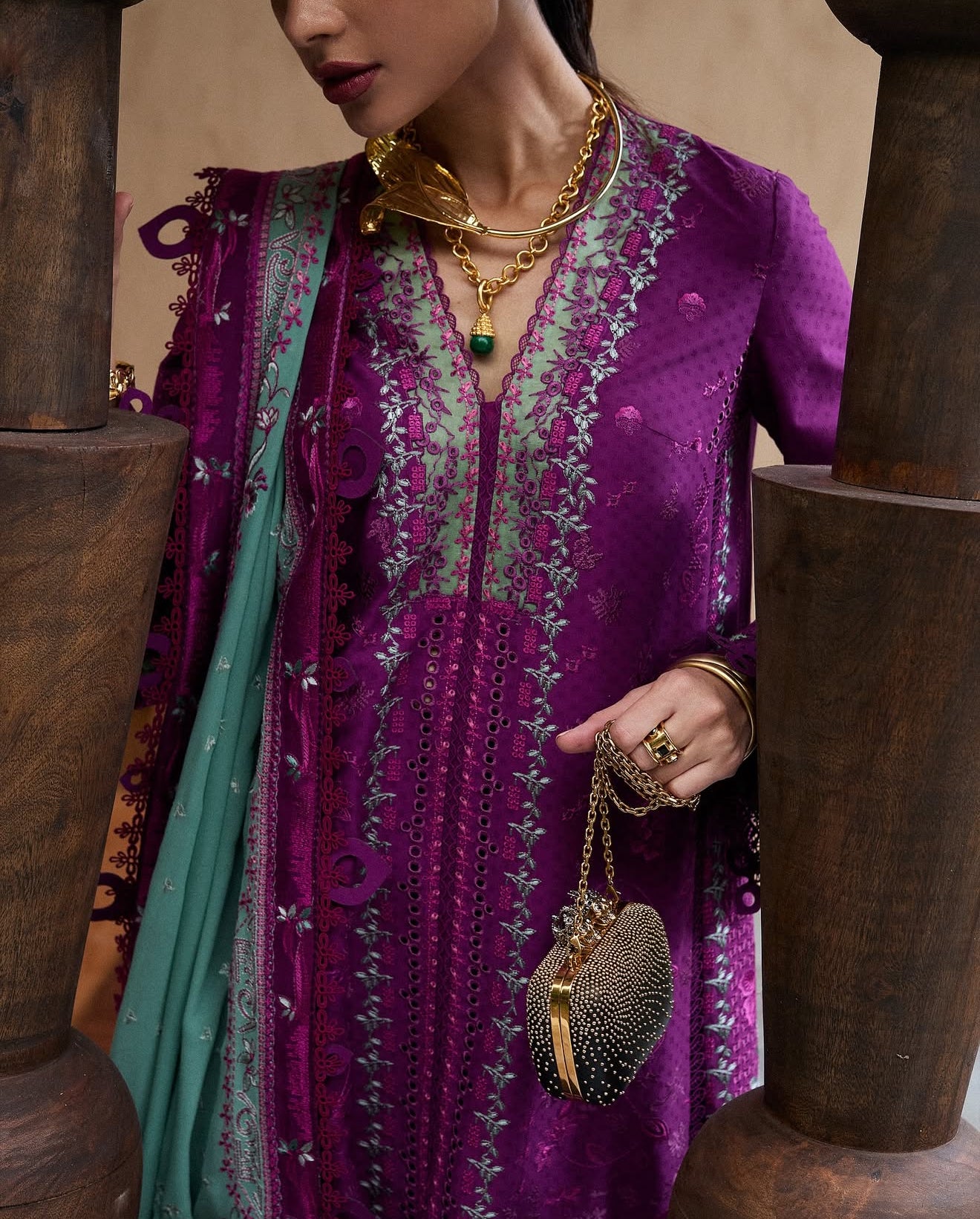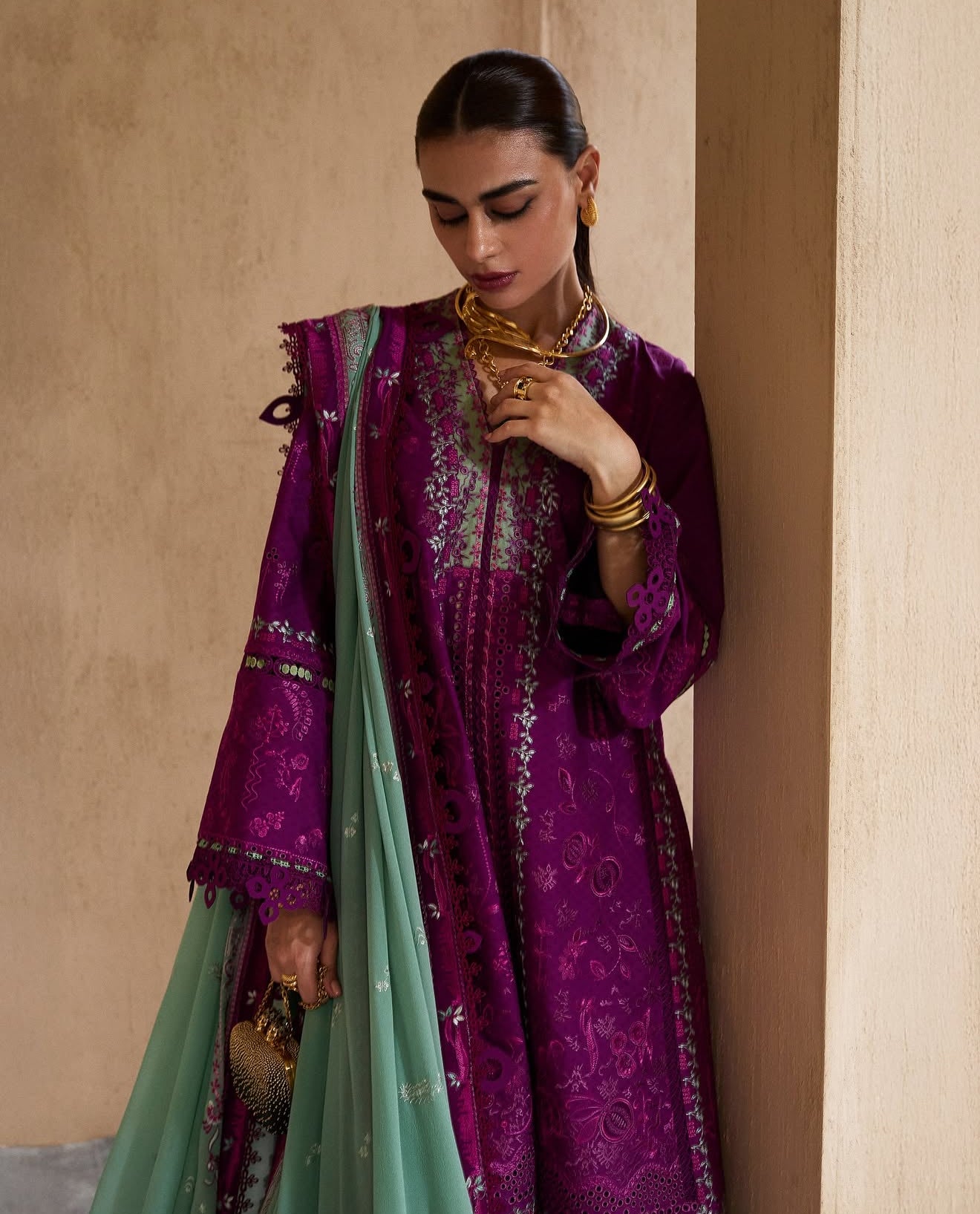 Cradled between spring and summer, our new collection beautifully merges heritage with a fresh perspective. Imagine yourself wearing an exquisite plum jacquard cotton shirt, embellished with subtle monotone embroidery and detailed four-panel design.When complemented by a stone green chiffon dupatta, featuring stunning embroidery and chic plum borders, this outfit exudes grace and refinement with a cambric trouser, Ideal for Eid festivities, it truly embodies the essence of timeless elegance.