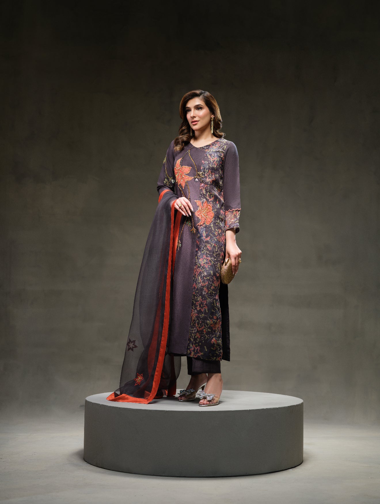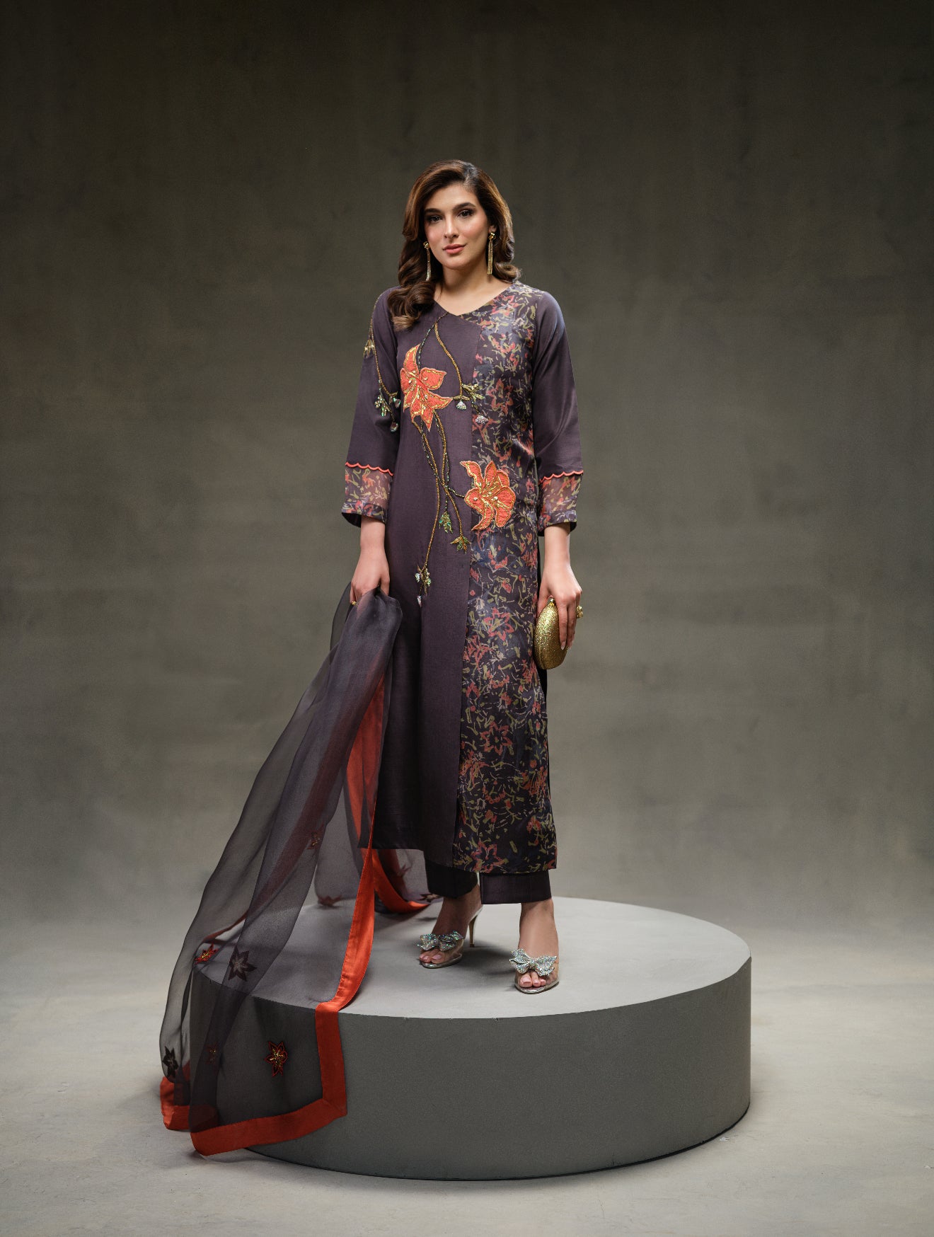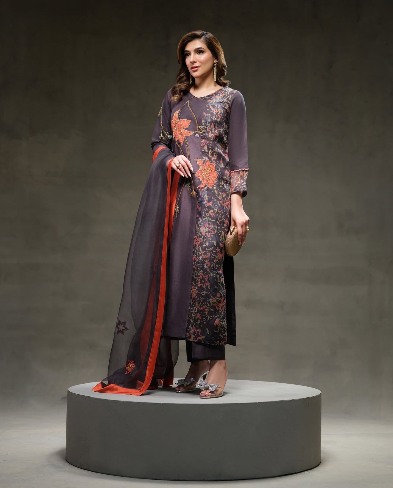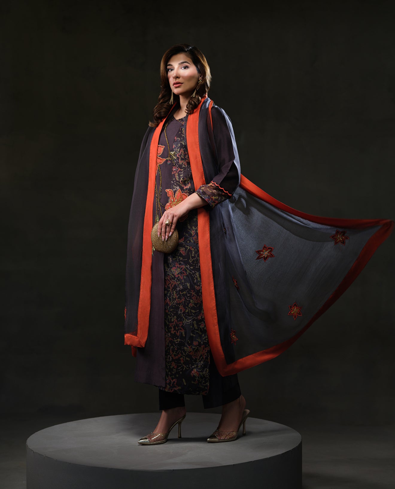 Ombra is a luxurious ensemble that blends timeless craftsmanship with modern elegance. Featuring a long A-line shirt with straight pants and a side-slit silhouette, it exudes grace and sophistication. Crafted from raw silk and printed organza, the outfit showcases intricate appliqué flowers, machine embroidery, and embellishments like pearls, bethki, sitari, beads, dabka, and kundan. A delicate organza dupatta with floral motifs and shimmering sitara work adds an enchanting finishing touch, making Ombra a statement of refined opulence.
