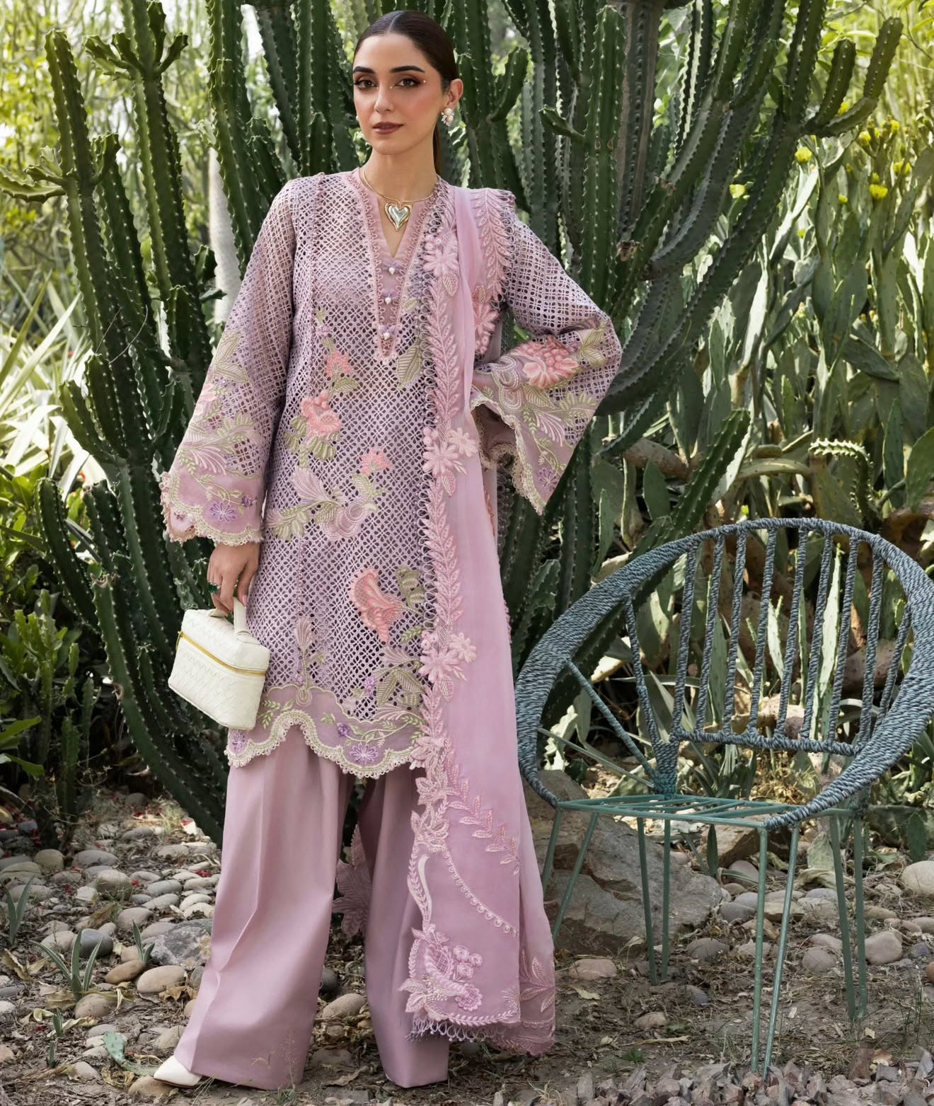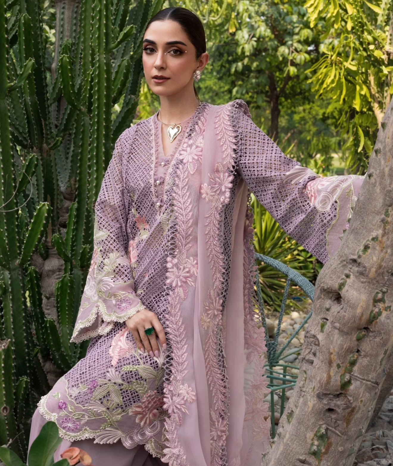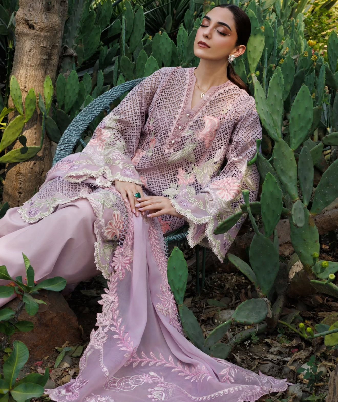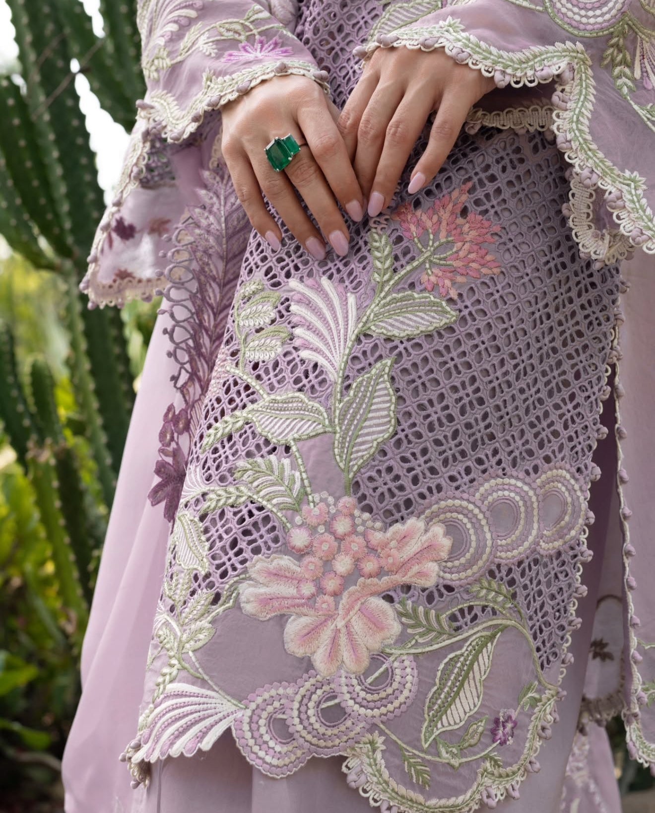 One True Love features meticulously cutworked front and sleeves broken up by absolutely beautiful oriental floral sceneries in beautiful pastels that were sketched by hand over several weeks. The asymmetric double layered dupatta pallus are reminiscent of an oriental oil painting. The entire gorgette chiffon dupatta is completed with sketched oriental flowers and oversized cutwork leaves. At Crimson, its the details that are the difference - the way the pallu naturally lends itself to creating beautiful and very impactful cutwork edge or the subtle pointilism in the shirts florals adding volumes to the embroidery or even the shade of lavender perfected over hundreds of samples. When you buy Crimson, you don't just buy an outfit. You buy a piece of our hearts and minds created from a lifetime of artistic experiences.