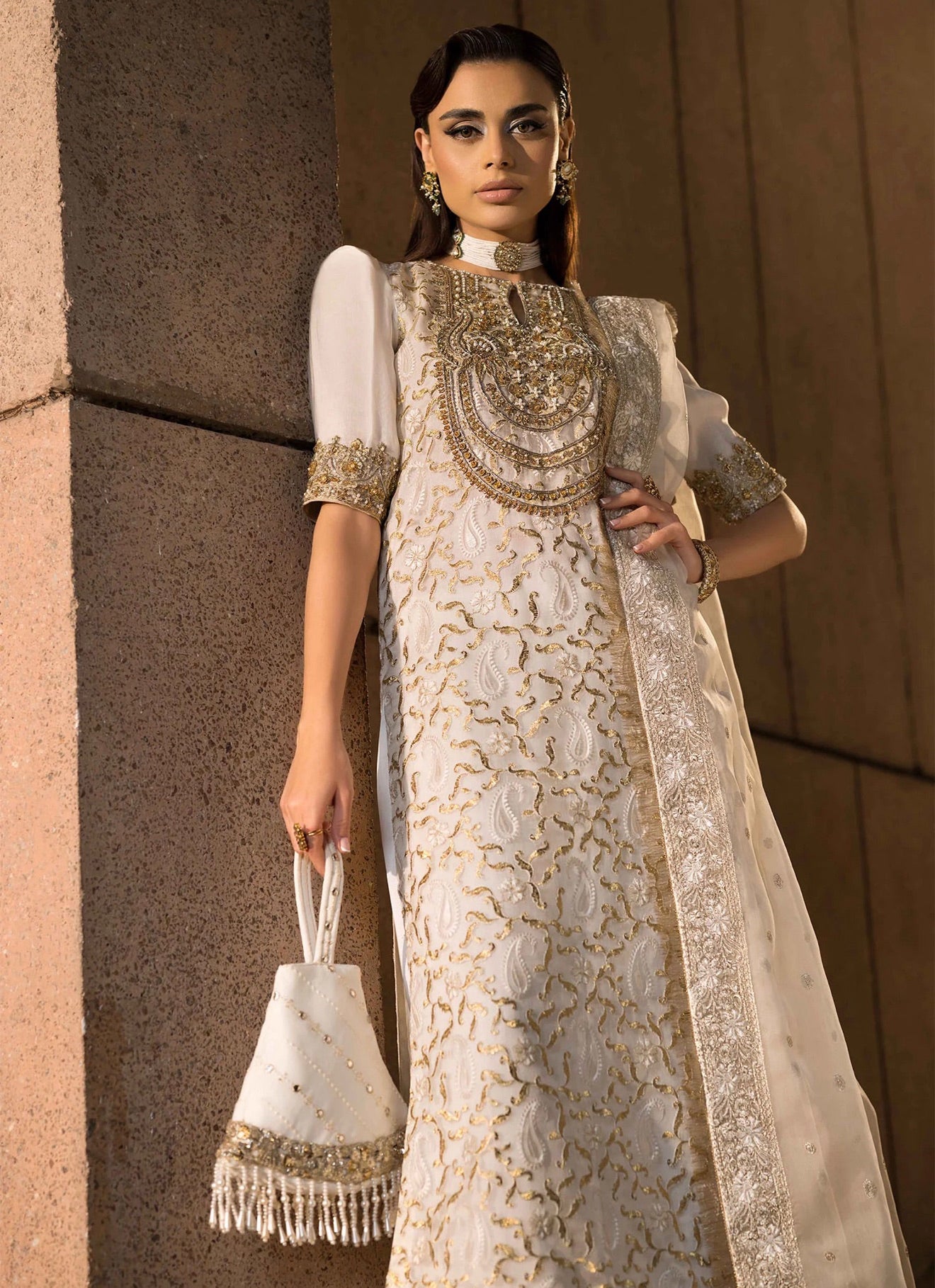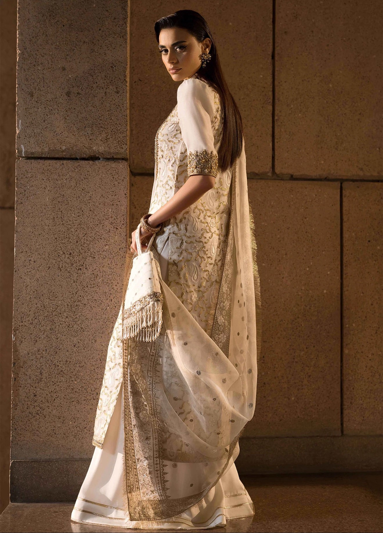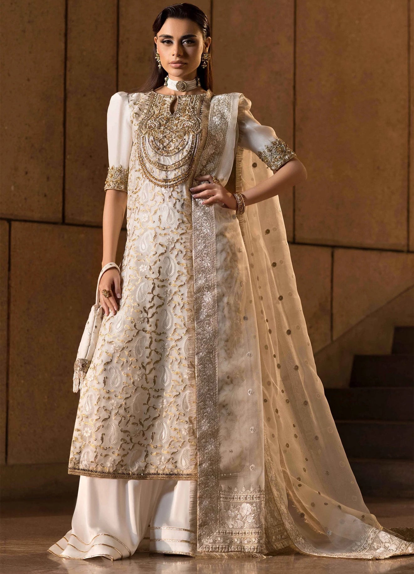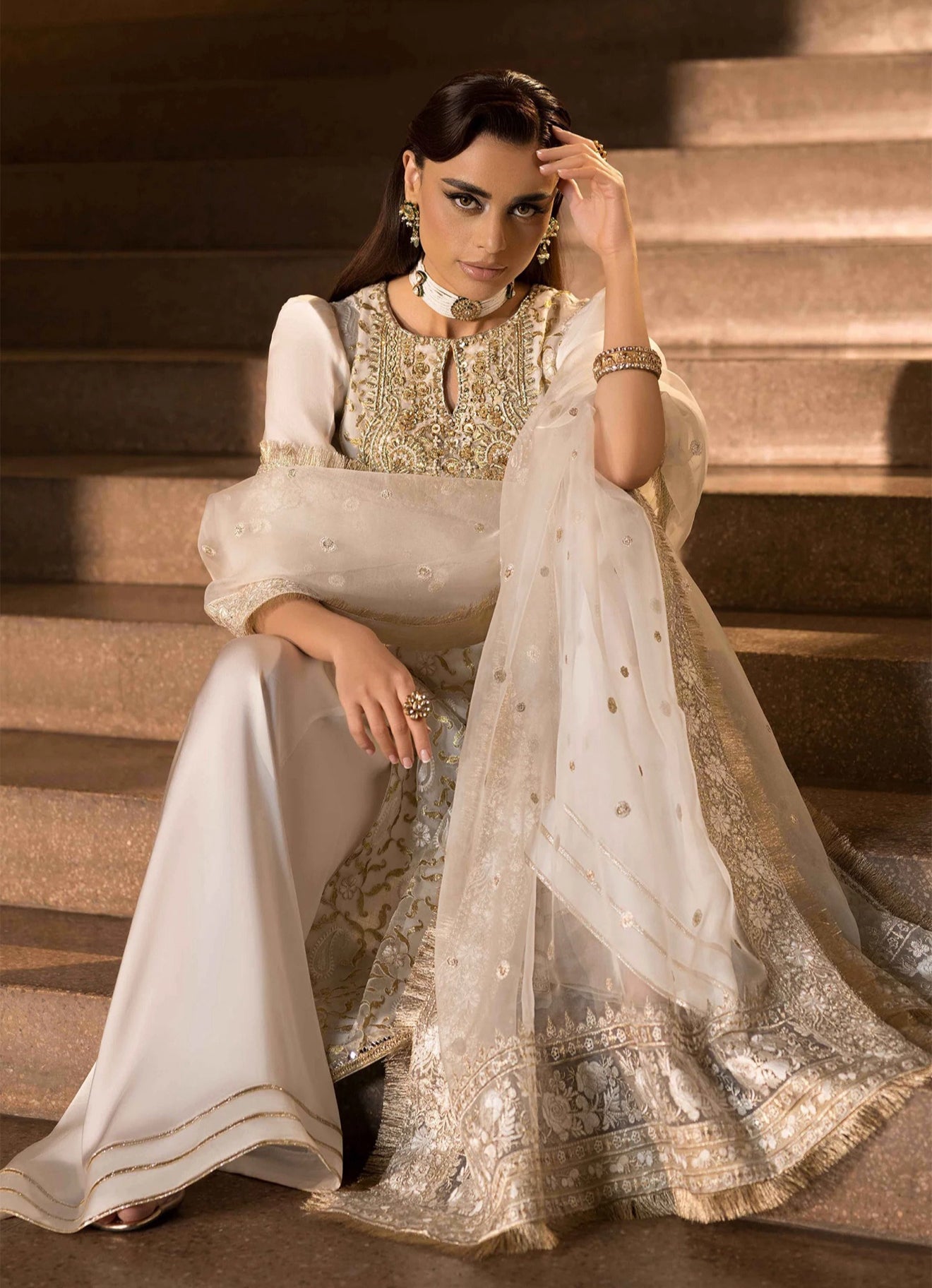 *Pearl* is a stunning fusion of organza and meticulous craftsmanship. The organza shirt, featuring captivating hand-embellished details with dabka, kora, pearls, and crystals, boasts an intricately embroidered neckline and borders, adding an air of sophisticated luxury. Paired with silk flared pants, the ensemble offers a chic and flattering silhouette. Completing the look is a fully embroidered organza dupatta, adorned with a delicate spray of bootis that shimmer with every movement. *Pearl* strikes the perfect balance between opulence and elegance, designed for those who appreciate the finer details.