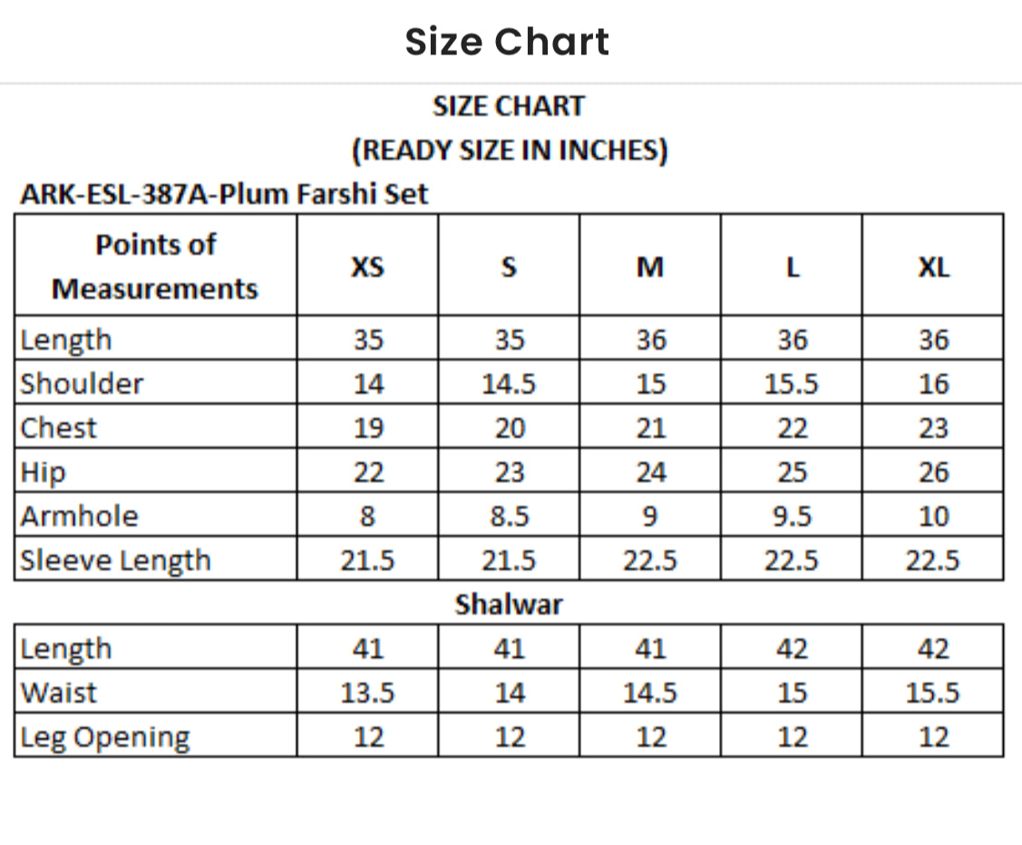 Let's get you into the seasons craze: Plum Farshi Set! An embroidered short shirt and signature farshi shalwar are enhanced by a medium silk dupatta featuring meticulously embroidered patches. Perfect choice for your summer gatherings.