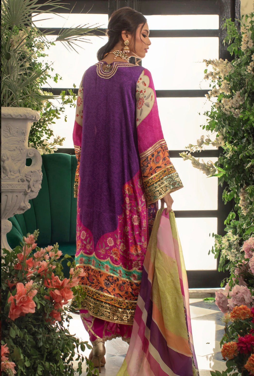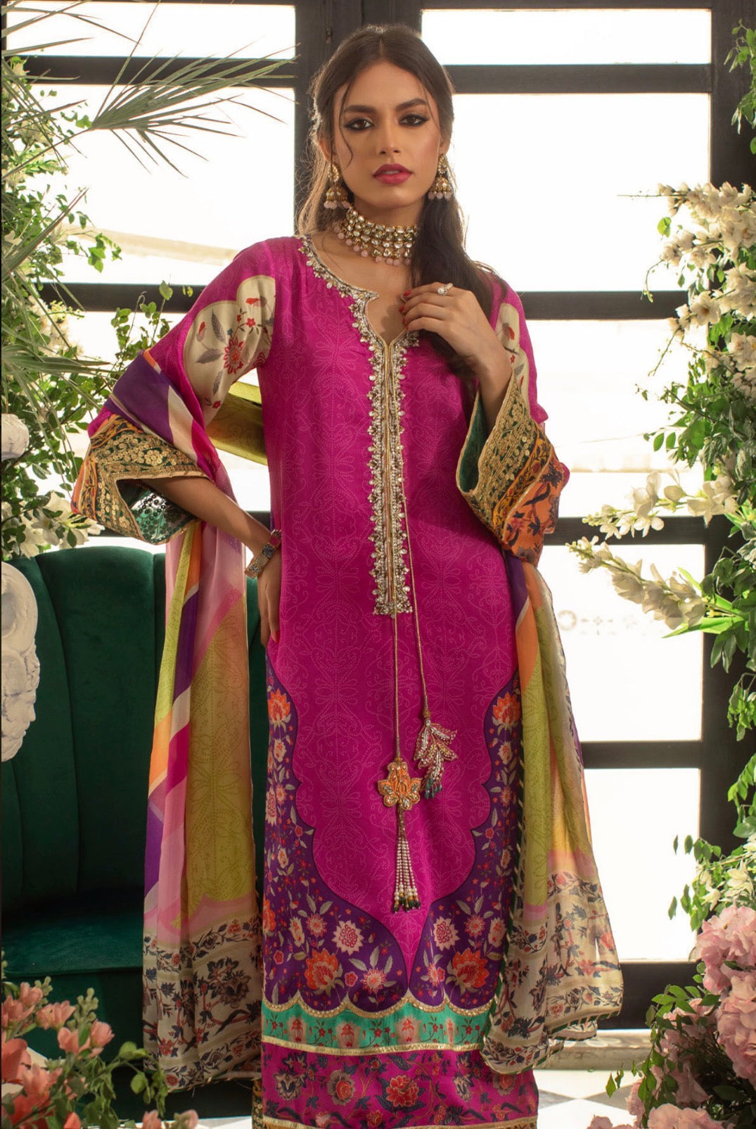 Long silhouette shirt in gorgeous shade of fuchsia, aubergine and sea green featuring subtle chunri print details. The hem is adorned with organza panel featuring sequins details. The centre front is adorned with handcrafted zardozi and resham tassels. The outfit comes with multicoloured silk dupatta featuring gota finishing and is paired with izaar featuring gota details on hem.