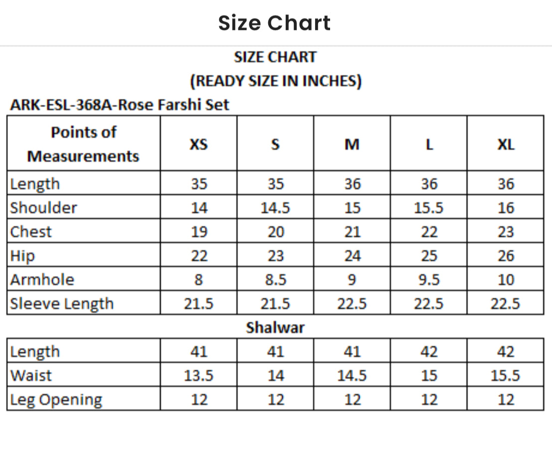 Let's get you into the seasons craze: Rose Farshi Set! An embroidered short shirt and signature farshi shalwar are enhanced by a medium silk dupatta featuring meticulously embroidered patches. Perfect choice for your summer gatherings.
