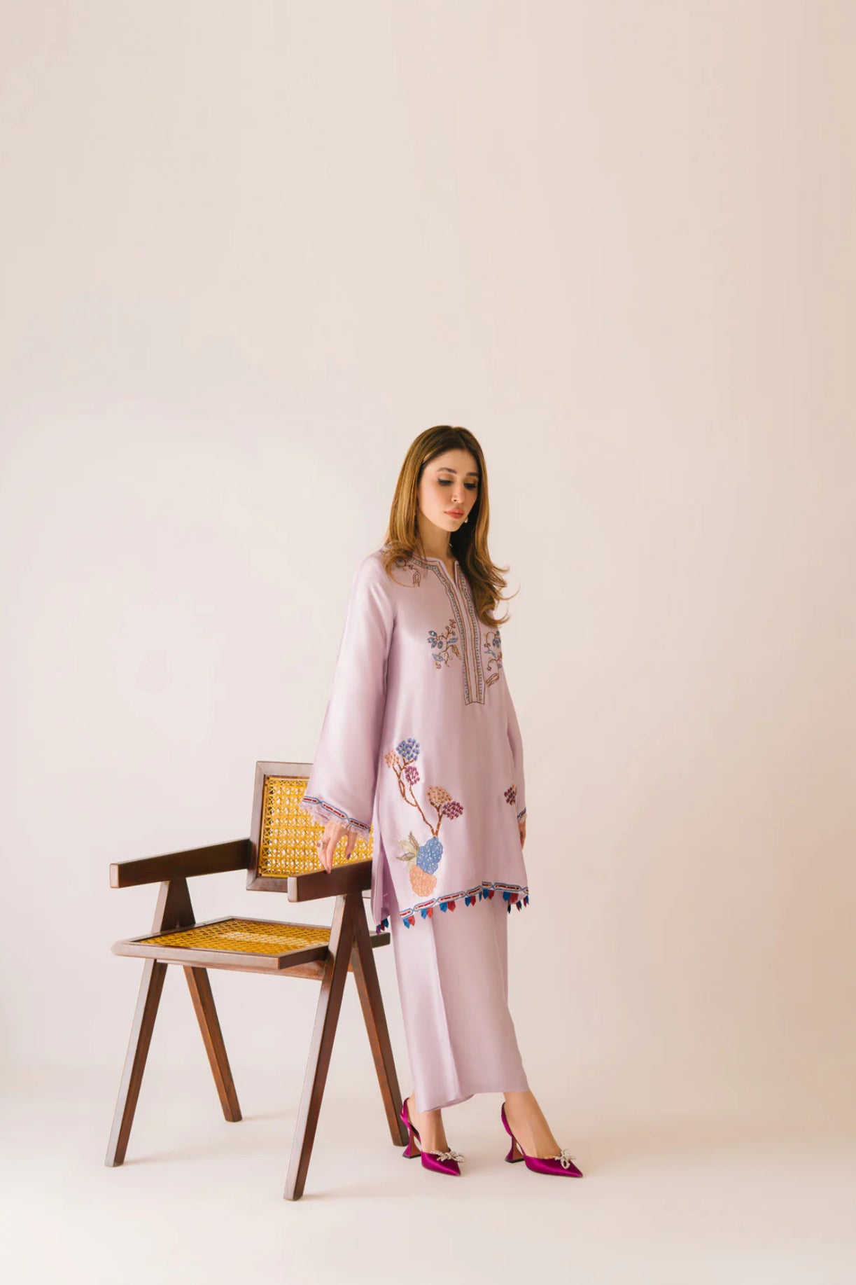 Pure sheesha silk short shirt with multi cored appliqué, embroidery, mirror work and sequins spray. Daaman finished with multi coloured organza finishing and sleeves. Paired with short culottes with thread detailing.