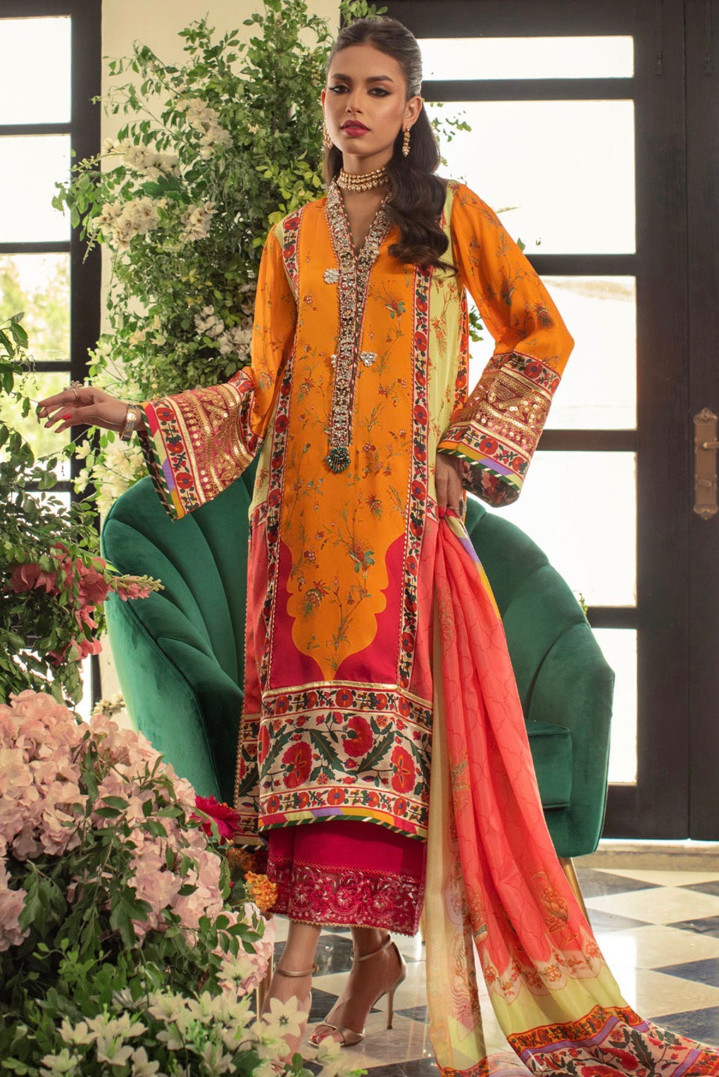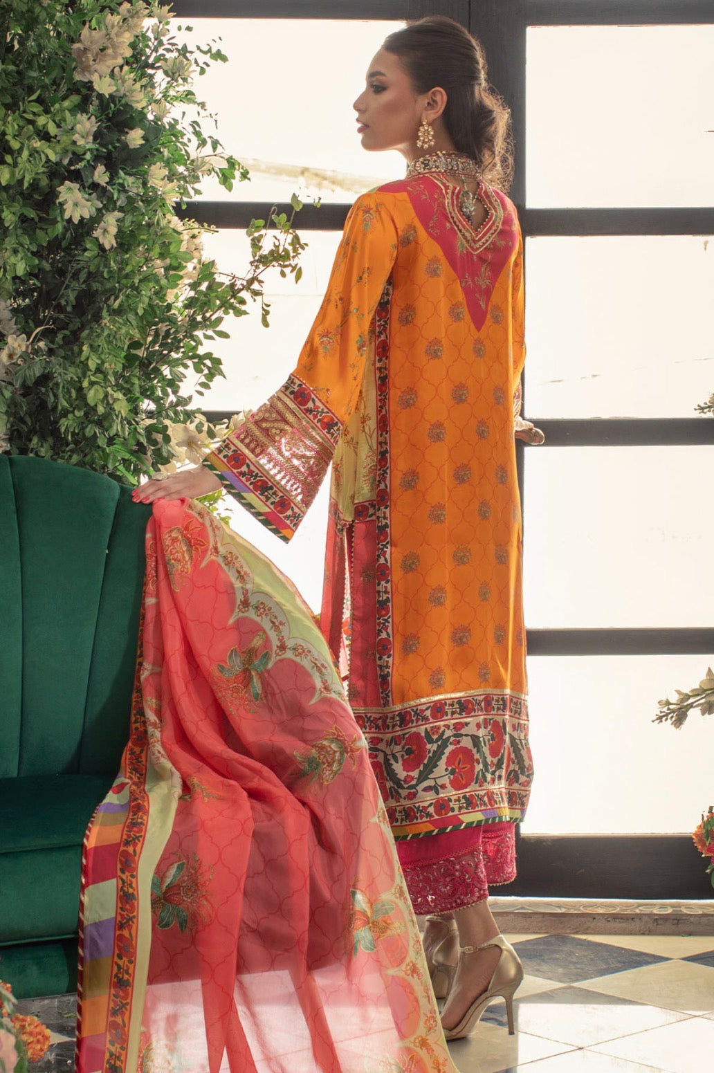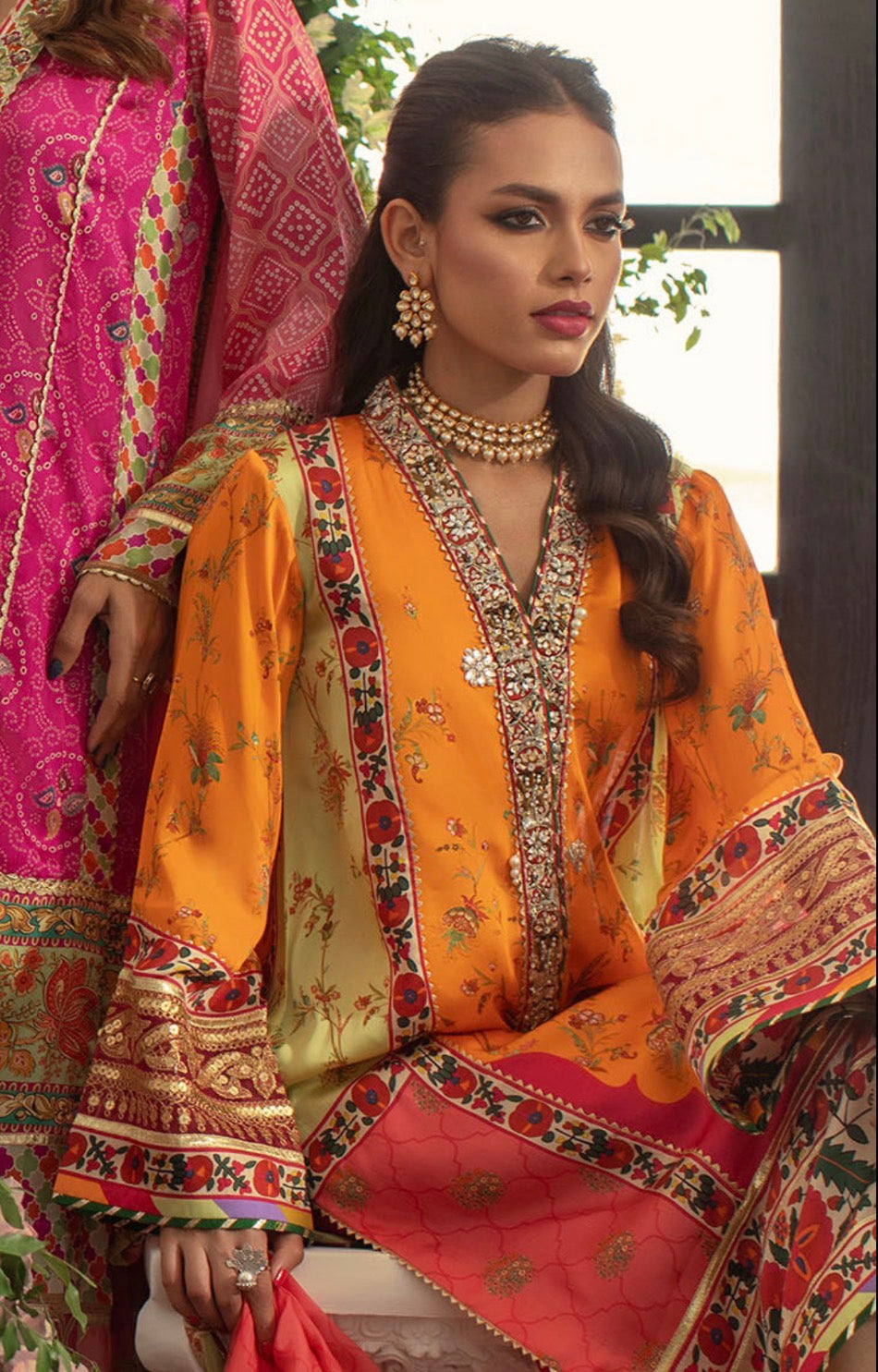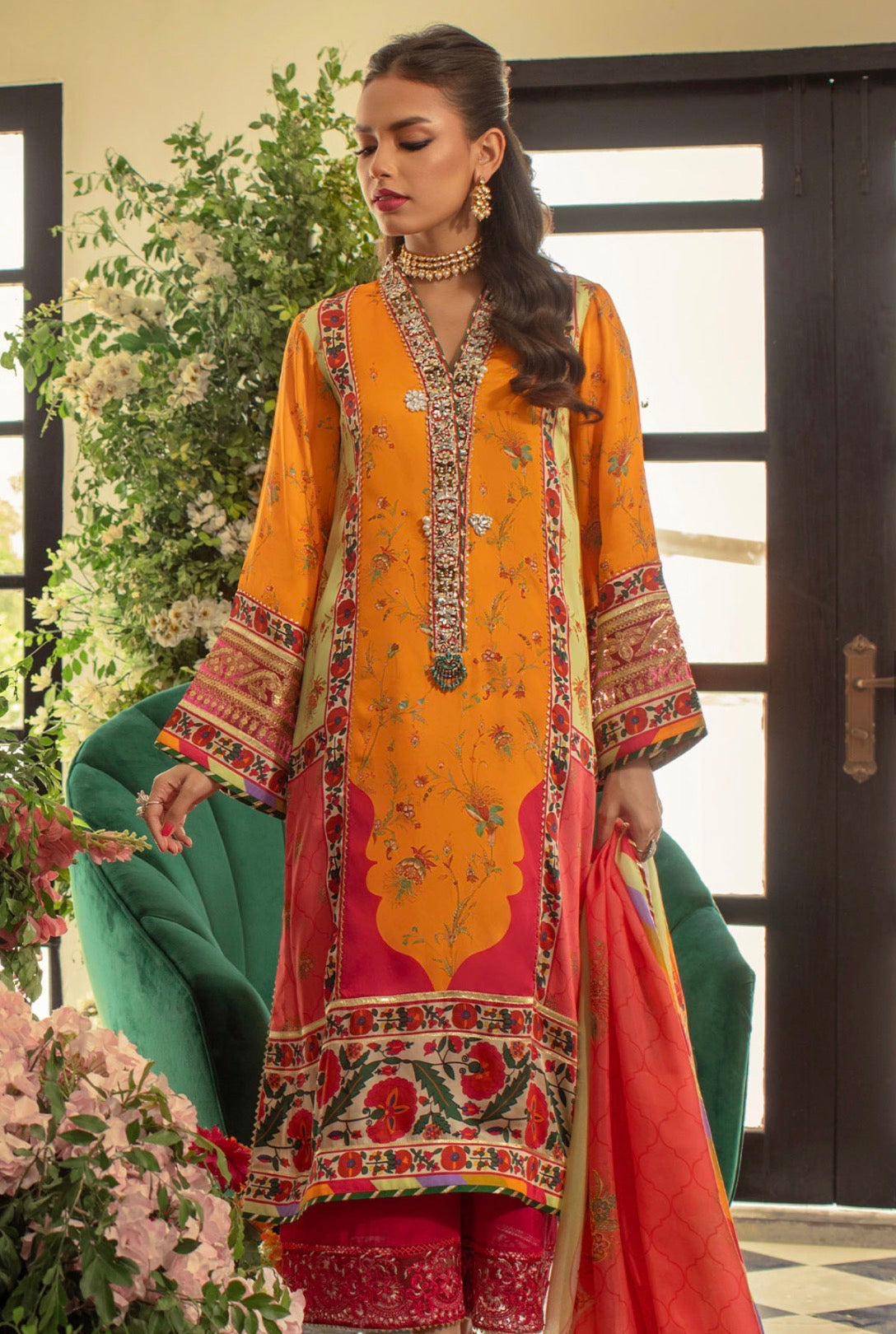 Long silhouette shirt in shades of tangerine and pink featuring floral details on front and back. The neckline is adorned with handcrafted zardozi and gota details. The shirt comes with silk printed dupatta and can be paired with matching izaar featuring embroidered organza panel on hemline.