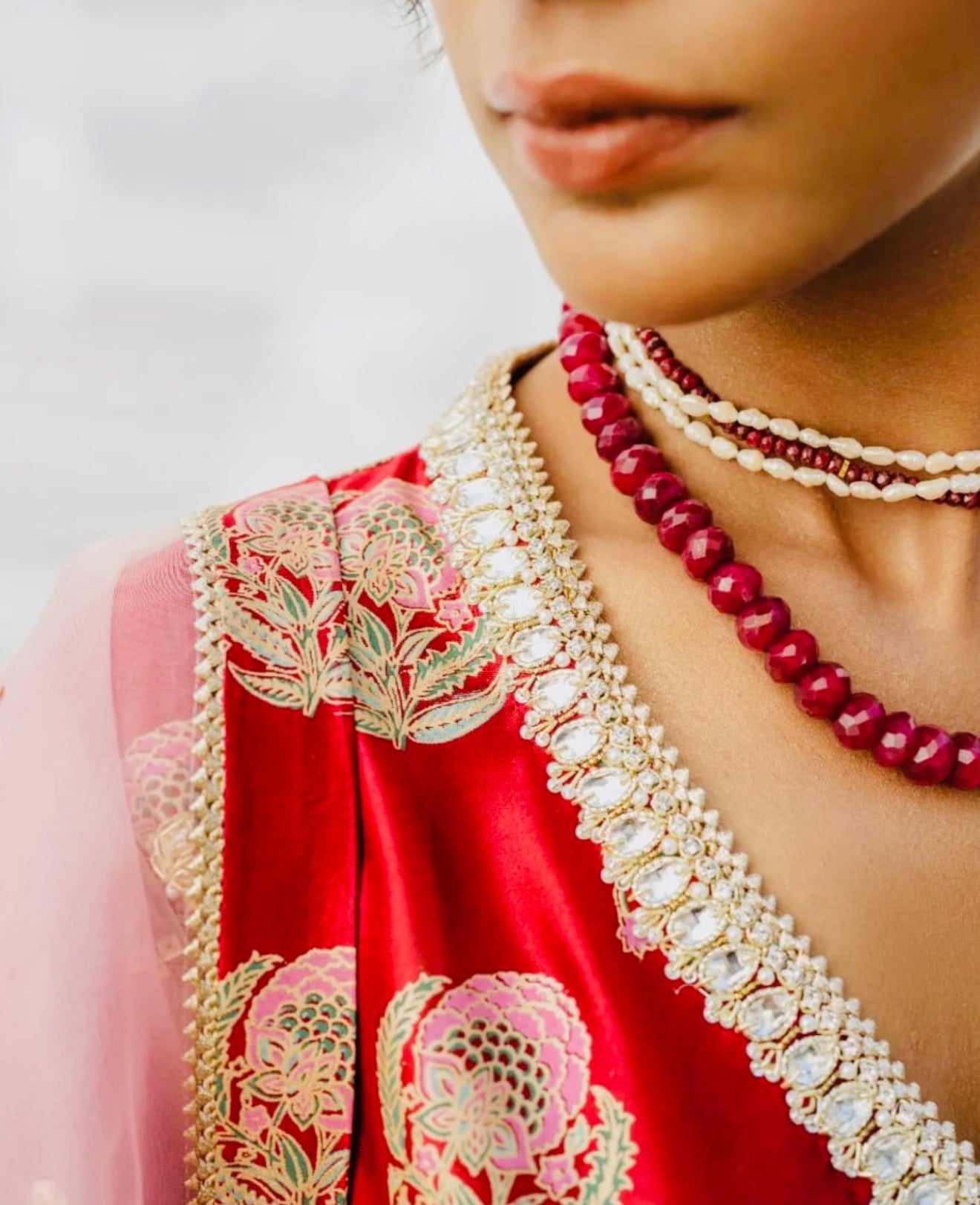 This exquisite silk ensemble features an elegant neckline and sleeves richly hand-embellished in gold, showcasing meticulous craftsmanship. The outfit is complemented by matching silk pants, creating a harmonious and refined silhouette. A contrasting pink organza dupatta adds a delicate, airy layer of texture and color, enhancing the overall sophistication of the look. Ideal for occasions that demand both tradition and contemporary style.