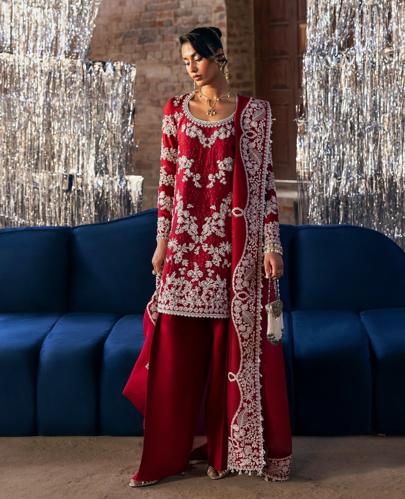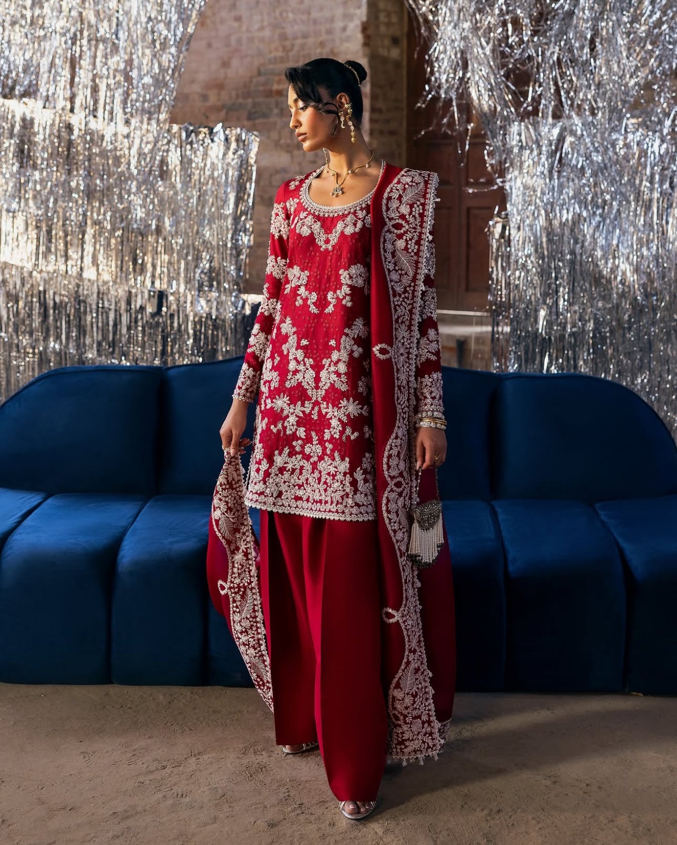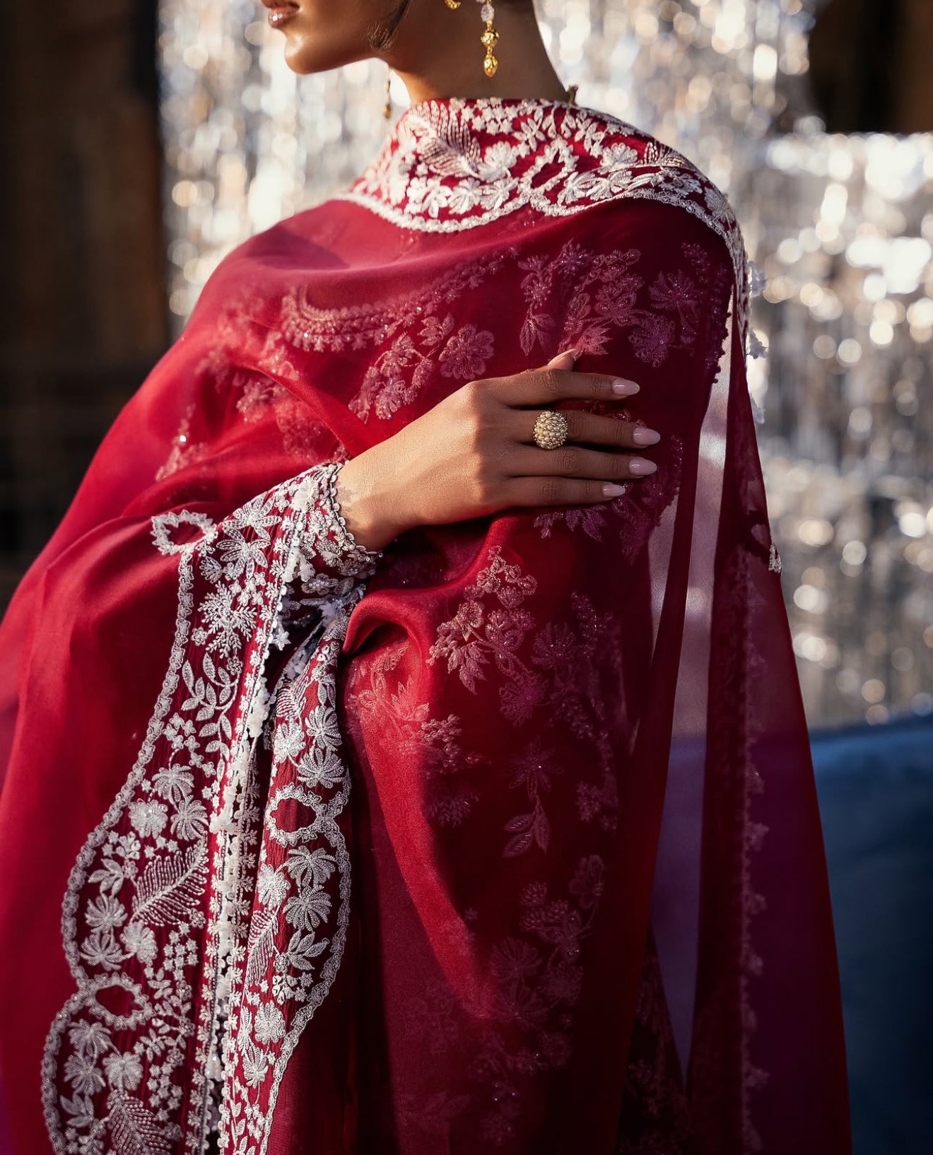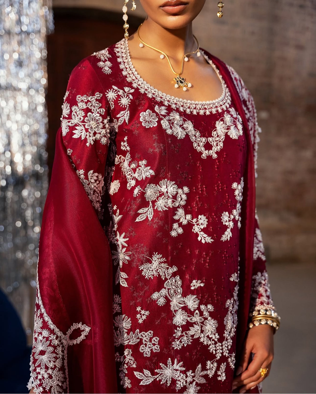 Presenting Seri - a three-piece ensemble in vibrant Cherry Red: the mid-length raw silk shirt features an elegant moon neckline, adorned with intricate embroidery and decorative handwork that flourishes at the hem, complemented by fitted sleeves enhanced with lace and pearl details. With straight, loose pants in the same tone, providing a comfortable yet chic silhouette, while the exquisite organza dupatta showcases a heavy contrast silver border, adorned with floral embroidery and finished with charming tassels.