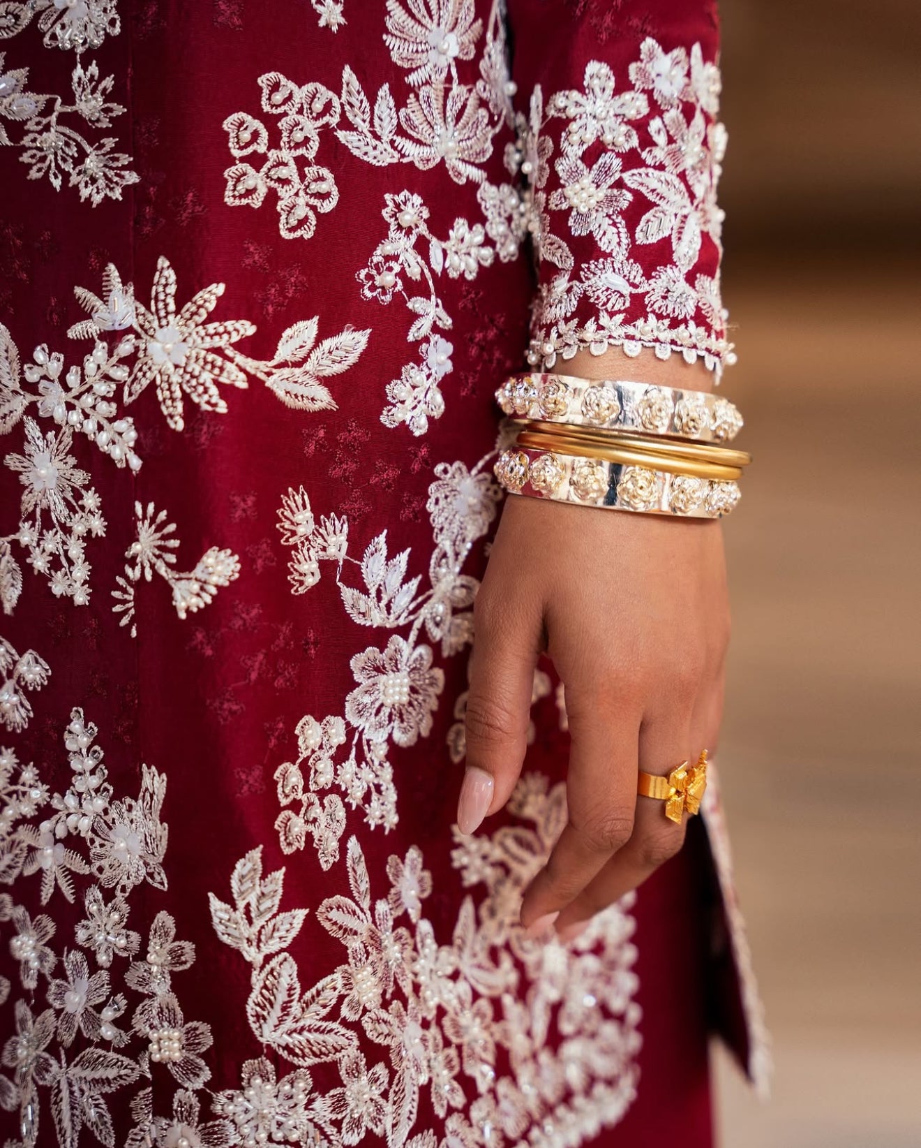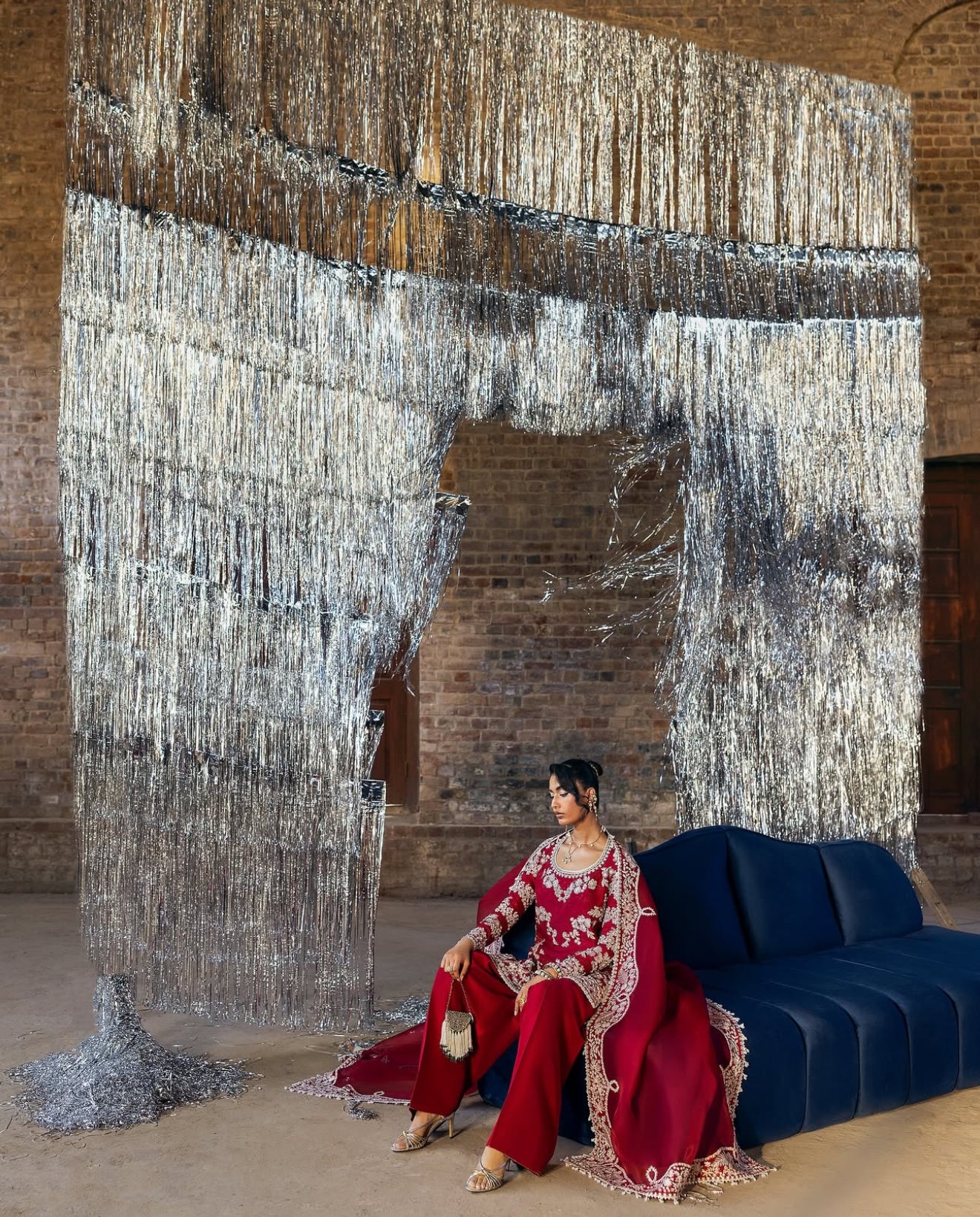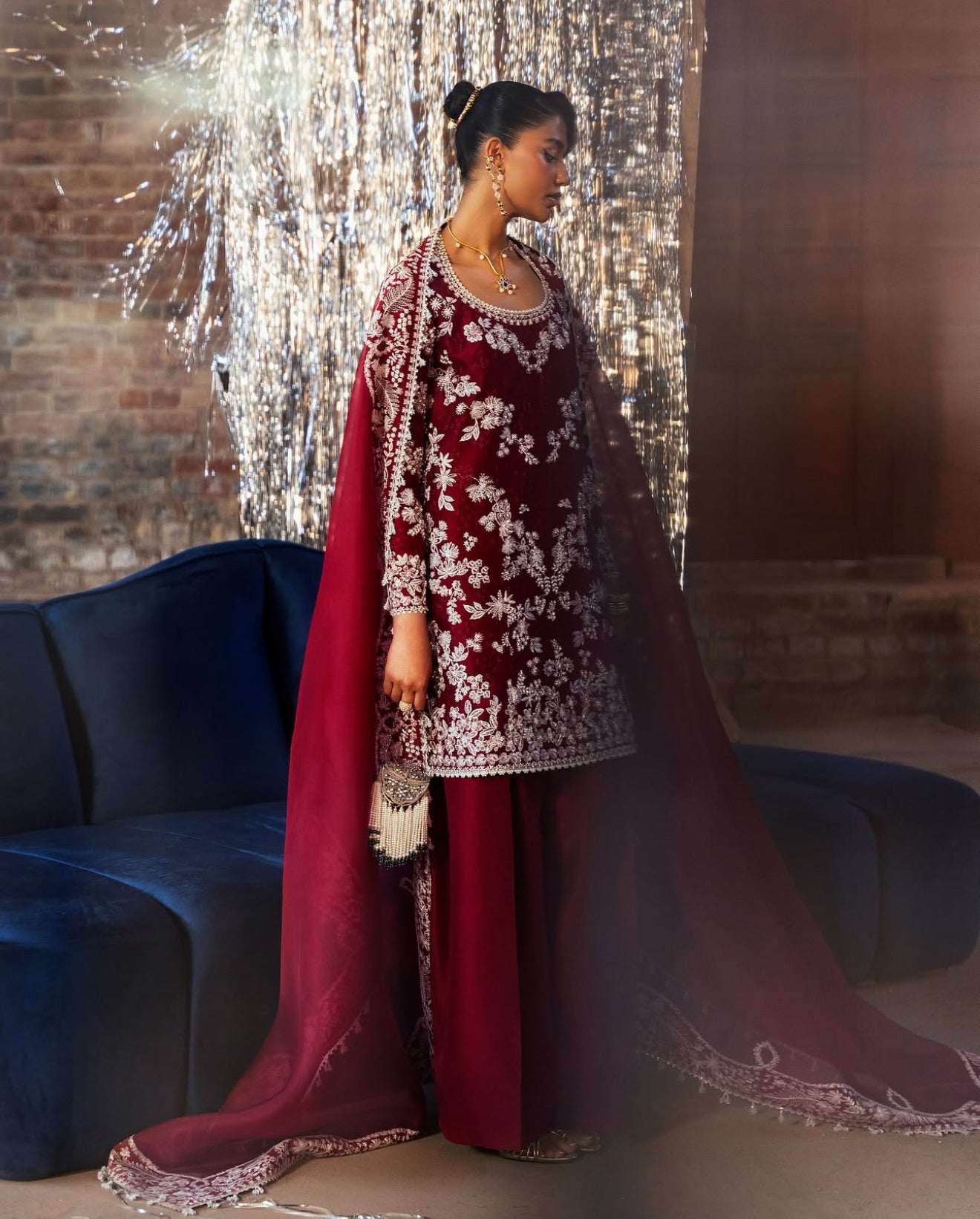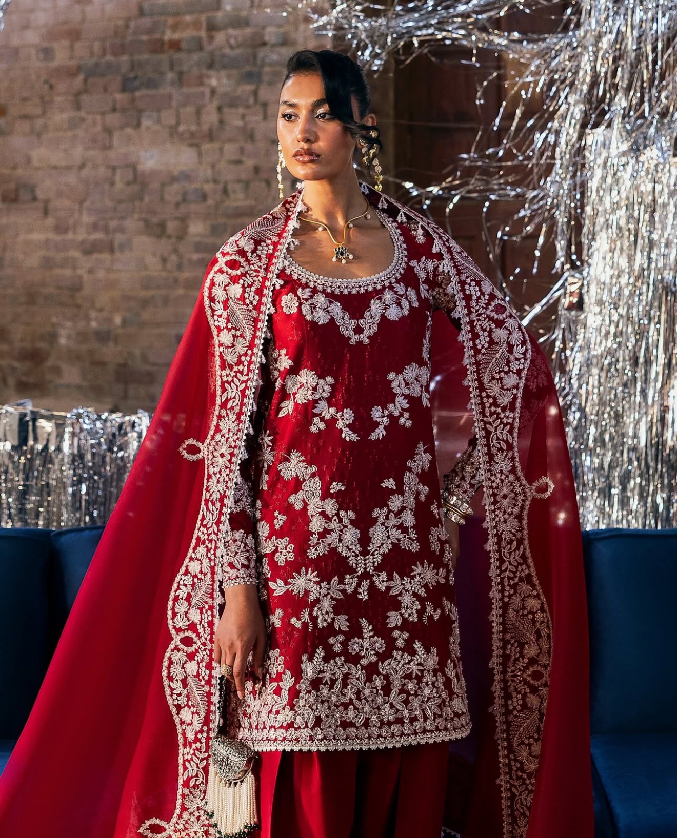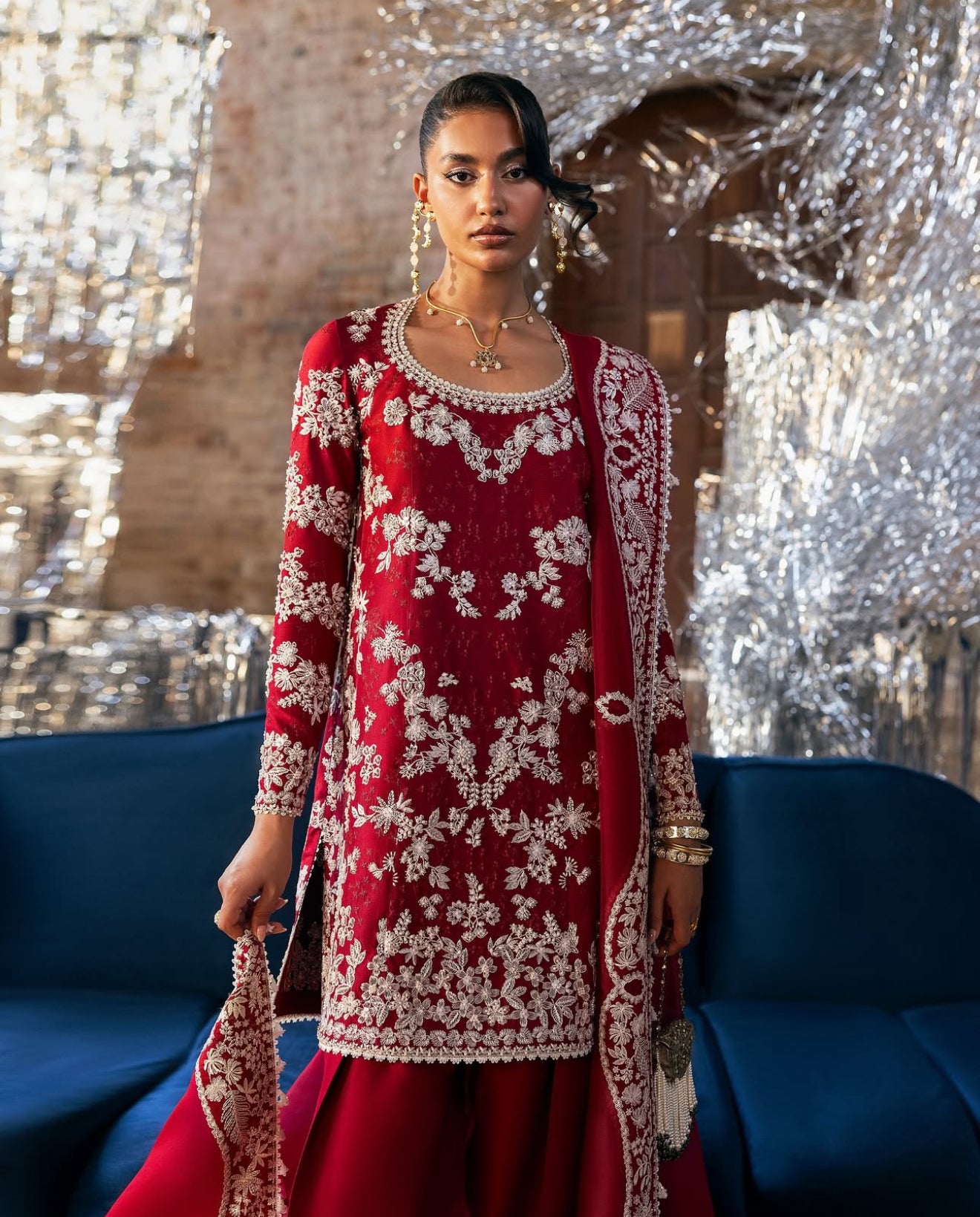 Presenting Seri - a three-piece ensemble in vibrant Cherry Red: the mid-length raw silk shirt features an elegant moon neckline, adorned with intricate embroidery and decorative handwork that flourishes at the hem, complemented by fitted sleeves enhanced with lace and pearl details. With straight, loose pants in the same tone, providing a comfortable yet chic silhouette, while the exquisite organza dupatta showcases a heavy contrast silver border, adorned with floral embroidery and finished with charming tassels.