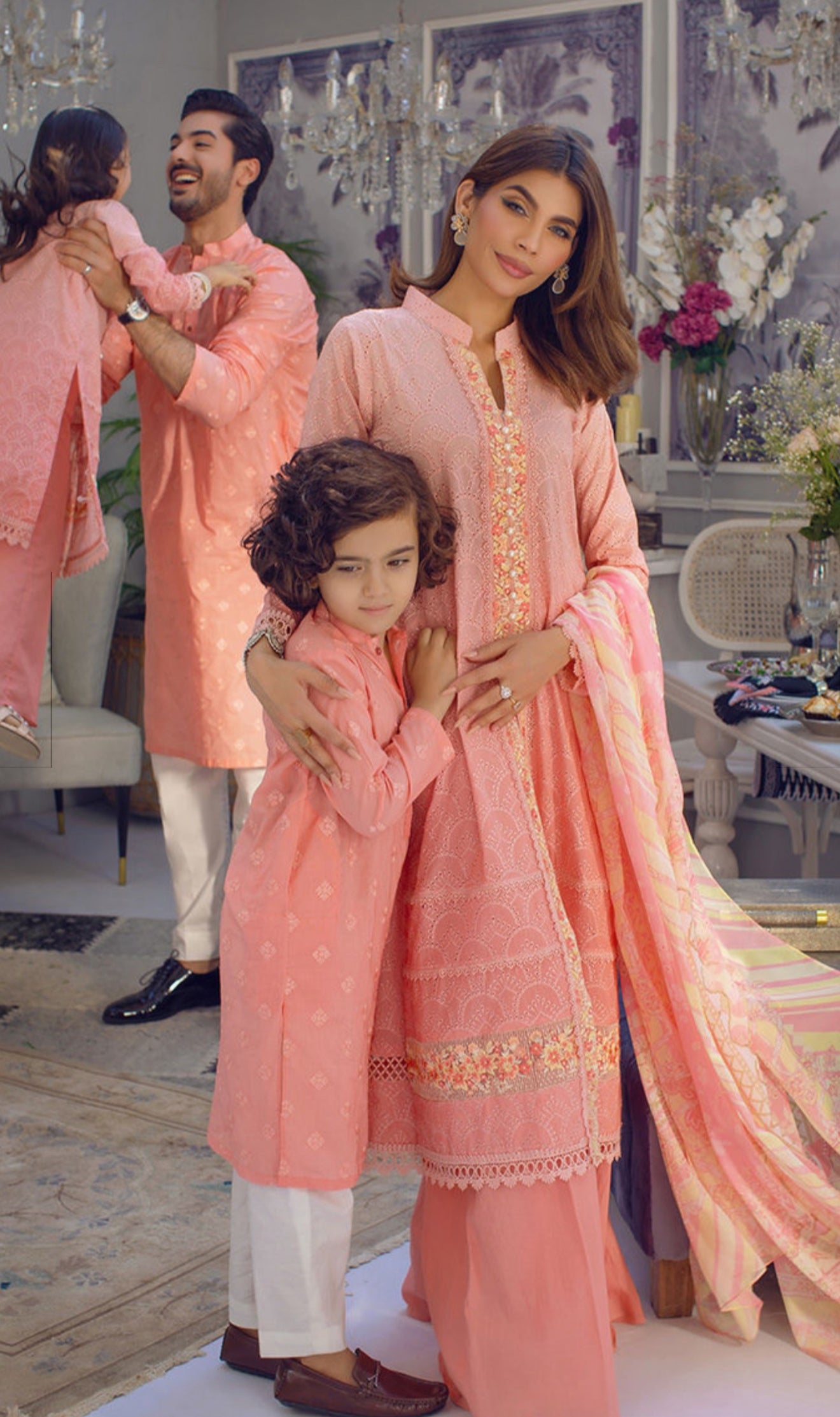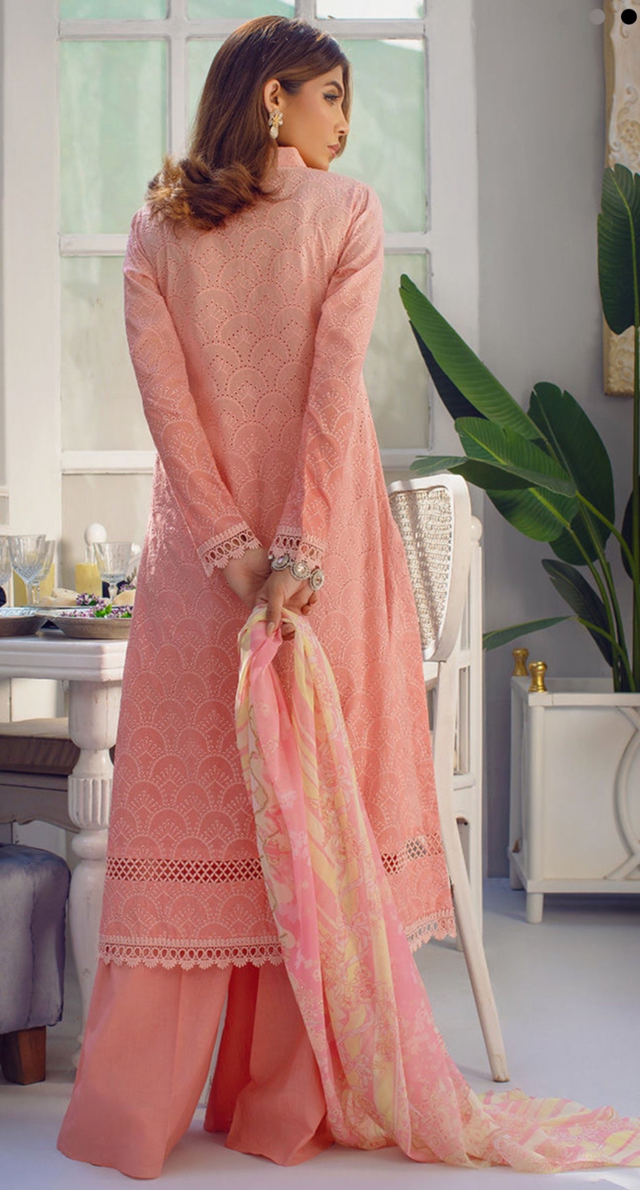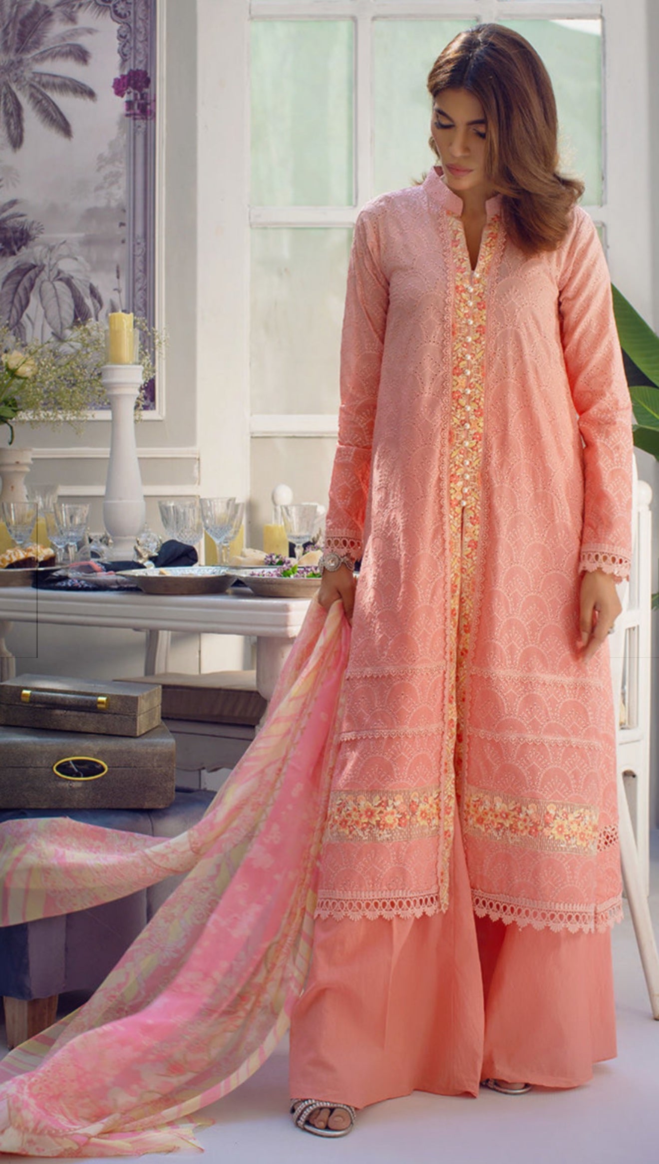 This bespoke Ombré shirt is a true masterpiece, with its schiffli patterns adding a luxurious touch to the fabric. The intricate floral embroidery in rich hues of orange and lime yellow cascades down the length of the shirt, delicately embellish and elevate the design to another level of opulence. Paired with dhaaka pants and a digitally printed medium silk dupatta, this ensemble is the epitome of sophistication and grace.