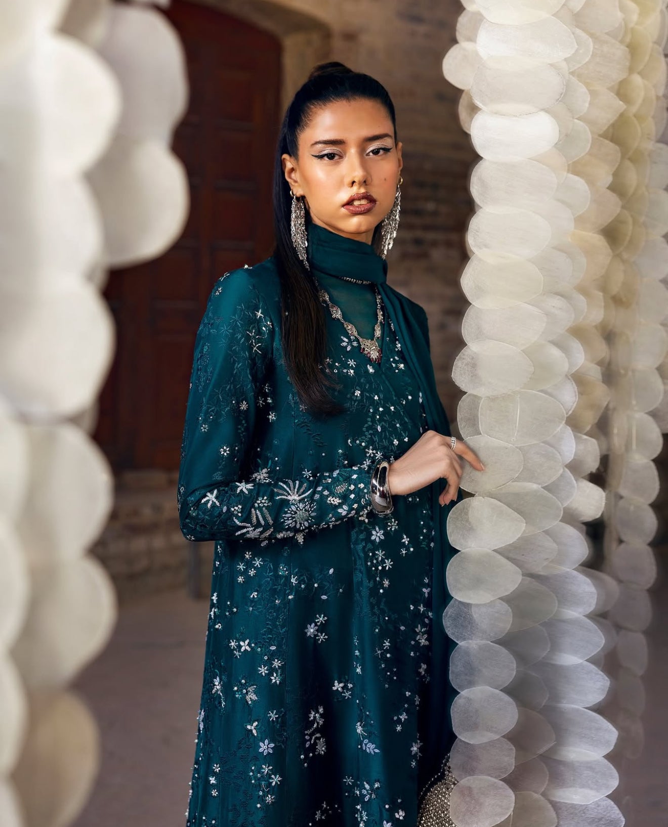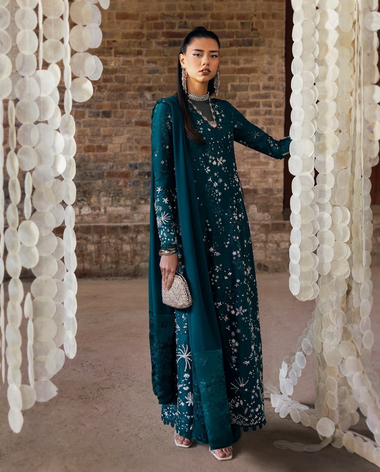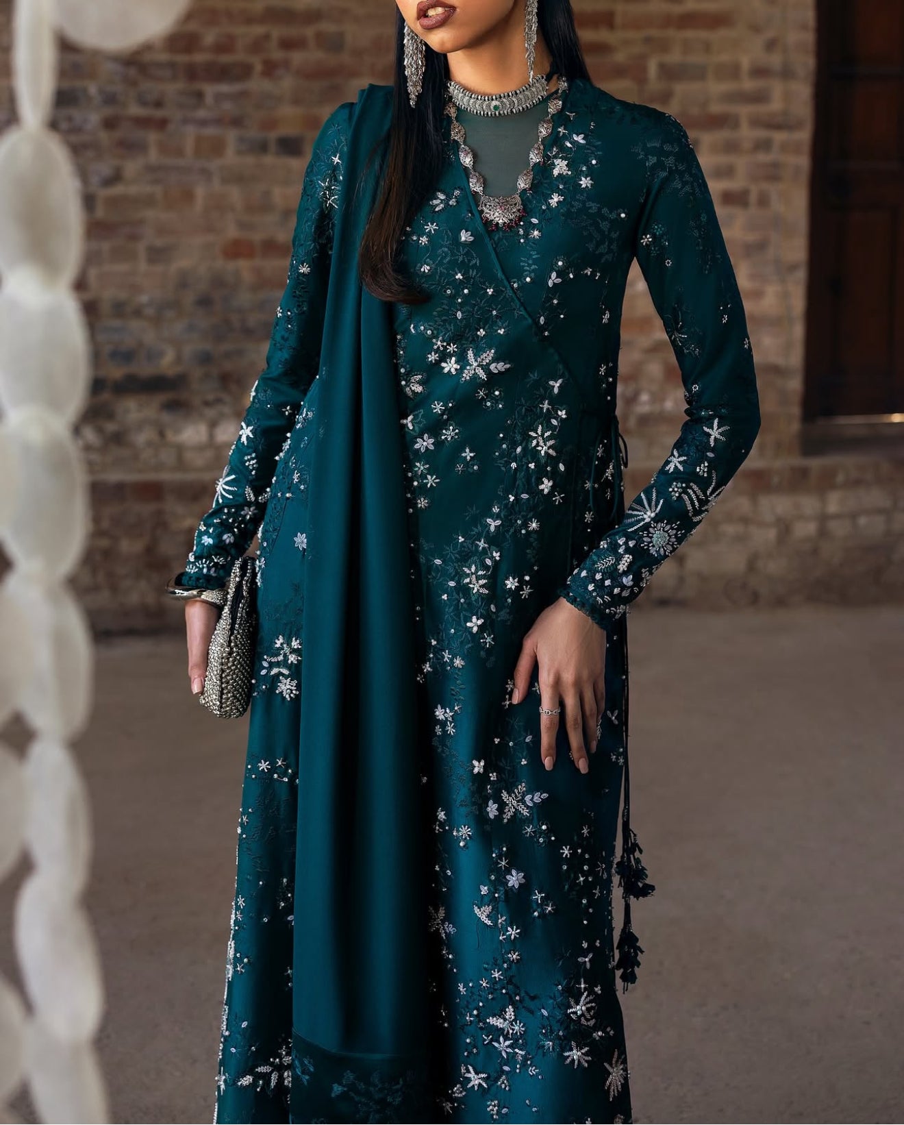 In a gorgeous dark green. Solara features a silk angrakha-style shirt with a tasseled tie at the side, adorned with intricate floral embroidery and textured finishes. The V-neckline with organza detailing, satin silk-bound sleeves and hem add elegance. Paired with straight silk pants and a chiffon dupatta with satin silk borders and rich embroidery, this ensemble is a statement piece.