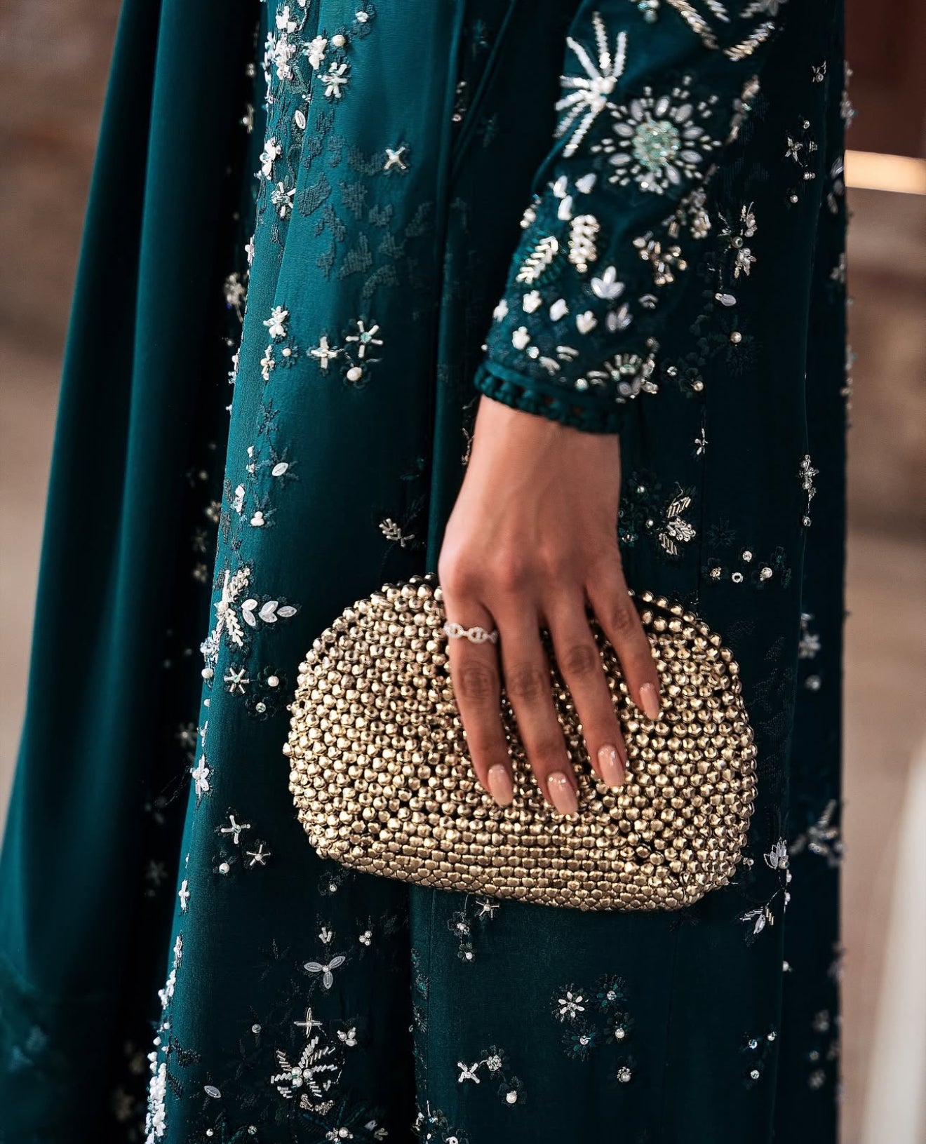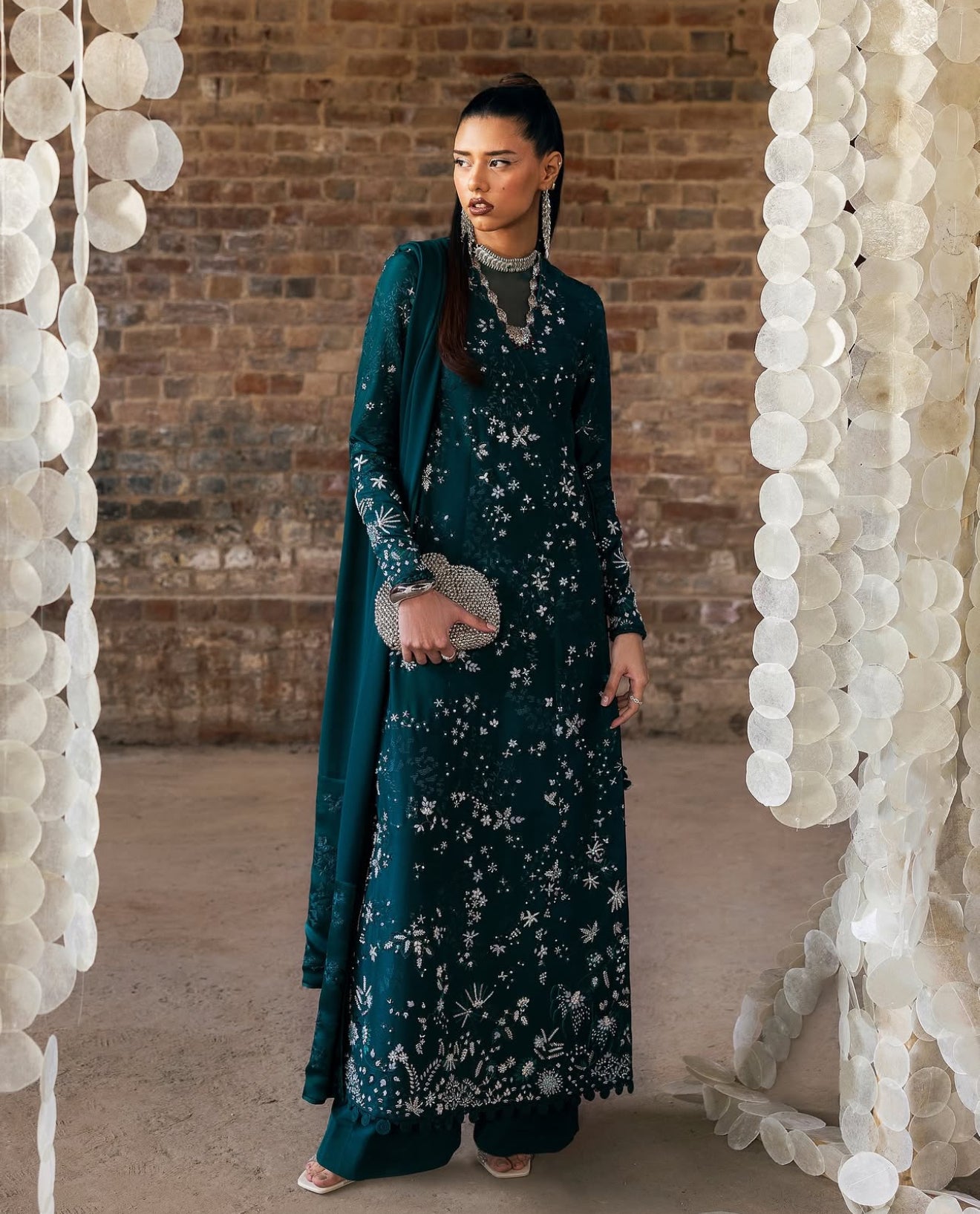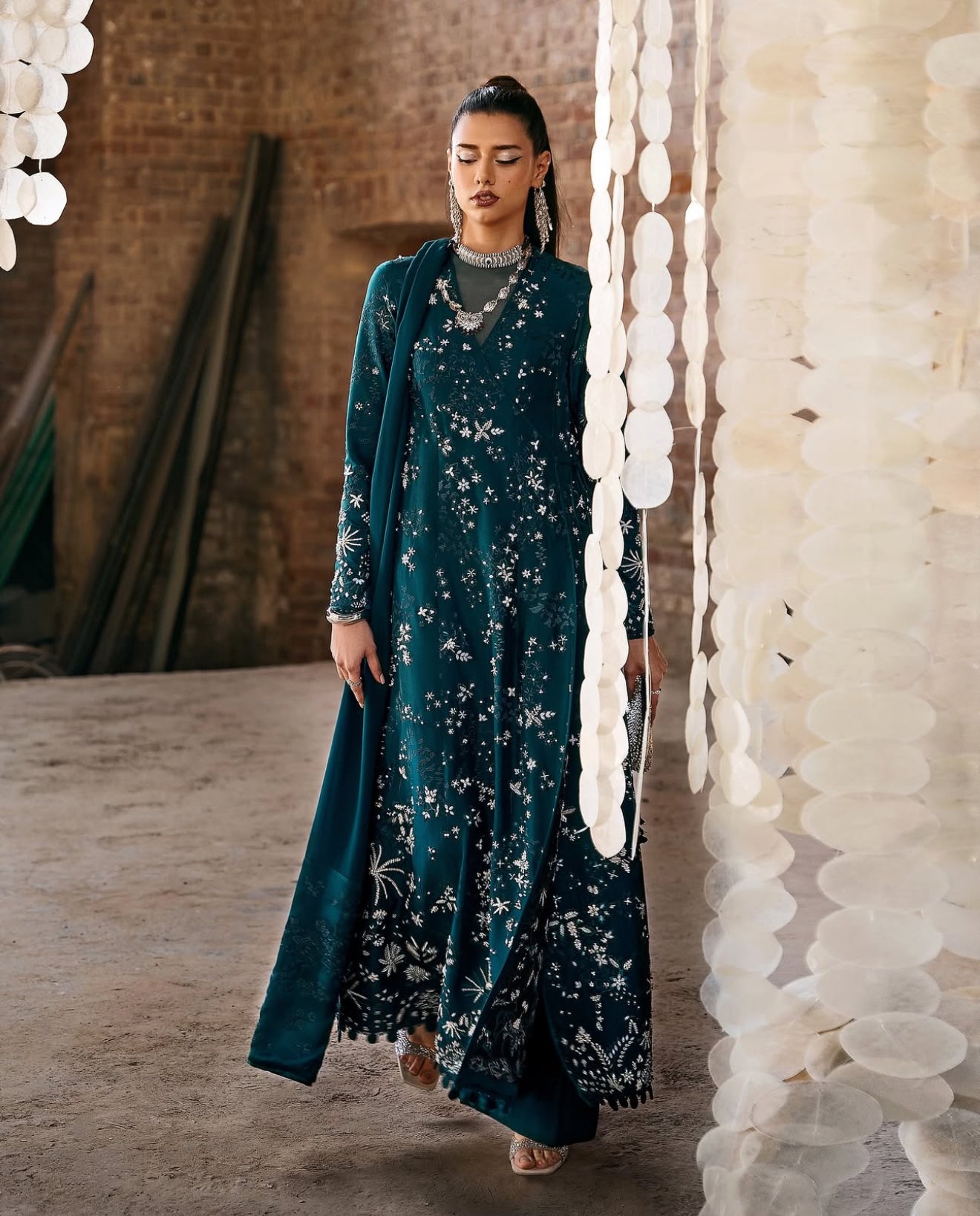 In a gorgeous dark green. Solara features a silk angrakha-style shirt with a tasseled tie at the side, adorned with intricate floral embroidery and textured finishes. The V-neckline with organza detailing, satin silk-bound sleeves and hem add elegance. Paired with straight silk pants and a chiffon dupatta with satin silk borders and rich embroidery, this ensemble is a statement piece.