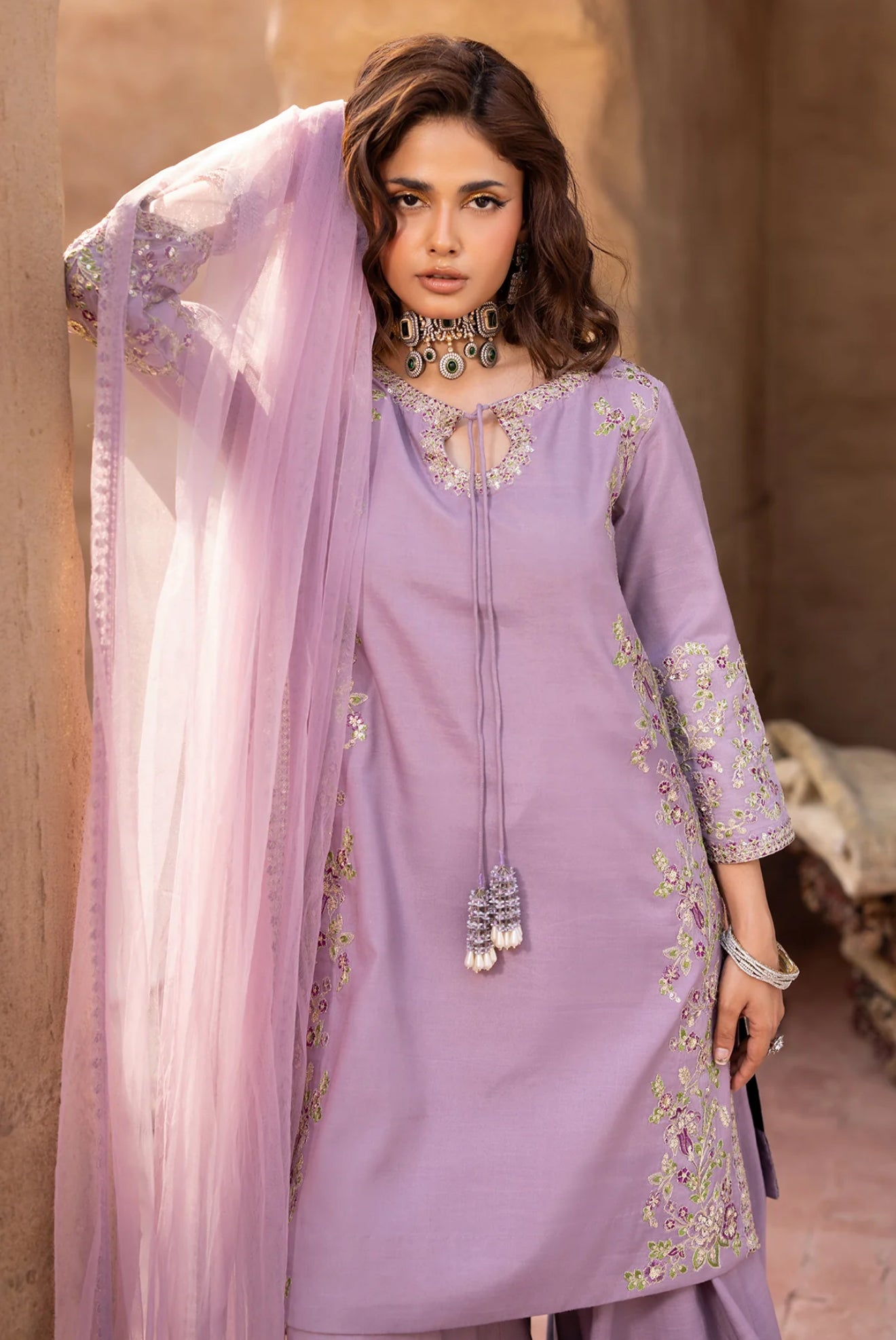 Elevate your wardrobe with the SOPHIA Lilac 3-piece coordinated set, featuring intricate tilla embroidery artfully adorning the sides of the shirt, and borders of the sharara and dupatta. This ensemble blends traditional craftsmanship with contemporary design, delivering a harmonious and elegant look. The detailed tilla work adds subtle shimmer and texture, enhancing each piece while ensuring a cohesive aesthetic throughout the set. Perfect for special occasions, this set offers refined sophistication with comfortable wearability.
