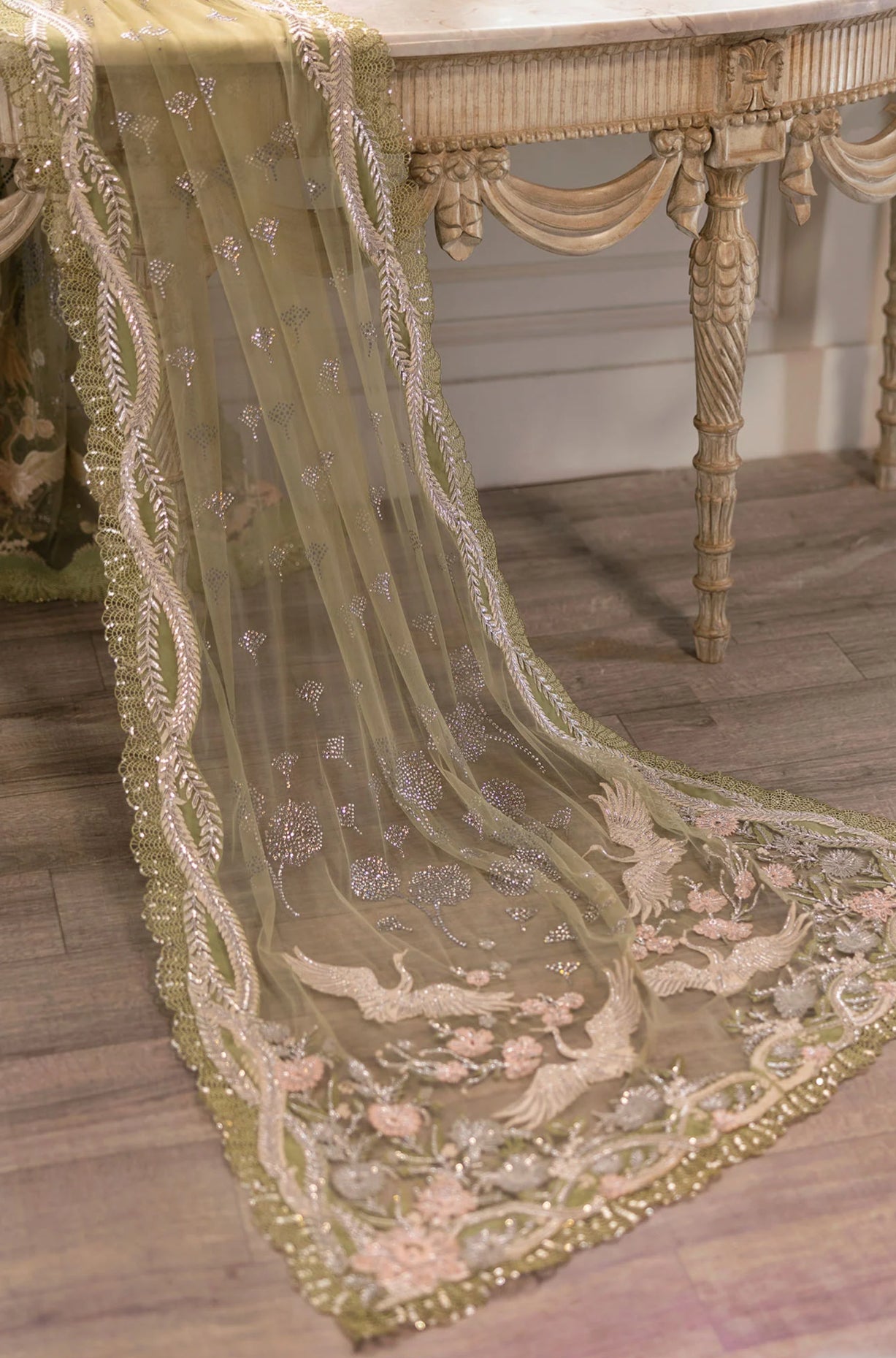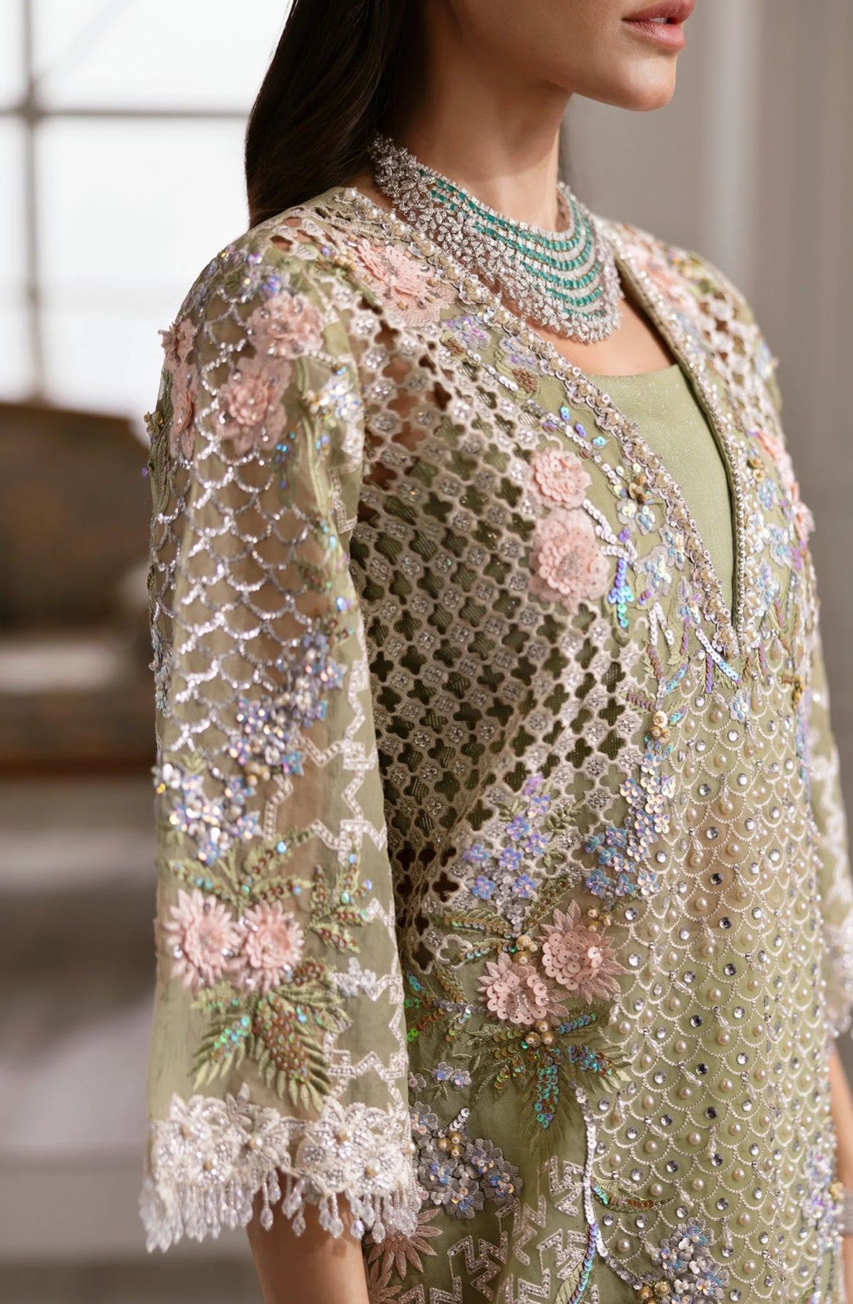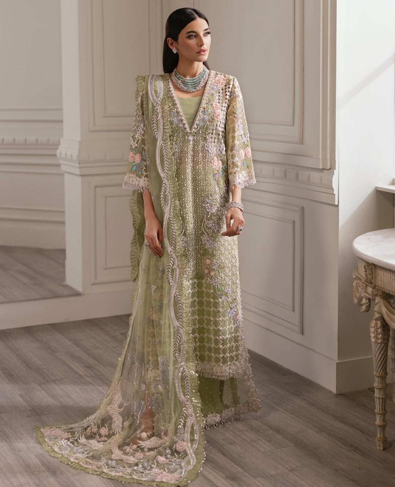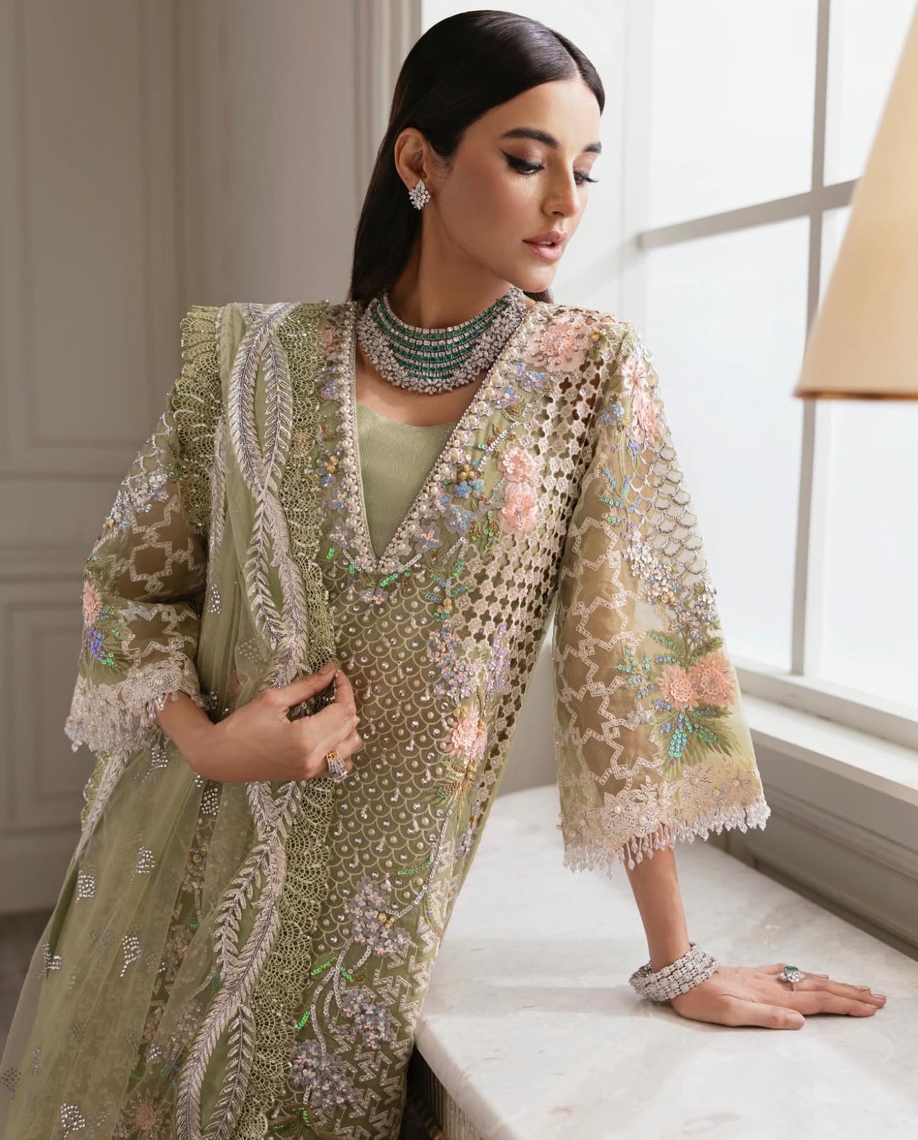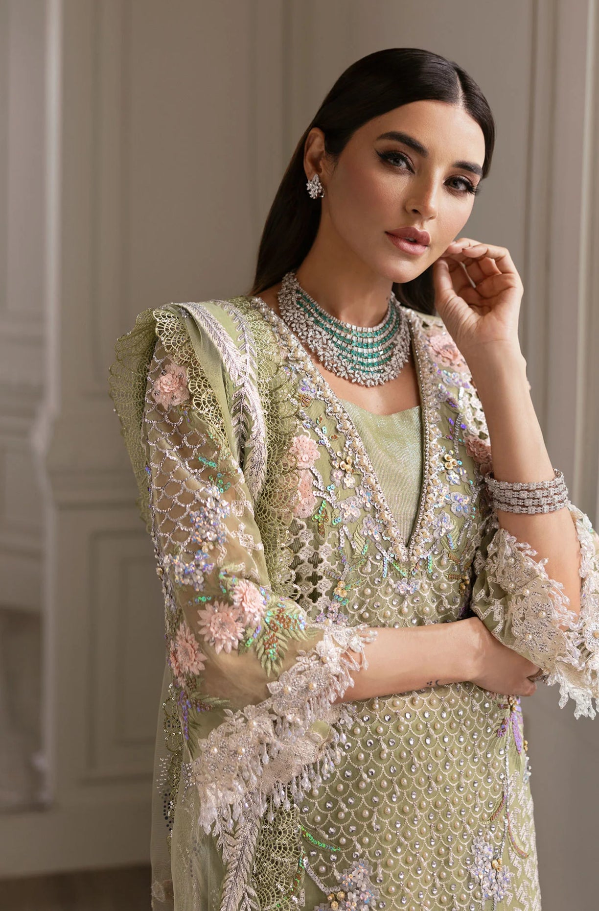 The most beautiful pistachio green with glamorous cutwork all over the front outlined meticulously with very fine handwork. The embellishments on this one are very modern - swarovskis, matte French sequins, micropearls and tiny crystals. The shirt has enough fabric to be stitched into a two layer kaftan like Sadia is wearing.The entire dupatta comes pre-patched by hand and is adorned with hand-done crystal mukaish motifs shaped like flying flowers. The pallus feature the most stunning sceneries in signature Crimson Style.