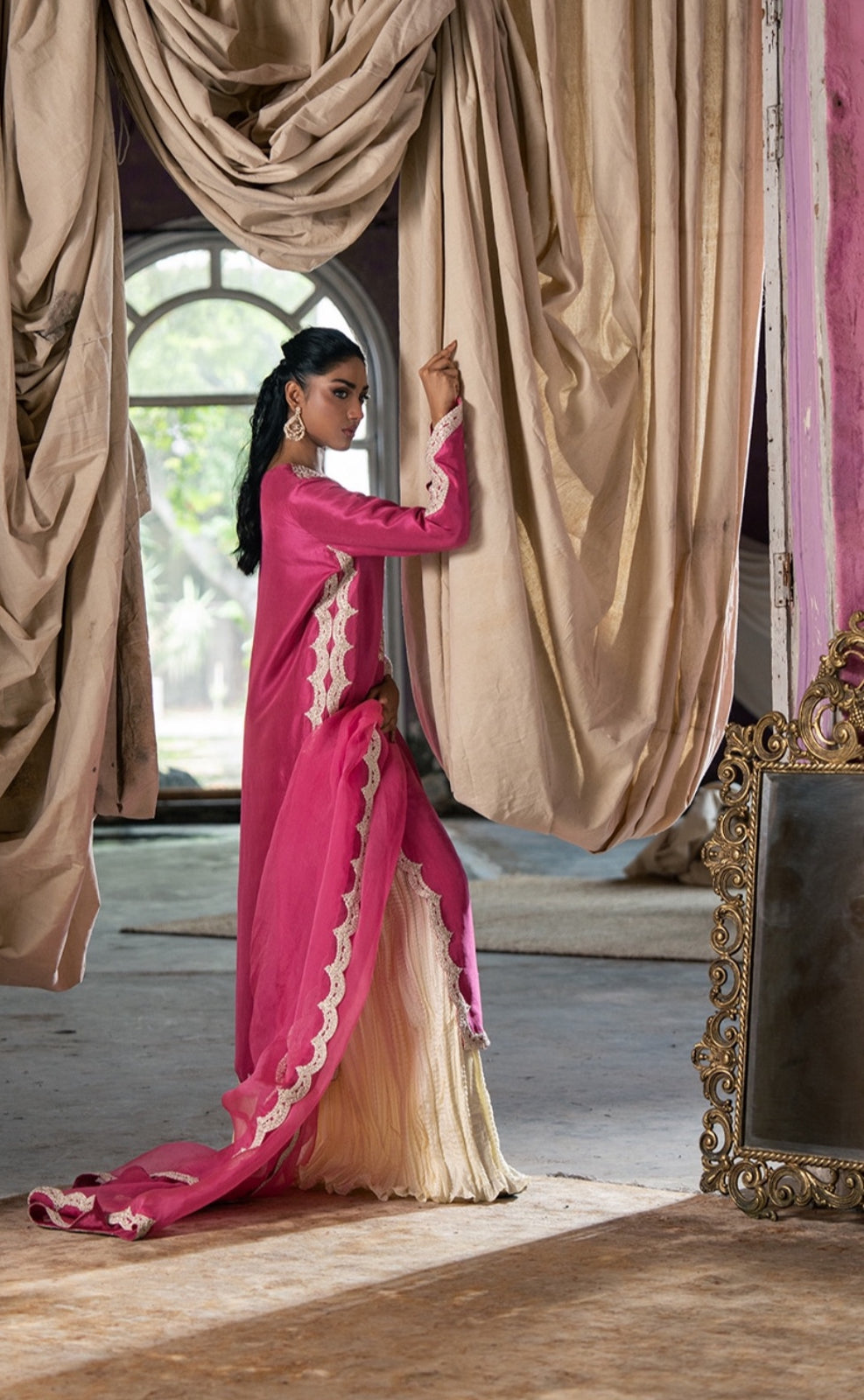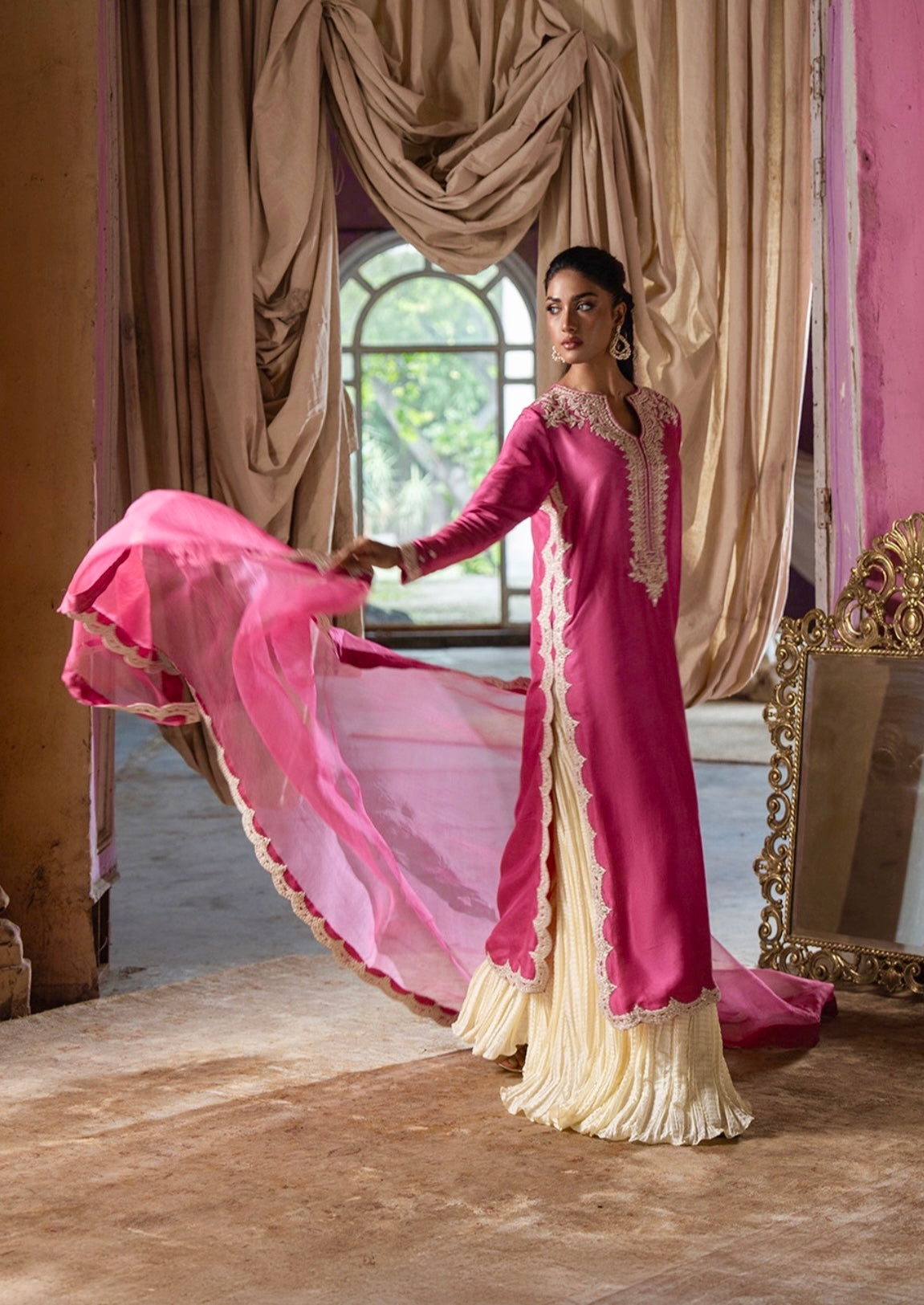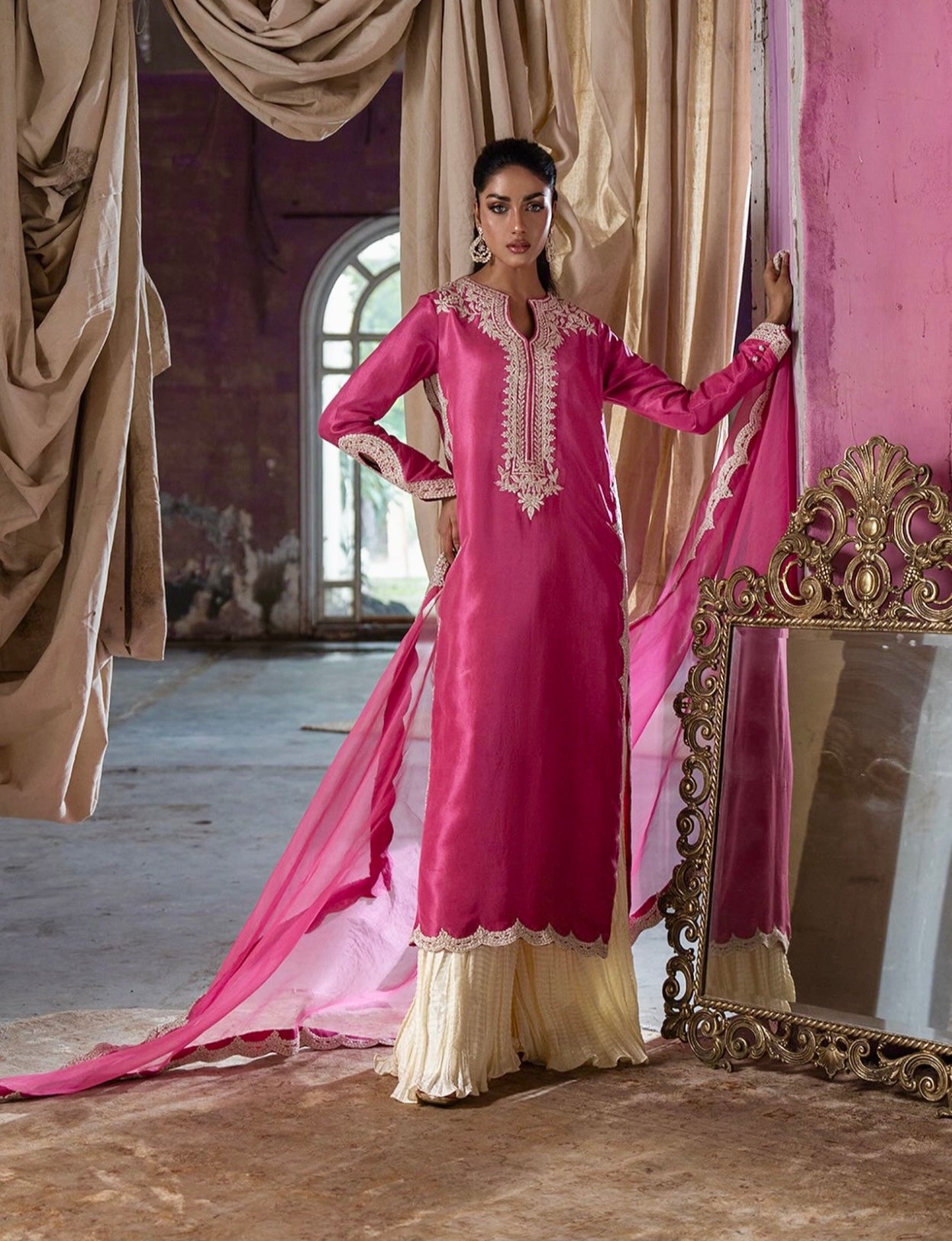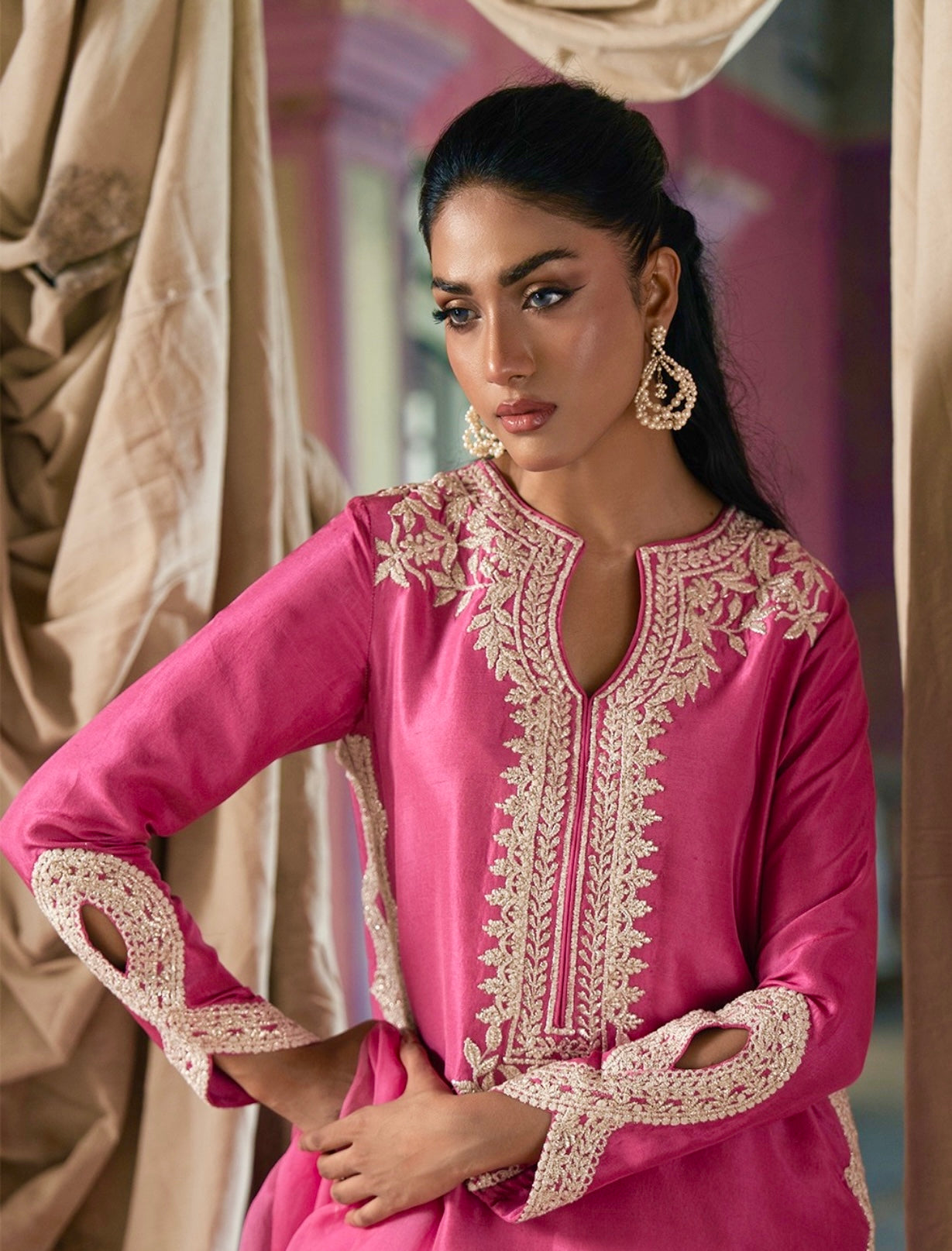 Cut from korean raw silk in the prettiest shade of pink this outfit is a timeless piece. With sharara like subtle shimmery cream embroidery on the neckline, sleeves and all around the sides of the shirt, the silhouette is super flattering. Paired with crushed pants for added glamour. The pure organza dupatta has embroidery on all four sides.