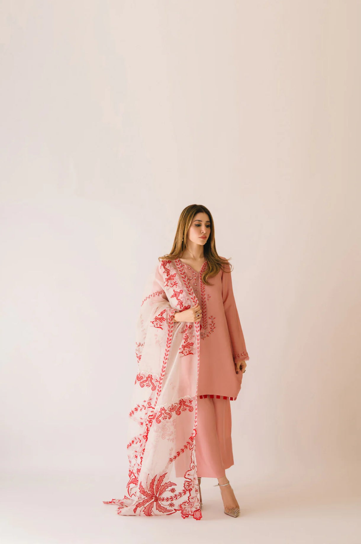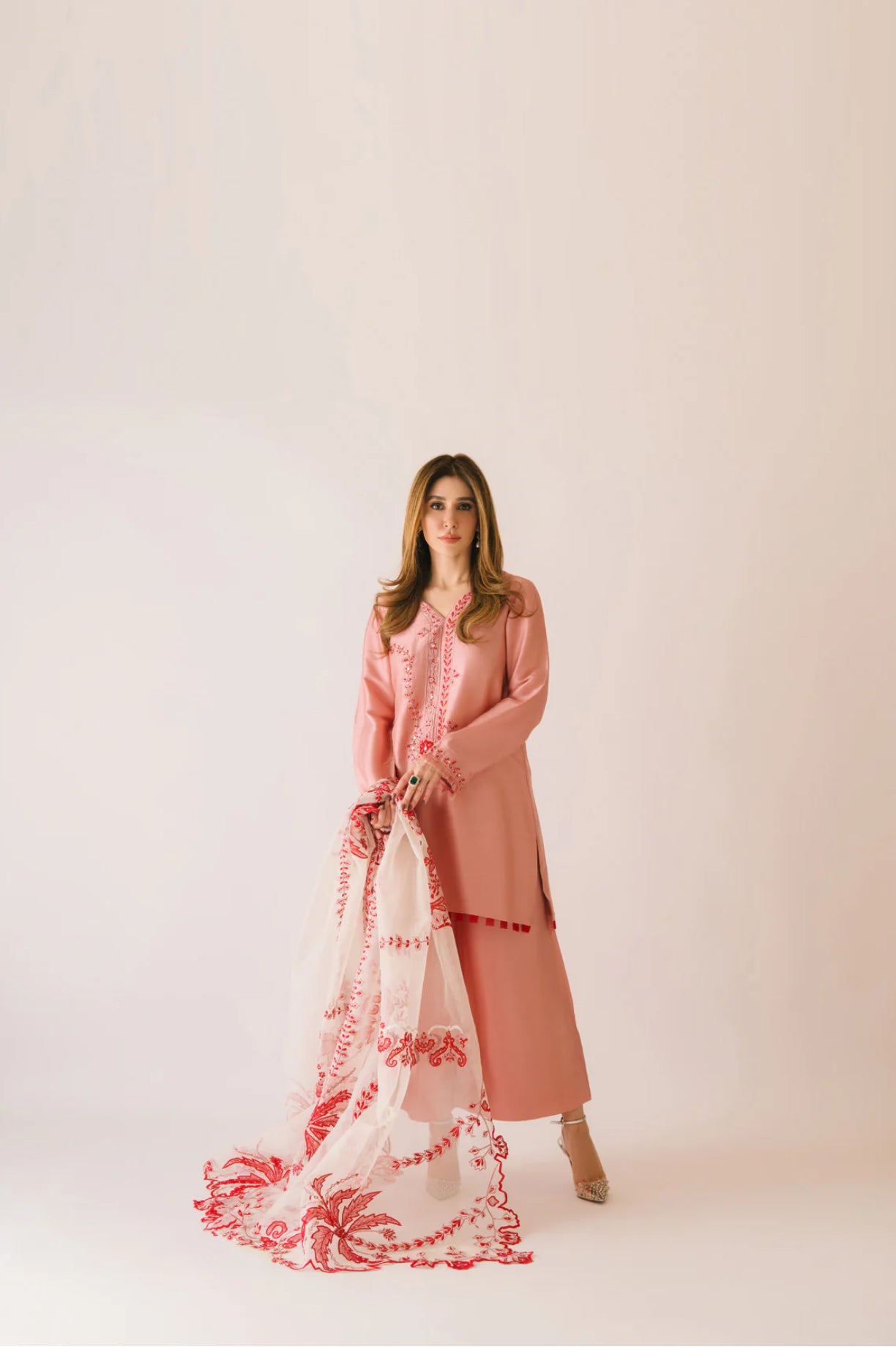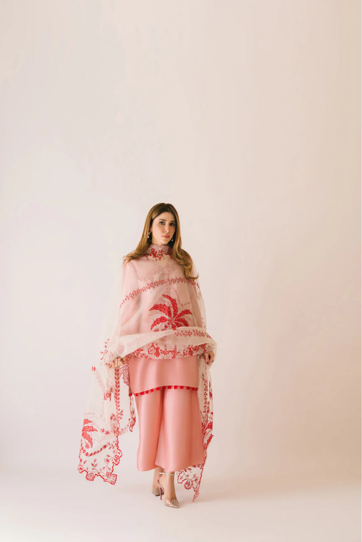Pure sheesha silk shirt with mirror work, thread work and appliqué work. Finished with organza daaman detailing. Thread detailing on sleeves. Paired with short pure sheesha culottes . Pure organza dupatta with appliqué work, thread work and sequins spray all over .