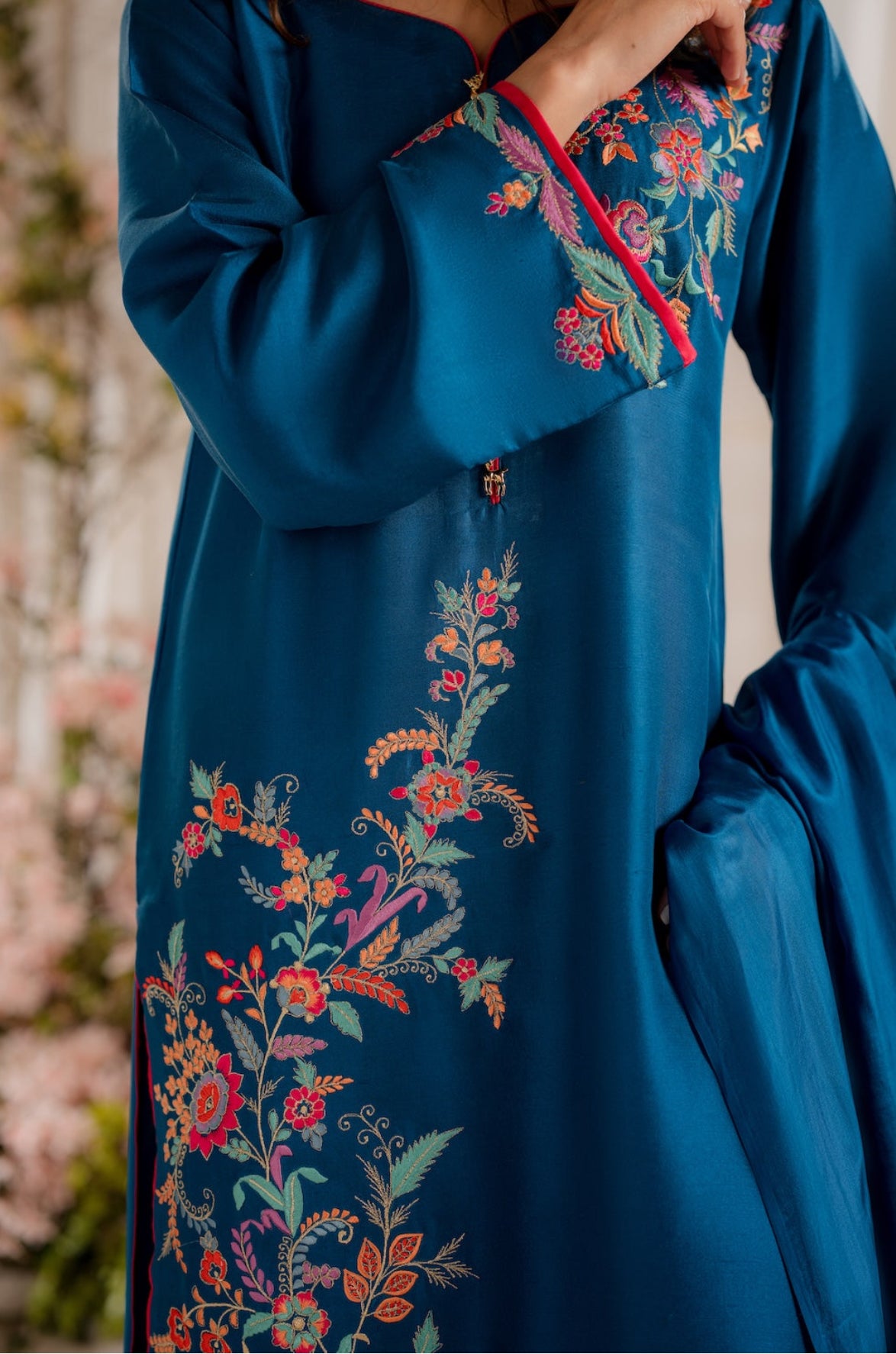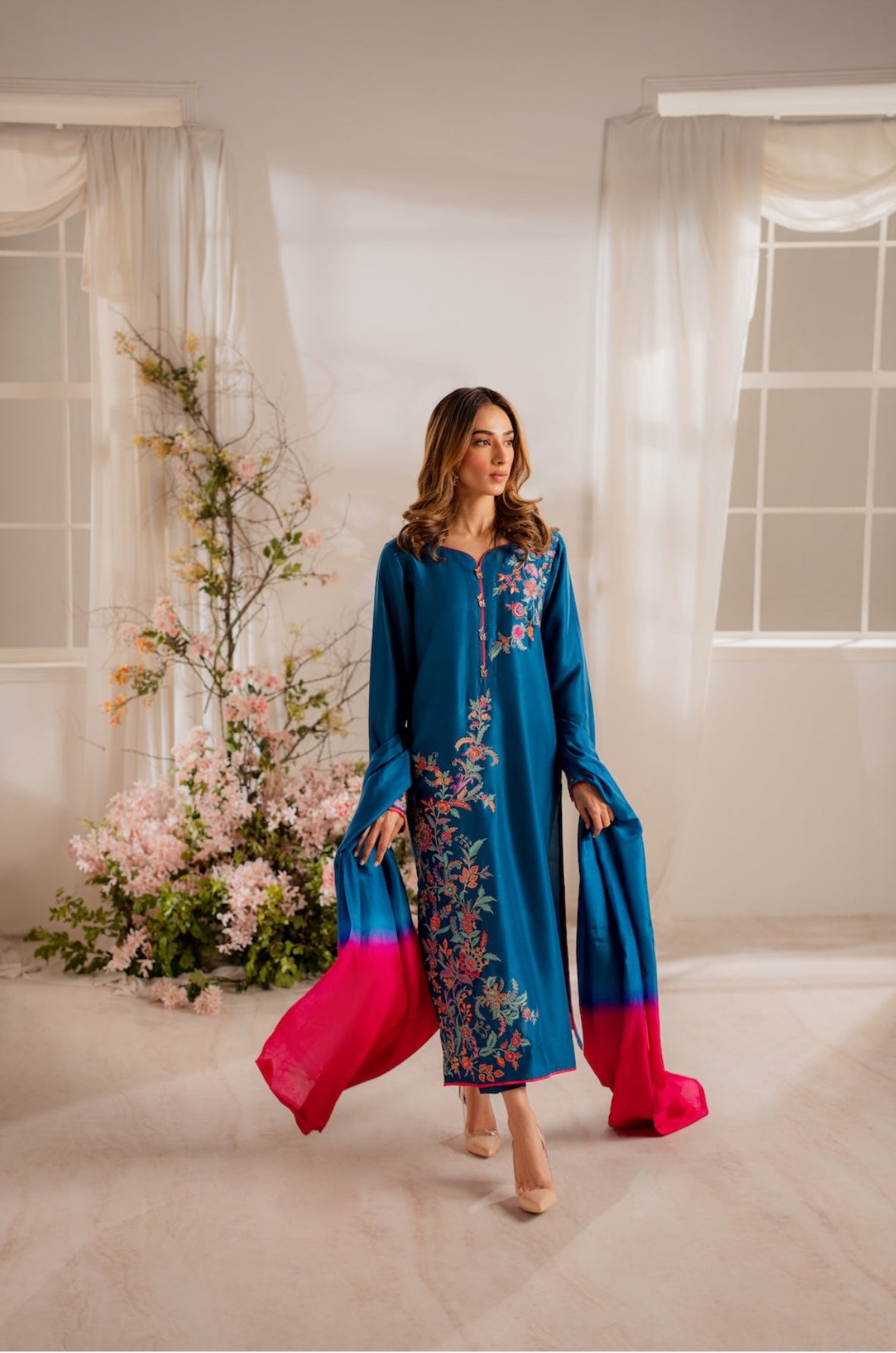Presented in a captivating shade of haute blue, this ensemble showcases exquisite embroideries in soft, subtle variations, meticulously crafted with fine threadwork and enhanced with shimmering gold accents. The graceful top-down design, adorned with whimsical floral motifs that gently flow across the pure silk fabric, exudes a refined femininity, elevating the outfit with elegance in every detail. This look radiates an enduring charm that transcends time. Paired with Silk dupatta.