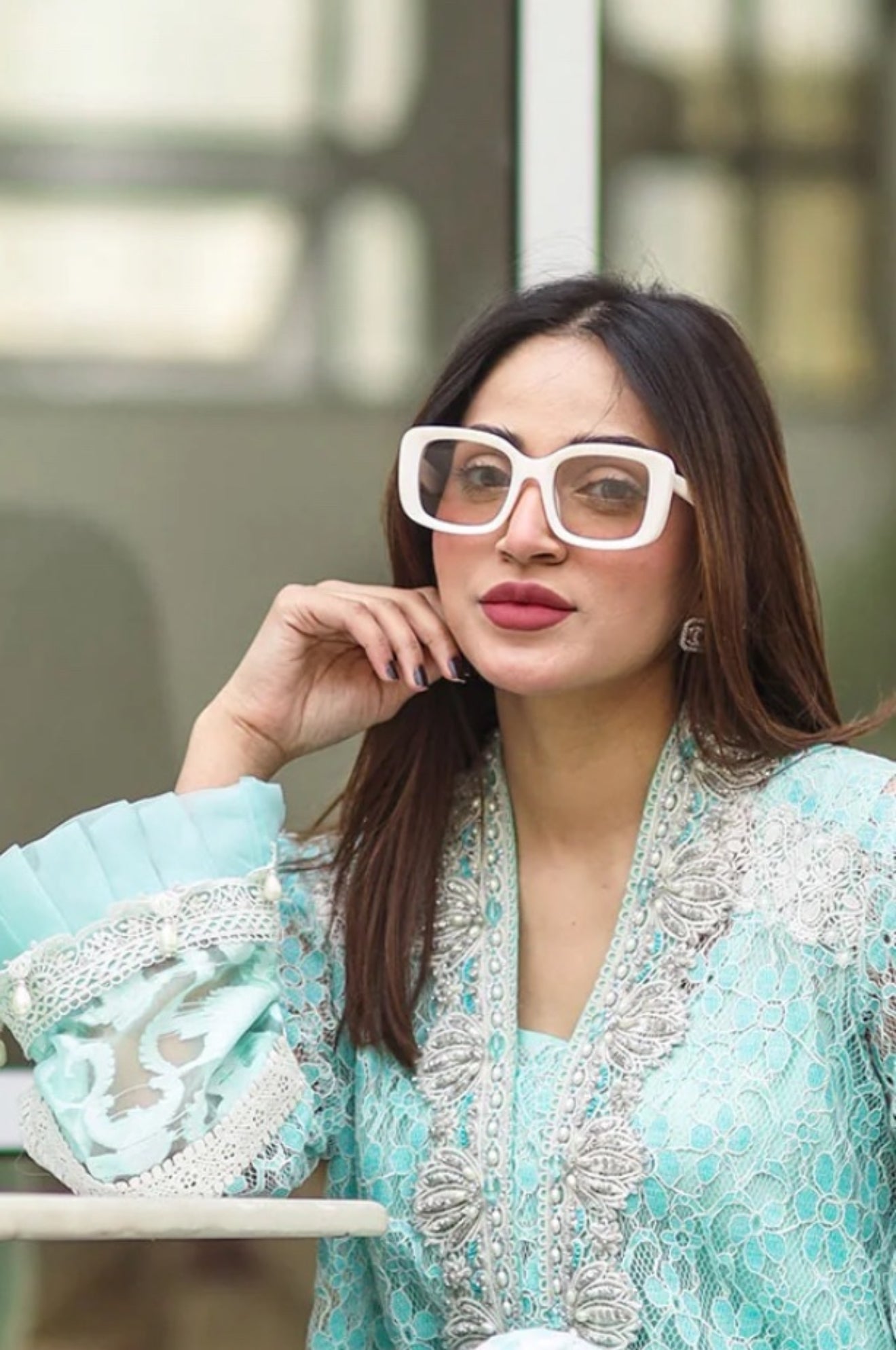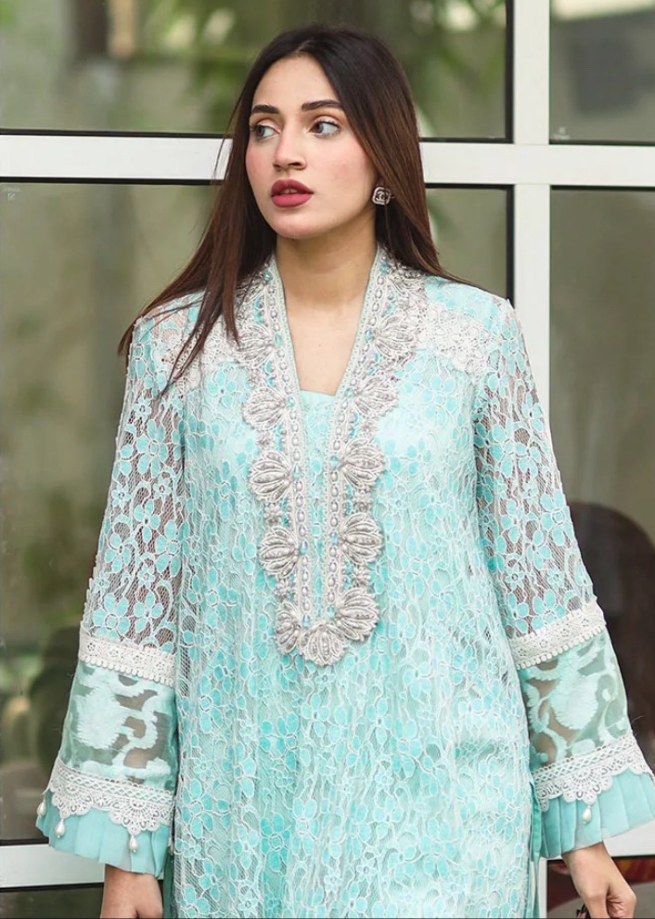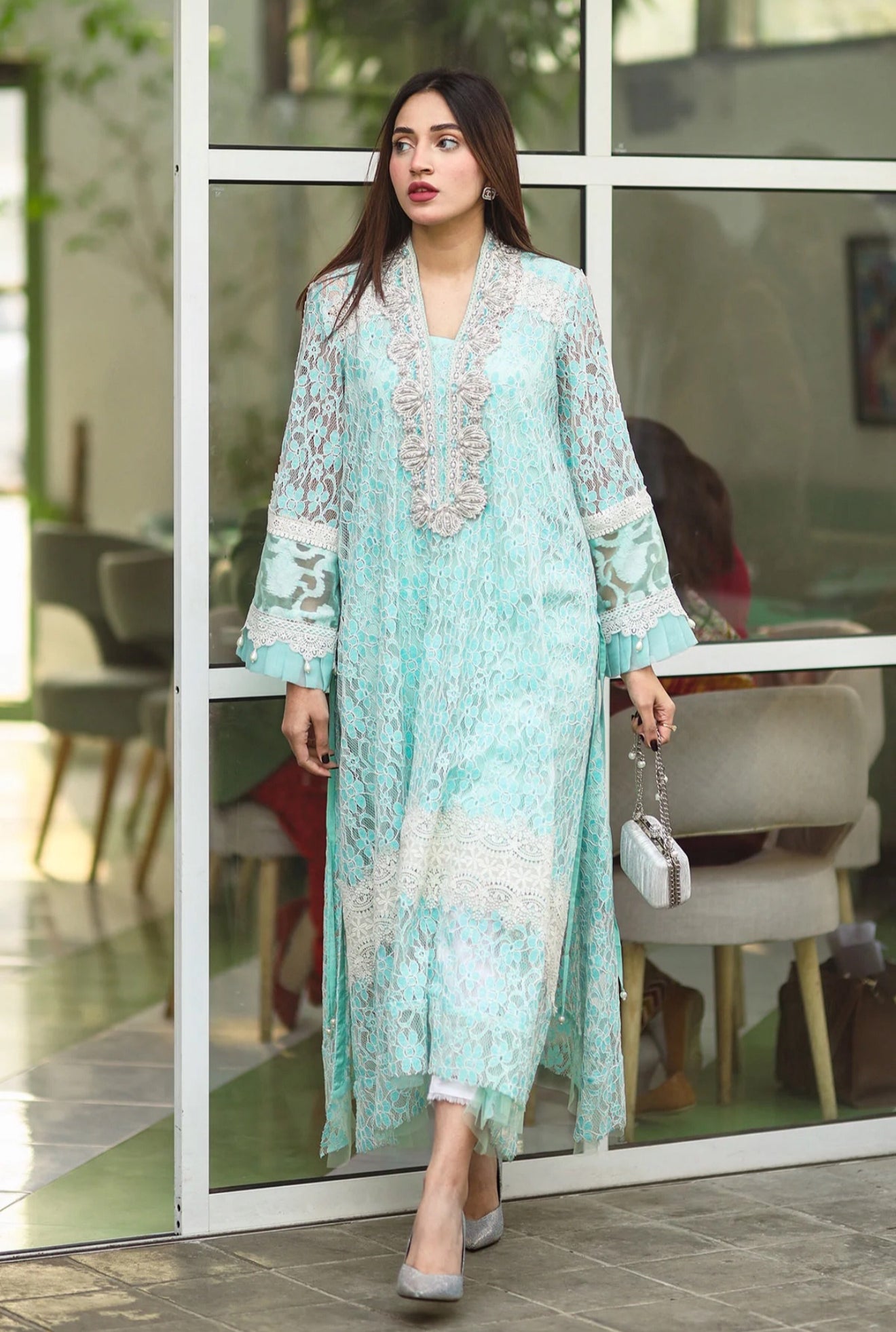 A stunning, flowy Aqua lace kaftan with a mix of fabrics and textures, decorated with a variety of laces. The neckline is delicately hand embellished with beads, crystals and pearls along with pleated details on the sleeves. The hemline is finished off with layered raw net and lace. Perfect to welcome spring and all upcoming festivities!