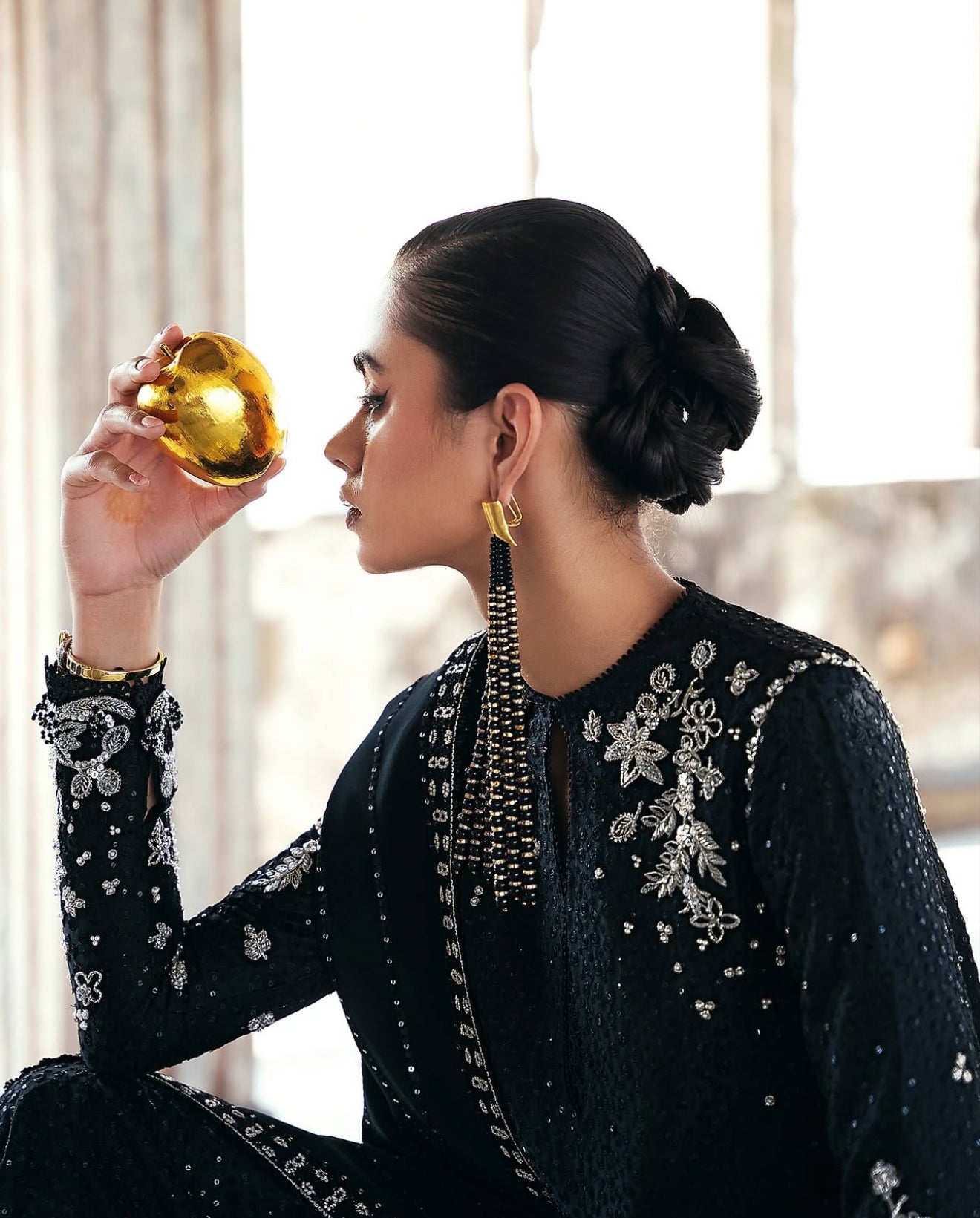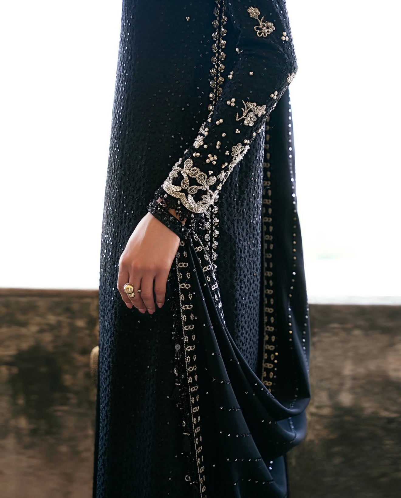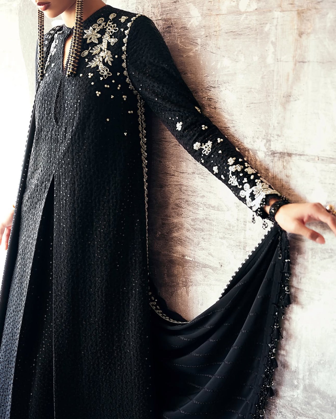 Step into elegance with our Midnight Black three-piece ensemble. The A-line silk shirt features a box pleat, keyhole neckline, and fitted sleeves with embroidery that climbs the arm. Contrasting threadwork highlights the textured fabric, while tasseled sleeves add charm. Paired with sleek silk cigarette pants and a grip dupatta featuring intricate embroidery and a claw detail at the wrist, this look is perfect for any occasion.