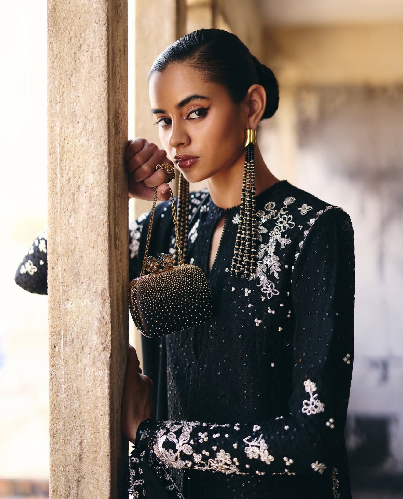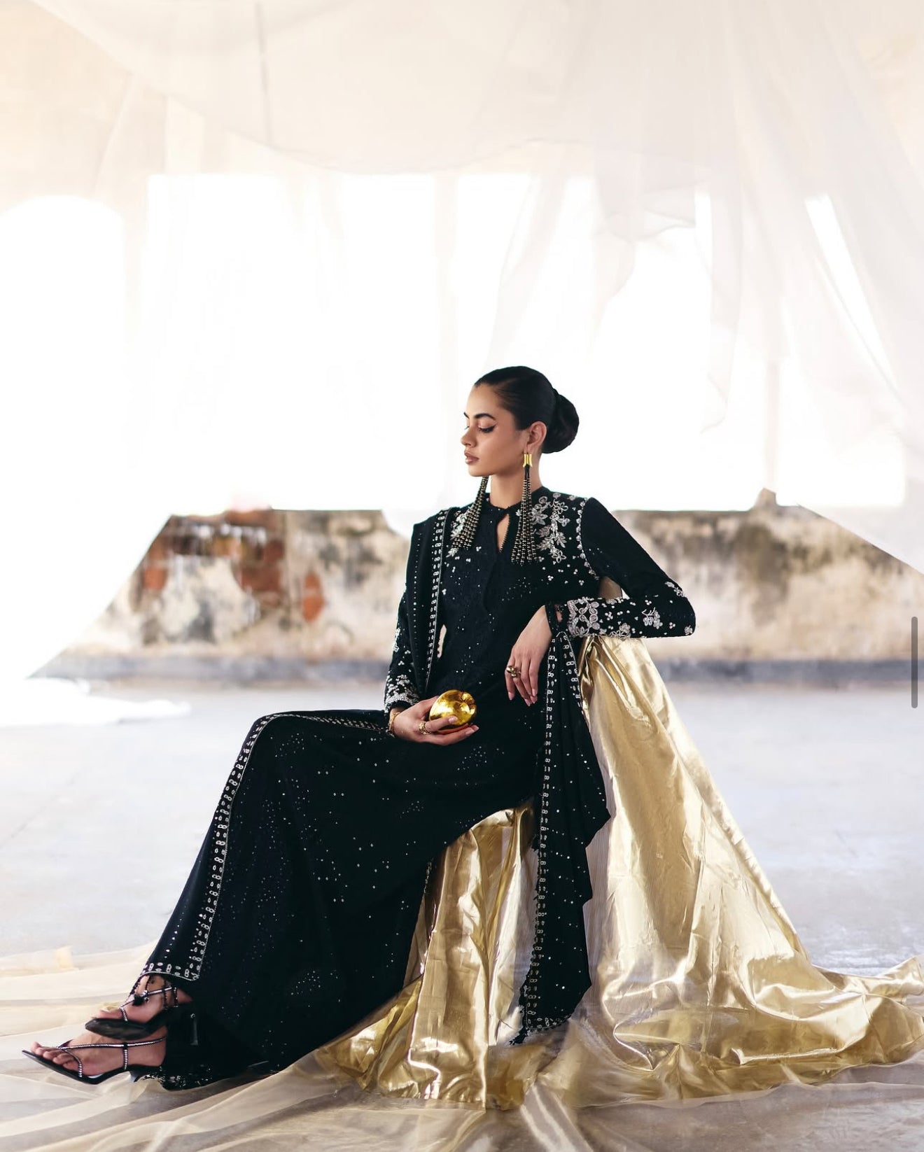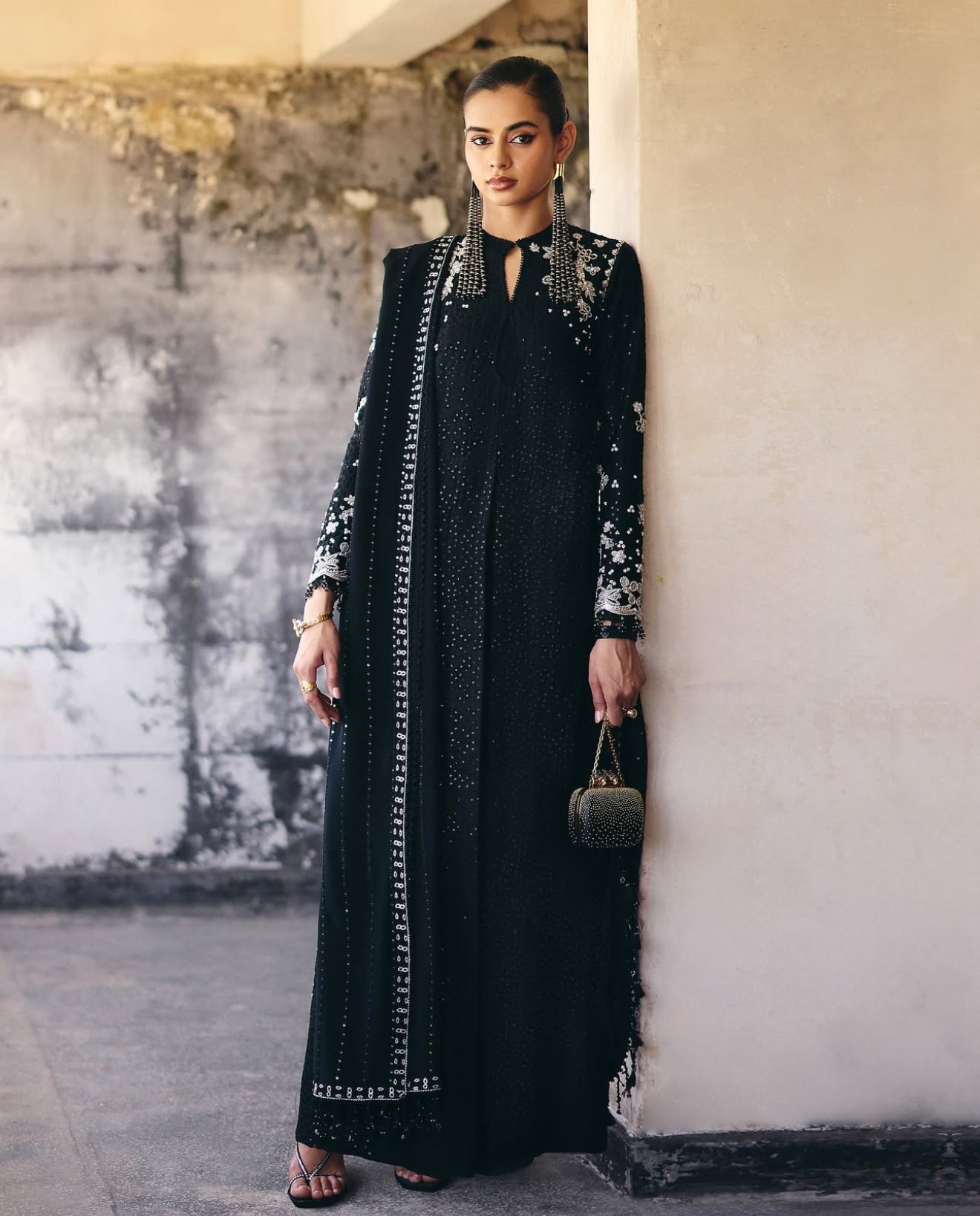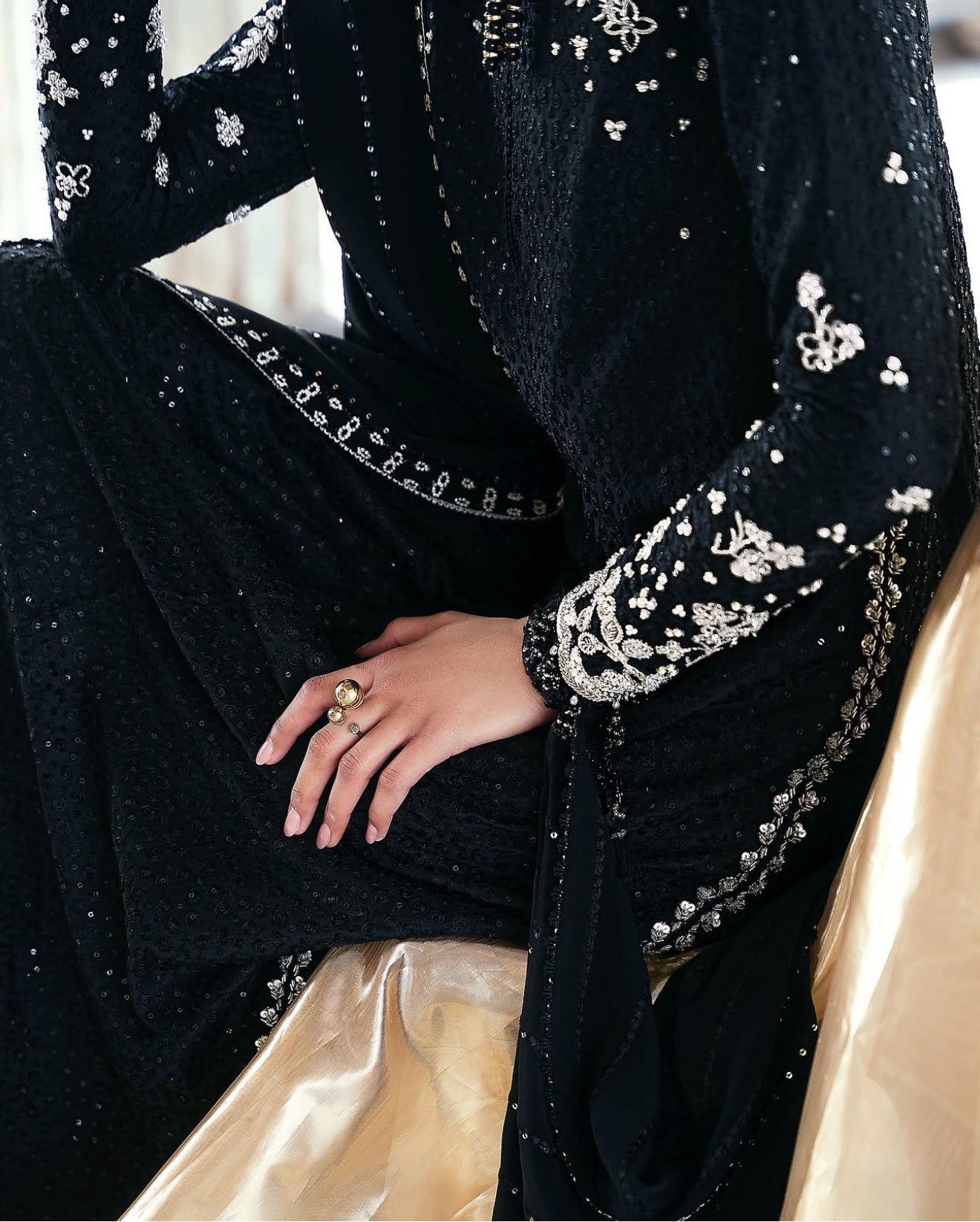 Step into elegance with our Midnight Black three-piece ensemble. The A-line silk shirt features a box pleat, keyhole neckline, and fitted sleeves with embroidery that climbs the arm. Contrasting threadwork highlights the textured fabric, while tasseled sleeves add charm. Paired with sleek silk cigarette pants and a grip dupatta featuring intricate embroidery and a claw detail at the wrist, this look is perfect for any occasion.